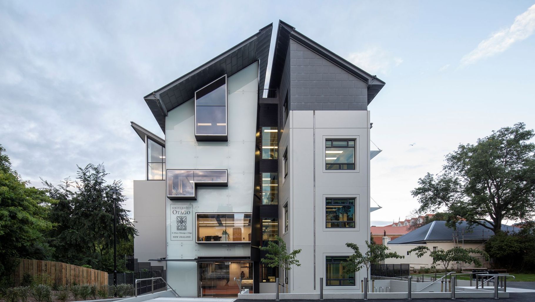 ArchiPro Project Summary - Redevelopment of St David II building at the University of Otago, featuring seismic upgrades, a new entrance, and an open-plan office layout that enhances functionality and campus identity.