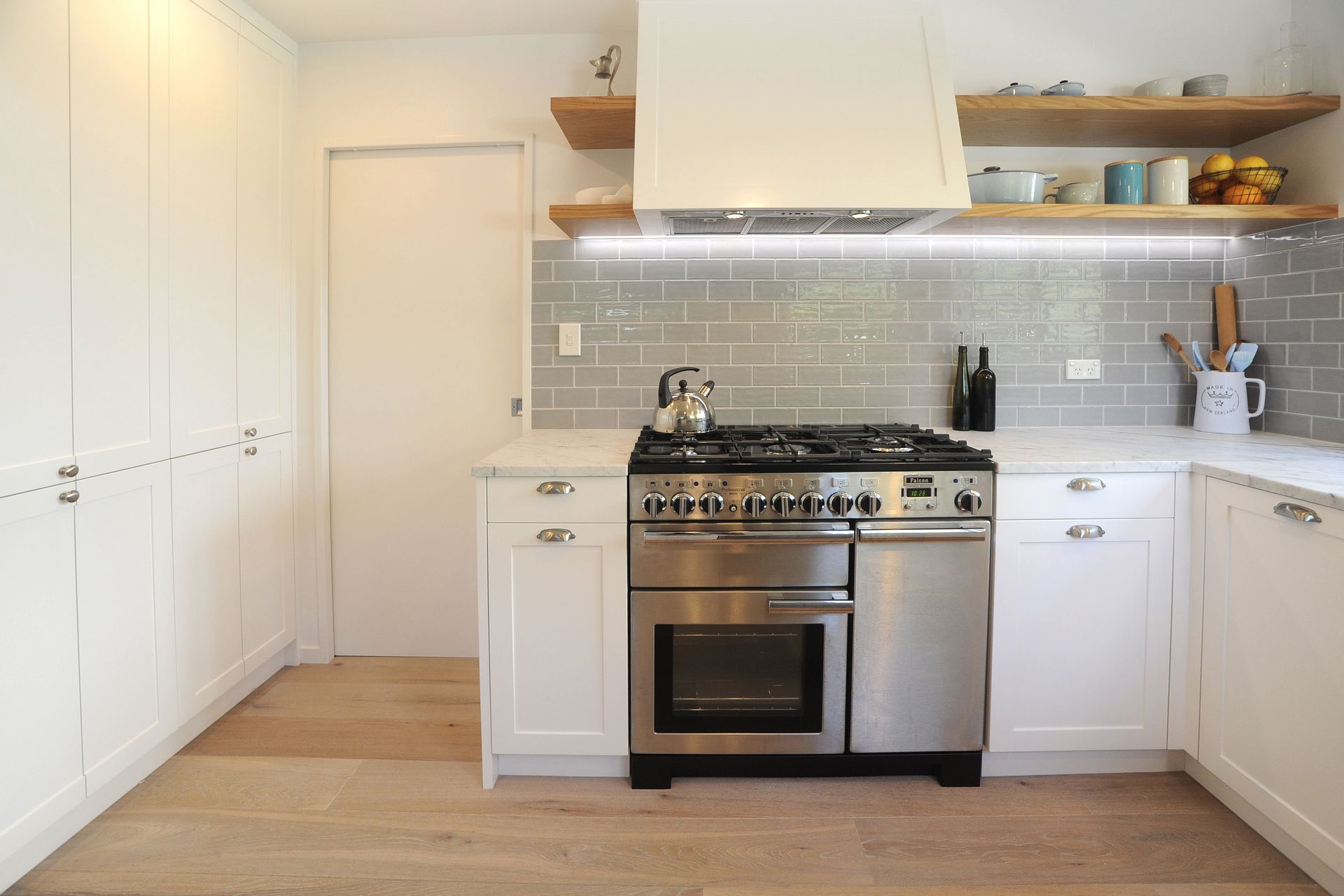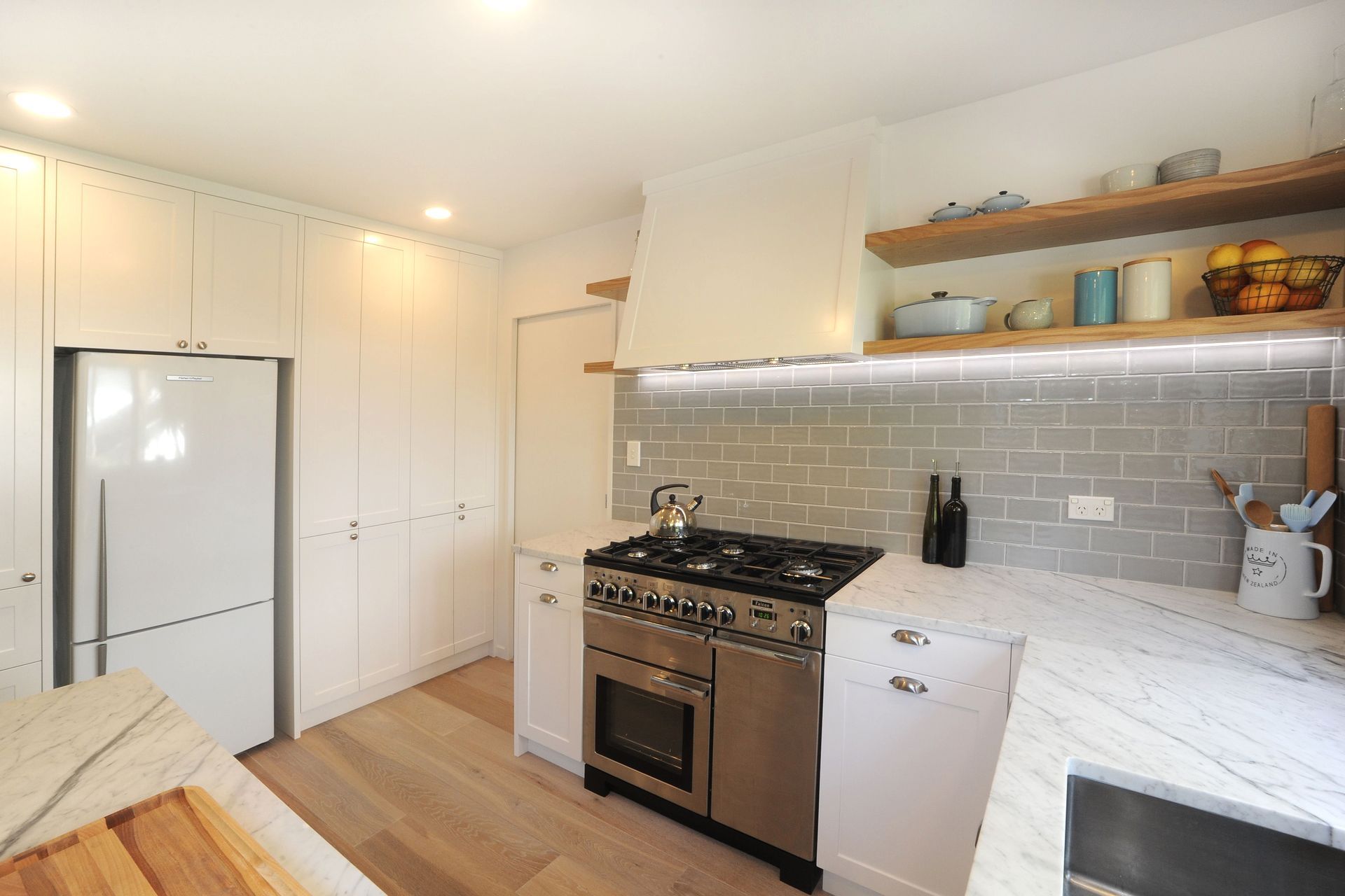 ArchiPro Project Summary - Transformation of a 90's townhouse kitchen into a modern shaker style family kitchen featuring clever design, natural materials, and quality appliances.