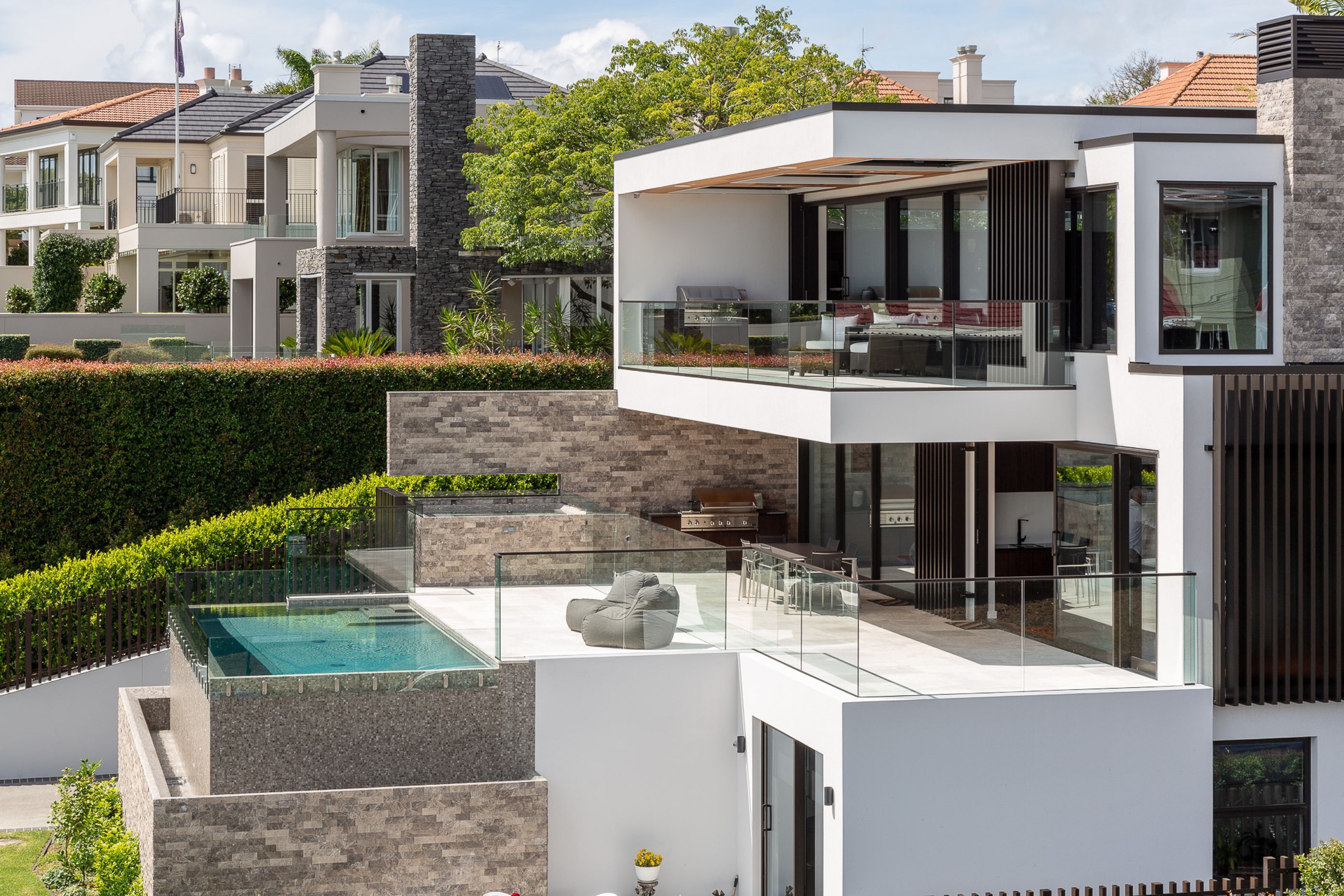 ArchiPro Project Summary - Elevated modern family home in St Heliers Bay, featuring stunning Hauraki Gulf views, a seamless infinity-edge pool, and a blend of crisp white design with natural stone elements for a resort-style living experience.