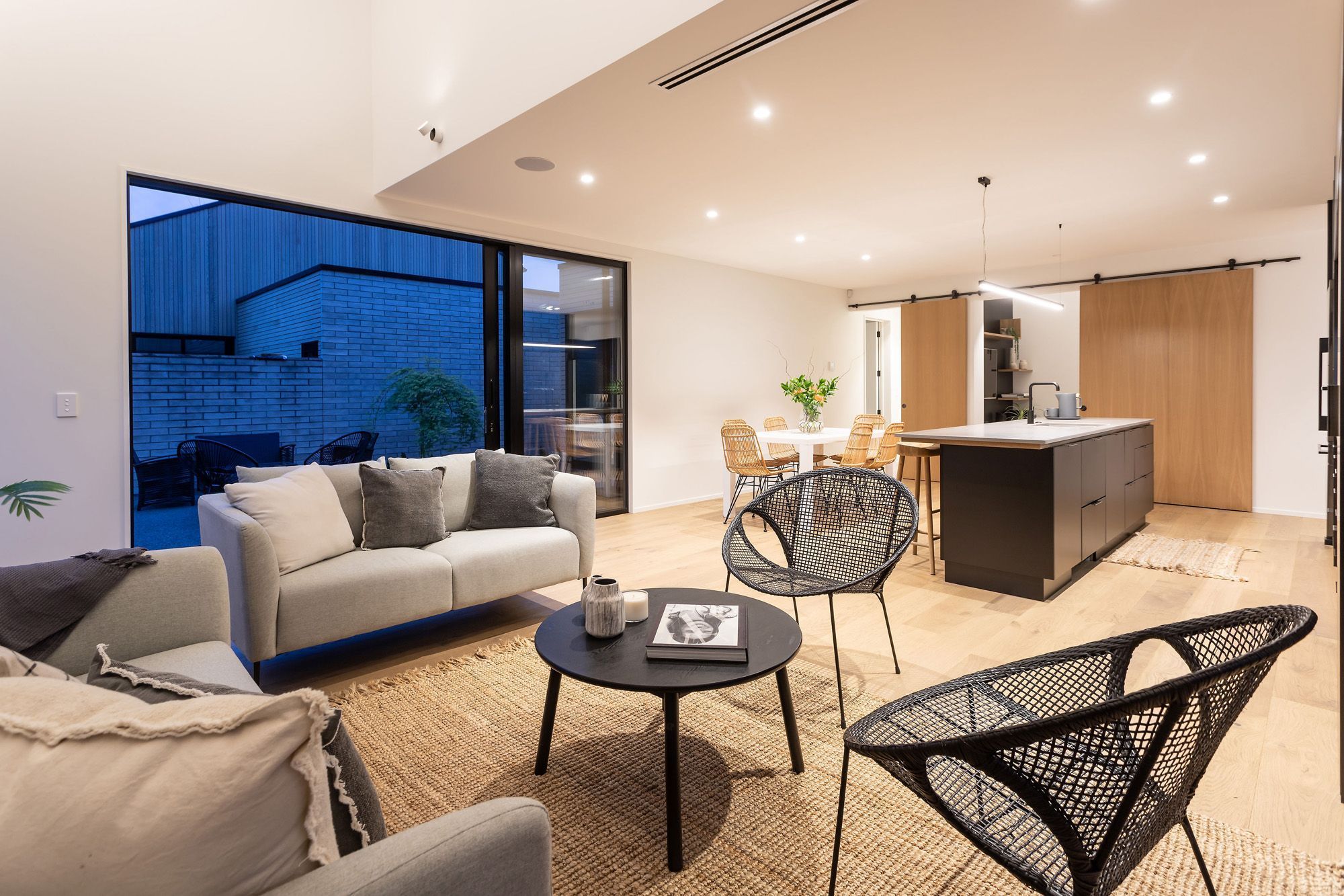 ArchiPro Project Summary - Two contemporary townhouses in Papanui, featuring modern design elements, high-quality finishes, and seamless indoor-outdoor living, all while prioritizing comfort and privacy.