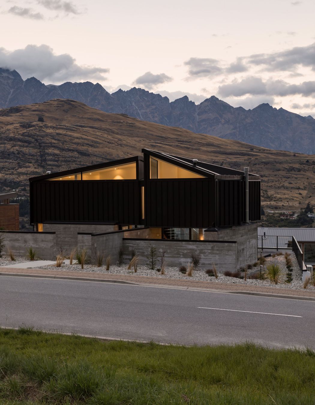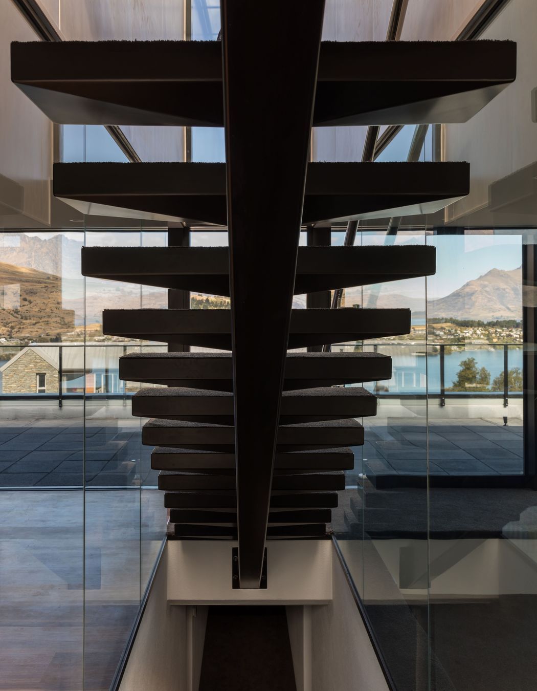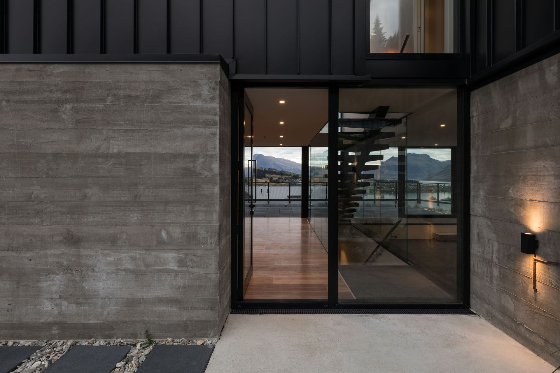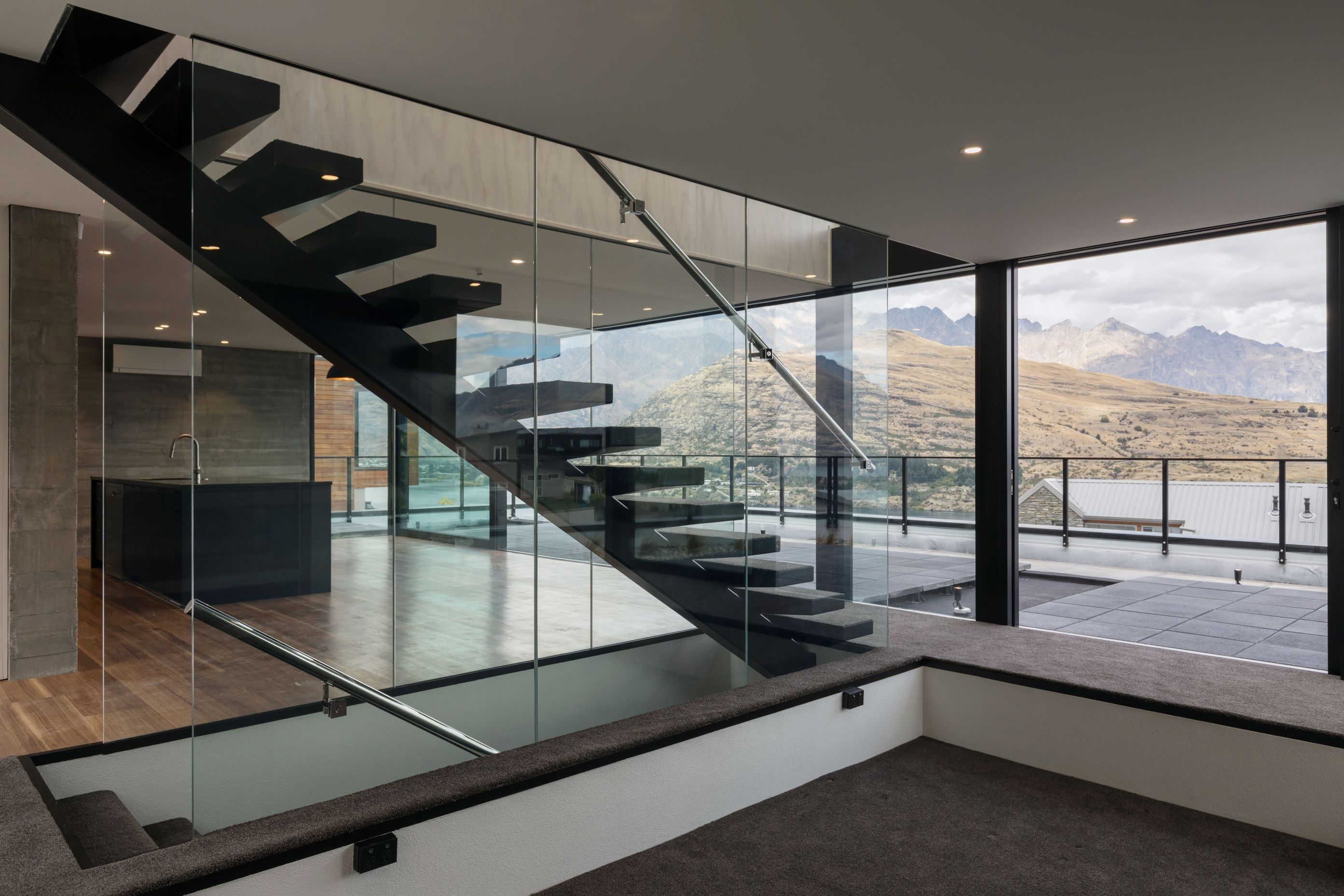 ArchiPro Project Summary - A stunning new build in Queenstown, harmonizing with breathtaking views of The Remarkables and Lake Wakatipu, featuring a unique design with functional spaces, a sunken lounge, and a striking glazed staircase.