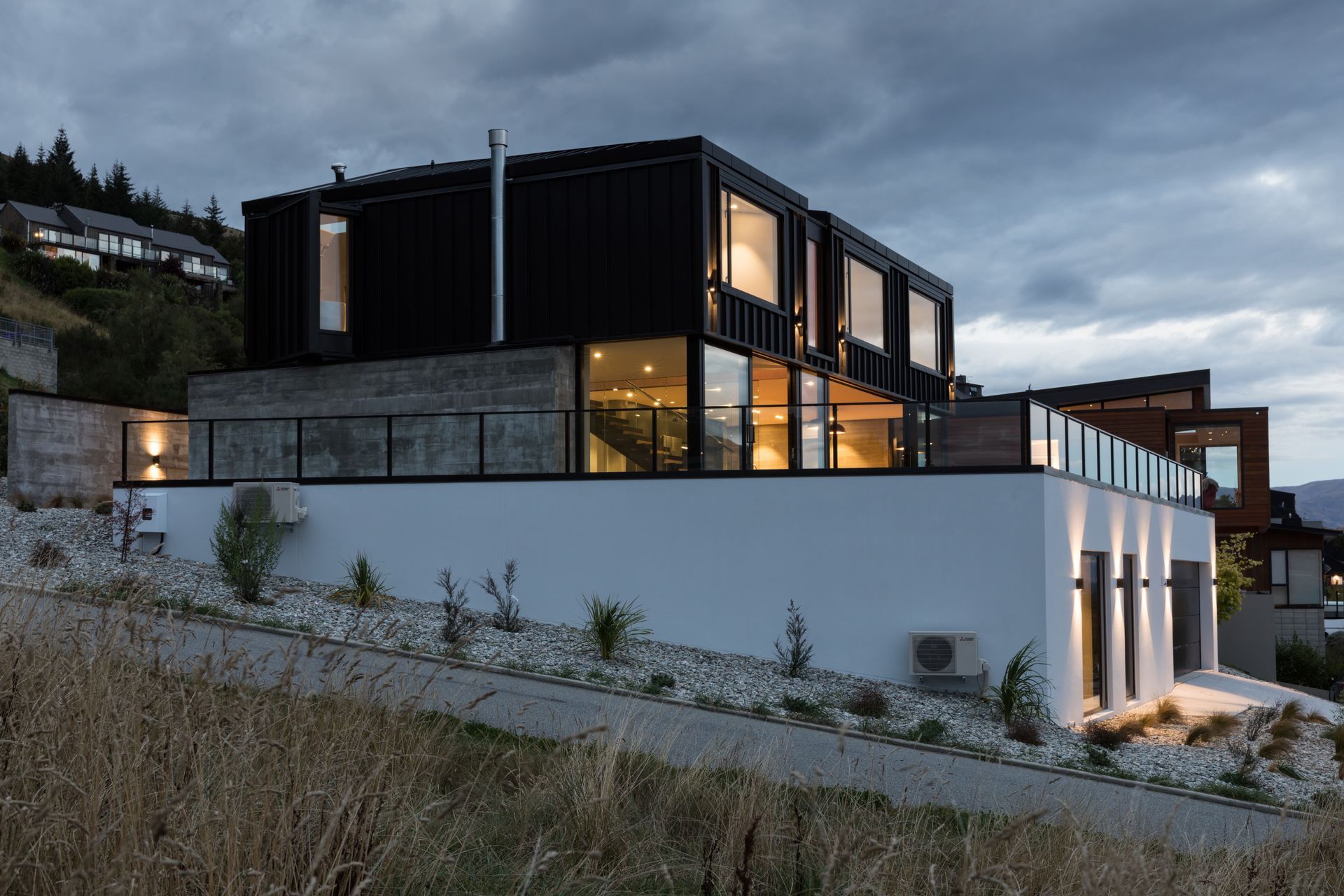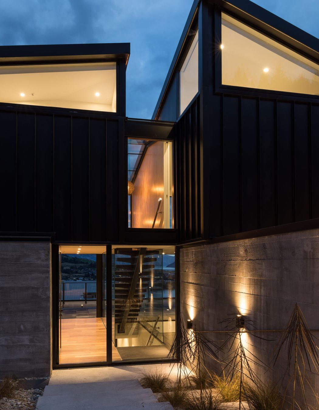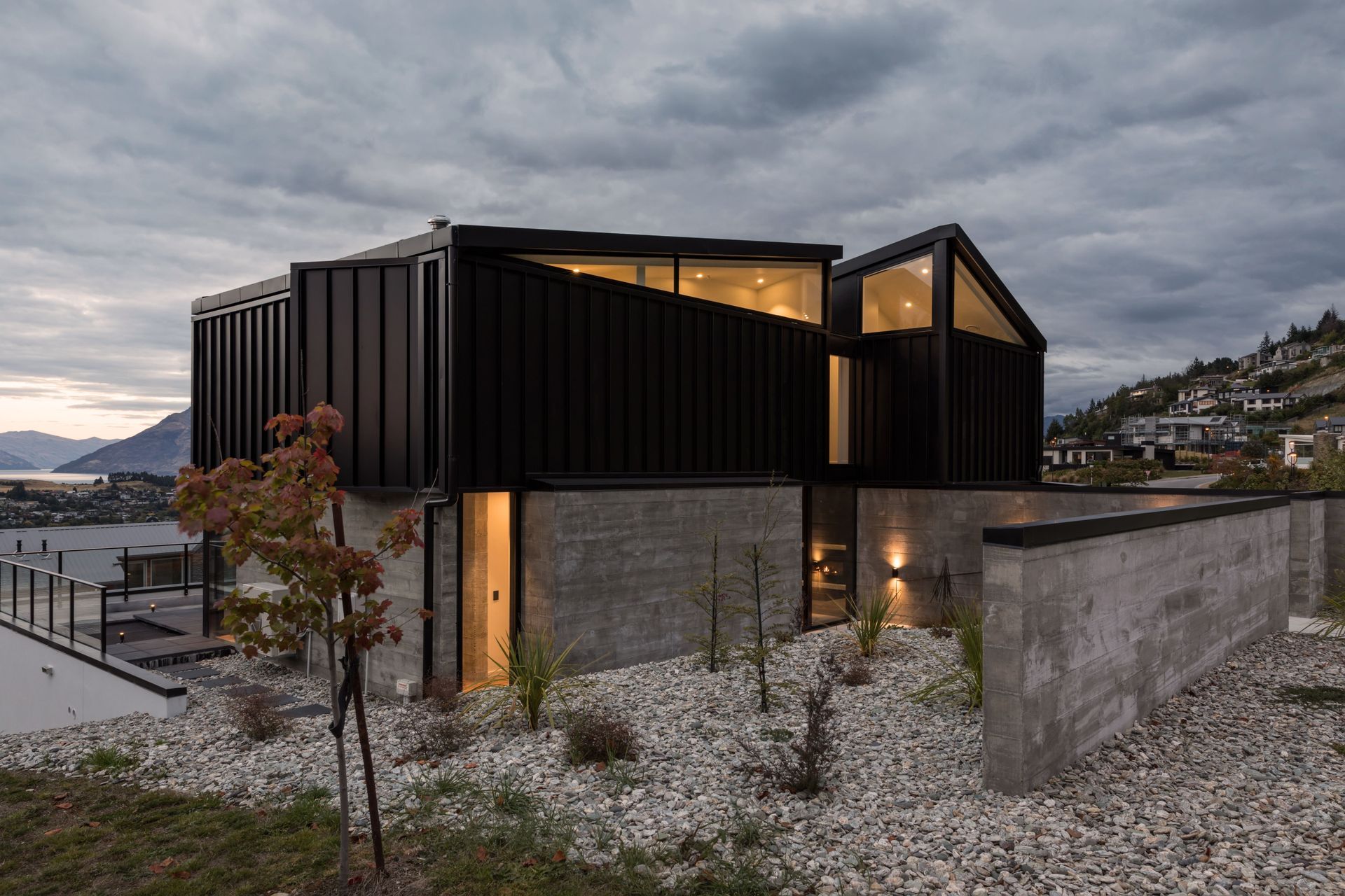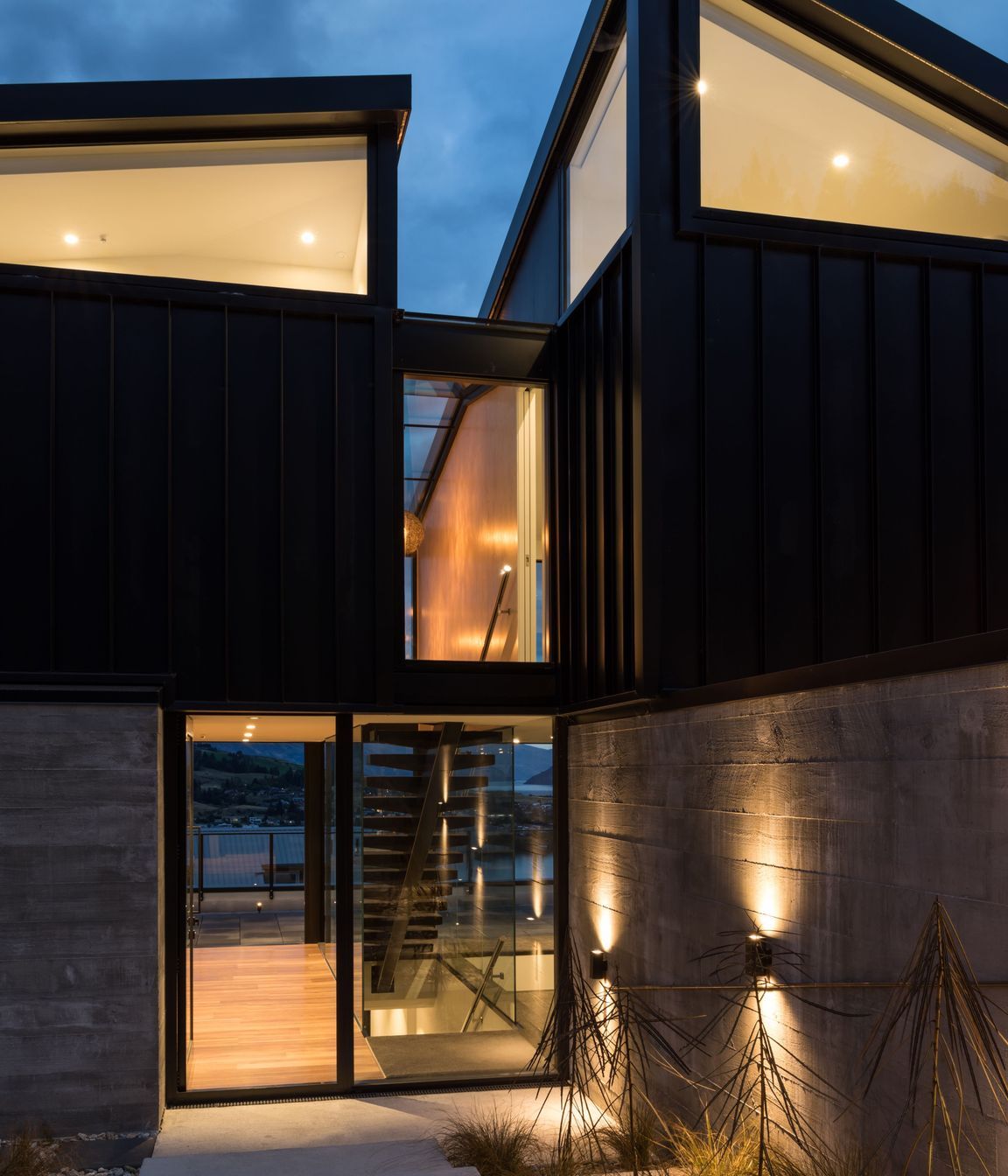 ArchiPro Project Summary - A stunning new build in Queenstown, harmonizing with breathtaking views of The Remarkables and Lake Wakatipu, featuring a unique design with functional spaces, a sunken lounge, and a striking glazed staircase.
