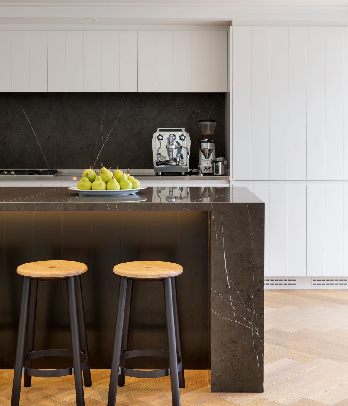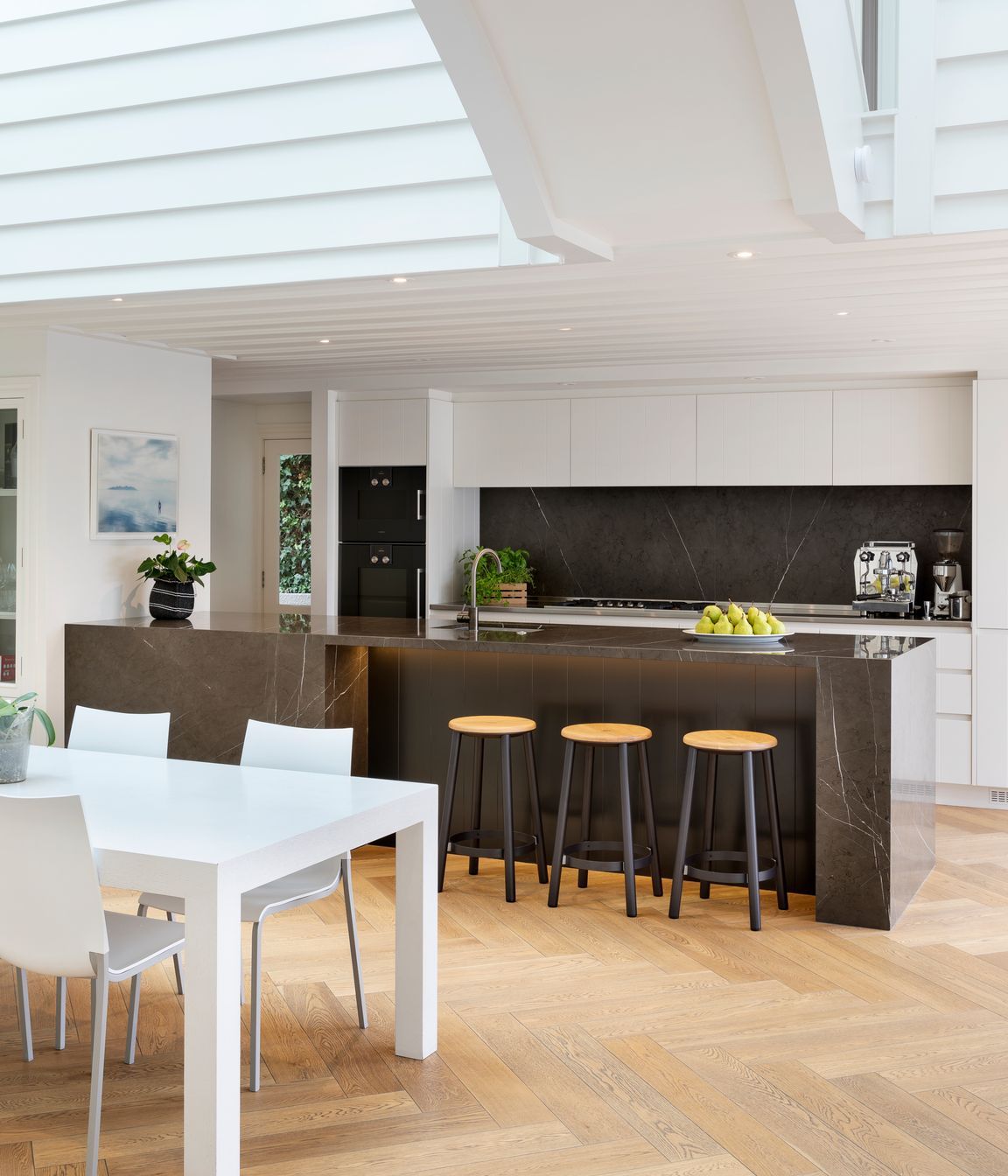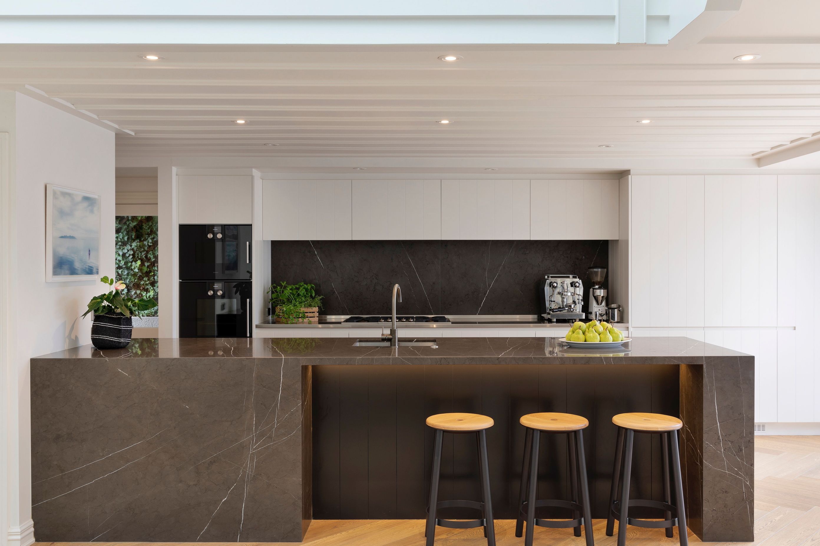 ArchiPro Project Summary - A revitalized kitchen in a villa home featuring open spaces, contemporary cabinetry, and a stunning honed Pietra Grey Marble peninsula, seamlessly integrating functionality and style for family gatherings.
