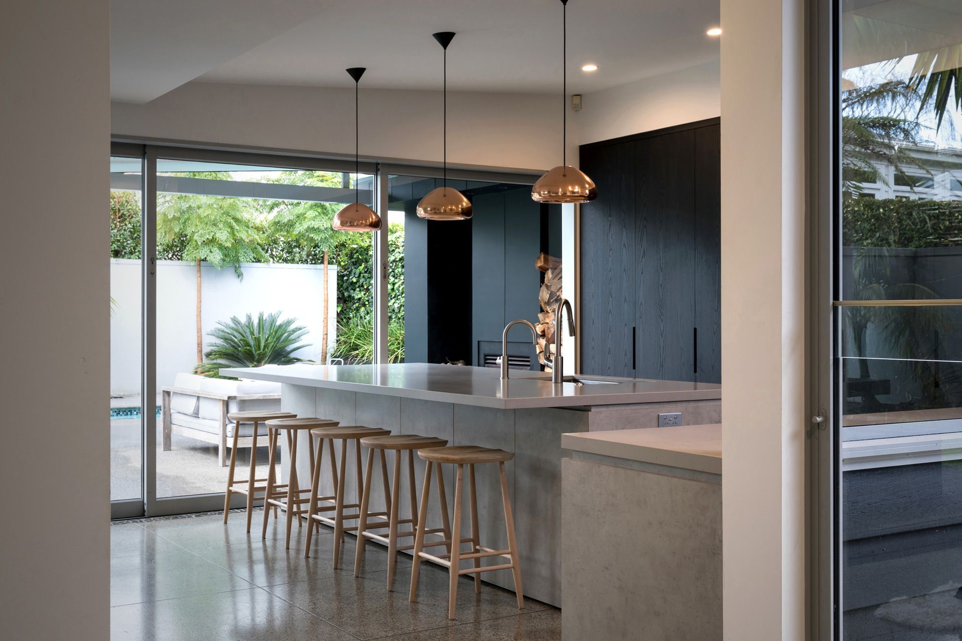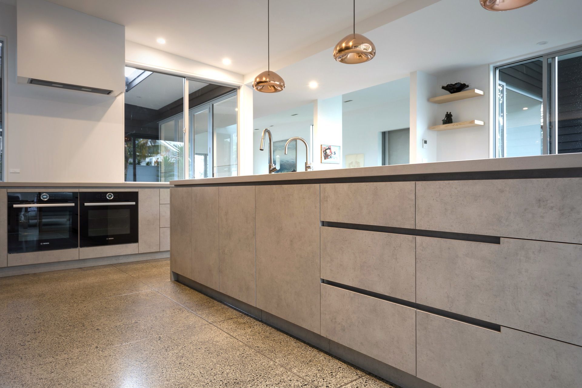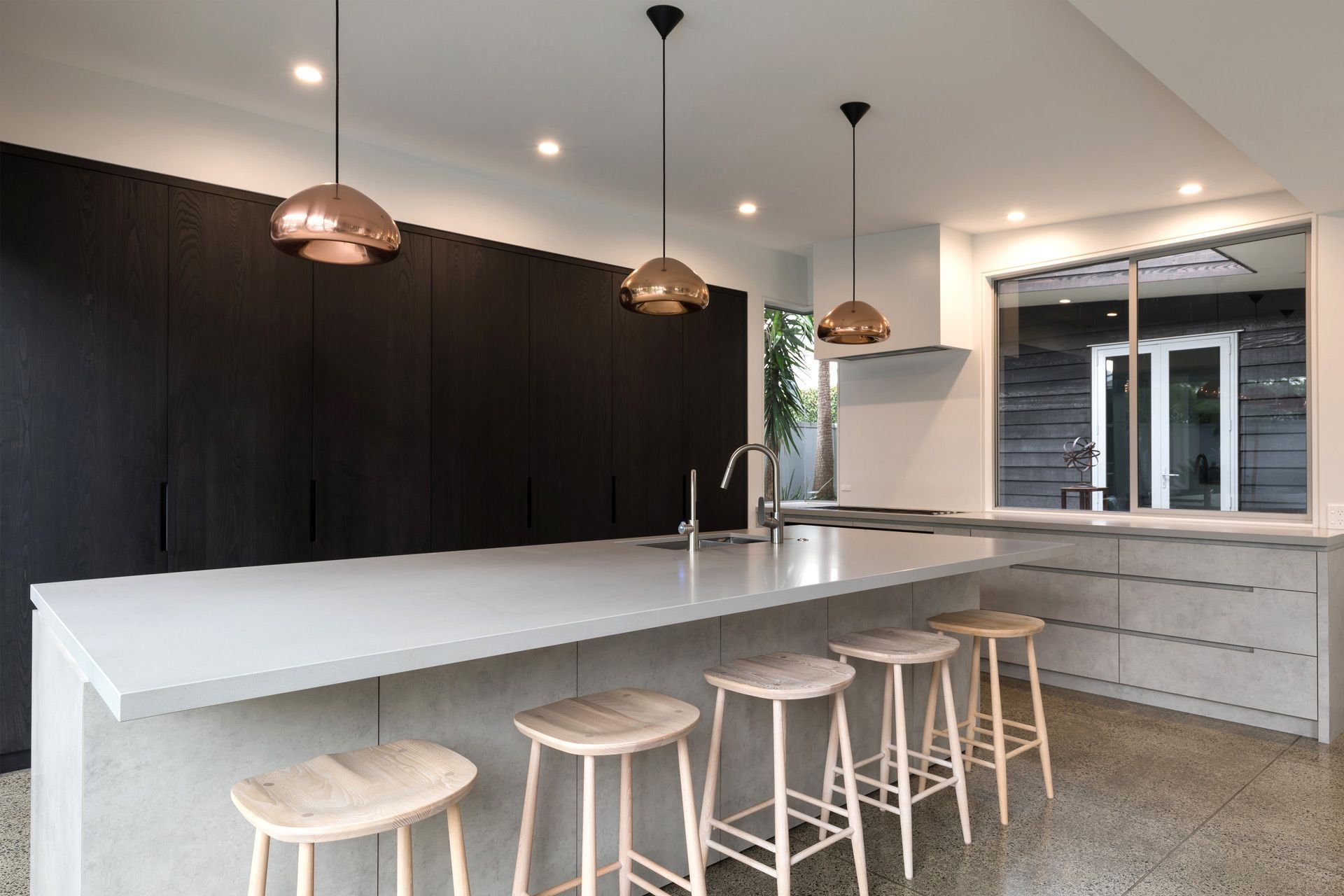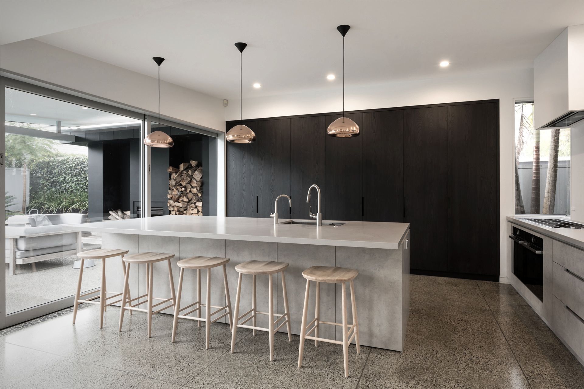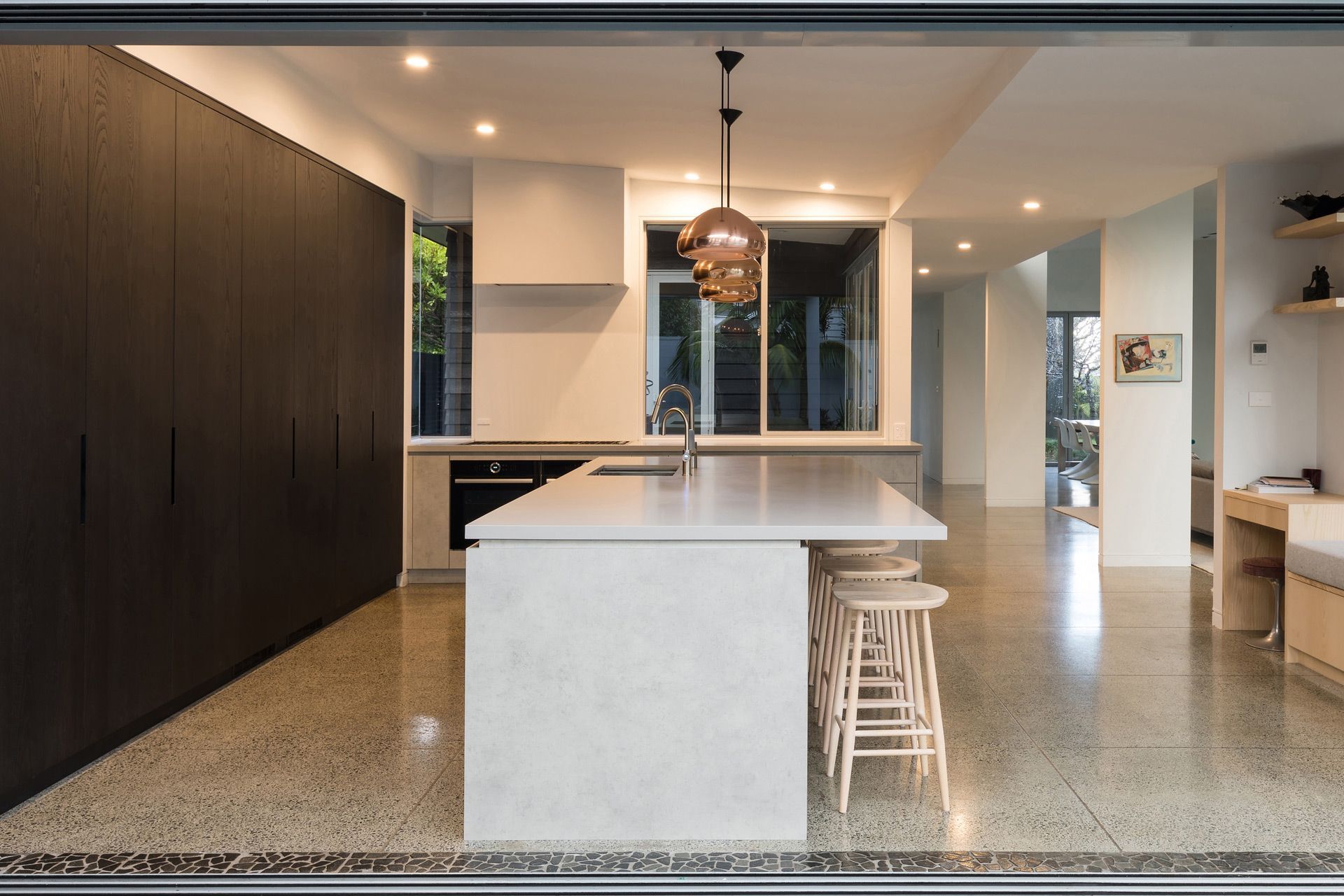 ArchiPro Project Summary - A minimalist kitchen design by Wayne Church, featuring handle-less cabinets, integrated appliances, and a harmonious blend of dark-stained oak and soft finishes, all set against a polished concrete floor in a spacious open-plan layout.