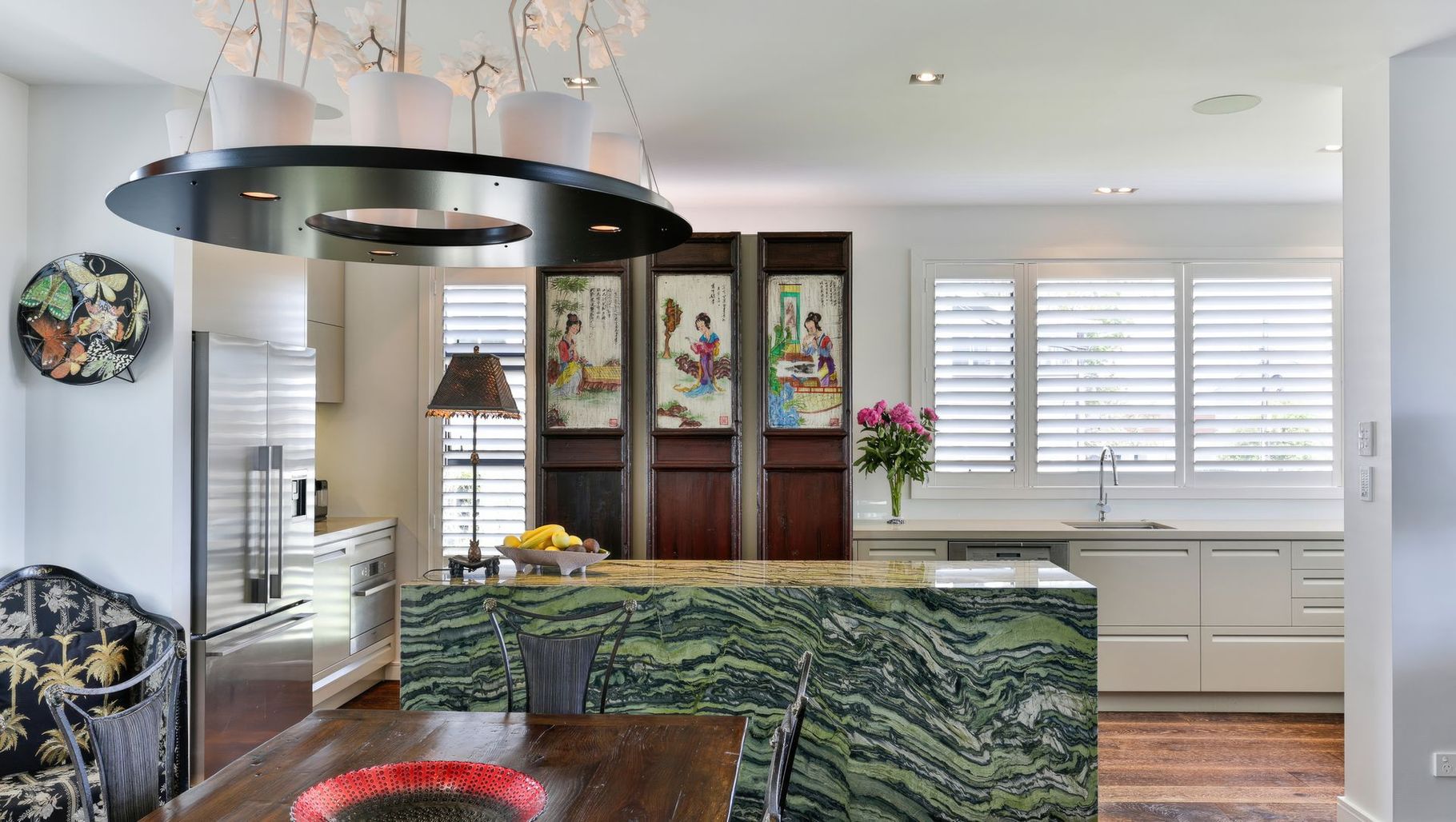 ArchiPro Project Summary - A stunning St Mary's Bay Townhouse featuring a Brazilian quartz granite benchtop, custom cabinetry inspired by antique Chinese screens, a striking Jeremy Cole pendant light, and a serene Balinese-style courtyard, creating a harmonious blend of elegance and comfort.