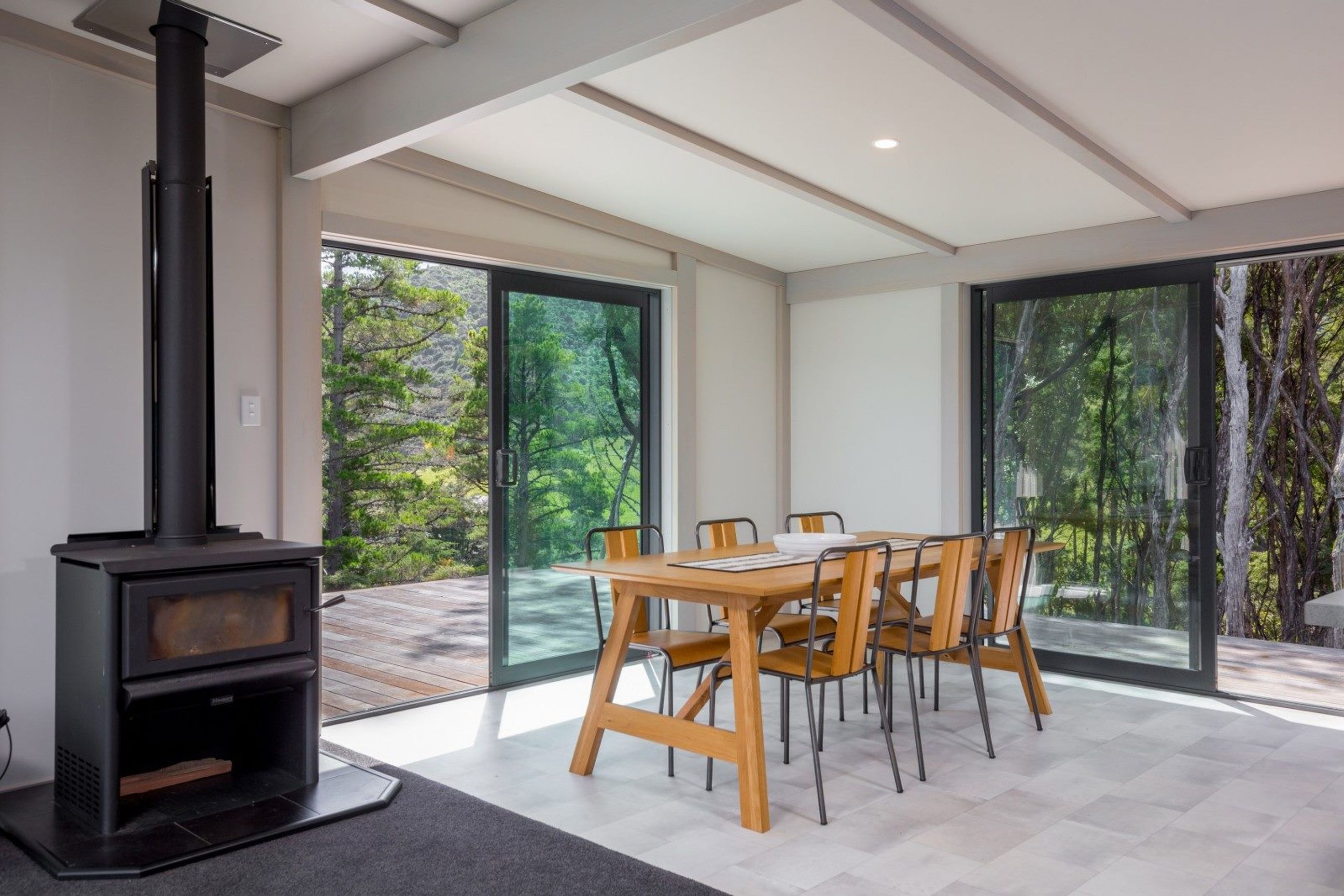 ArchiPro Project Summary - Contemporary 2-bedroom bach with stunning Marlborough Sounds views, featuring high sloping ceilings, expansive windows, and a large wrap-around deck that seamlessly integrates indoor and outdoor living.