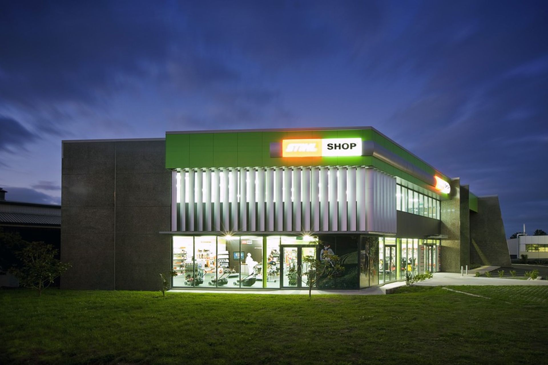 ArchiPro Project Summary - A flagship store for STIHL SHOP, featuring a functional and organized workspace that showcases products while embodying the brand's values of strength, longevity, honesty, and reliability through the use of precast panels, steel, and glass.