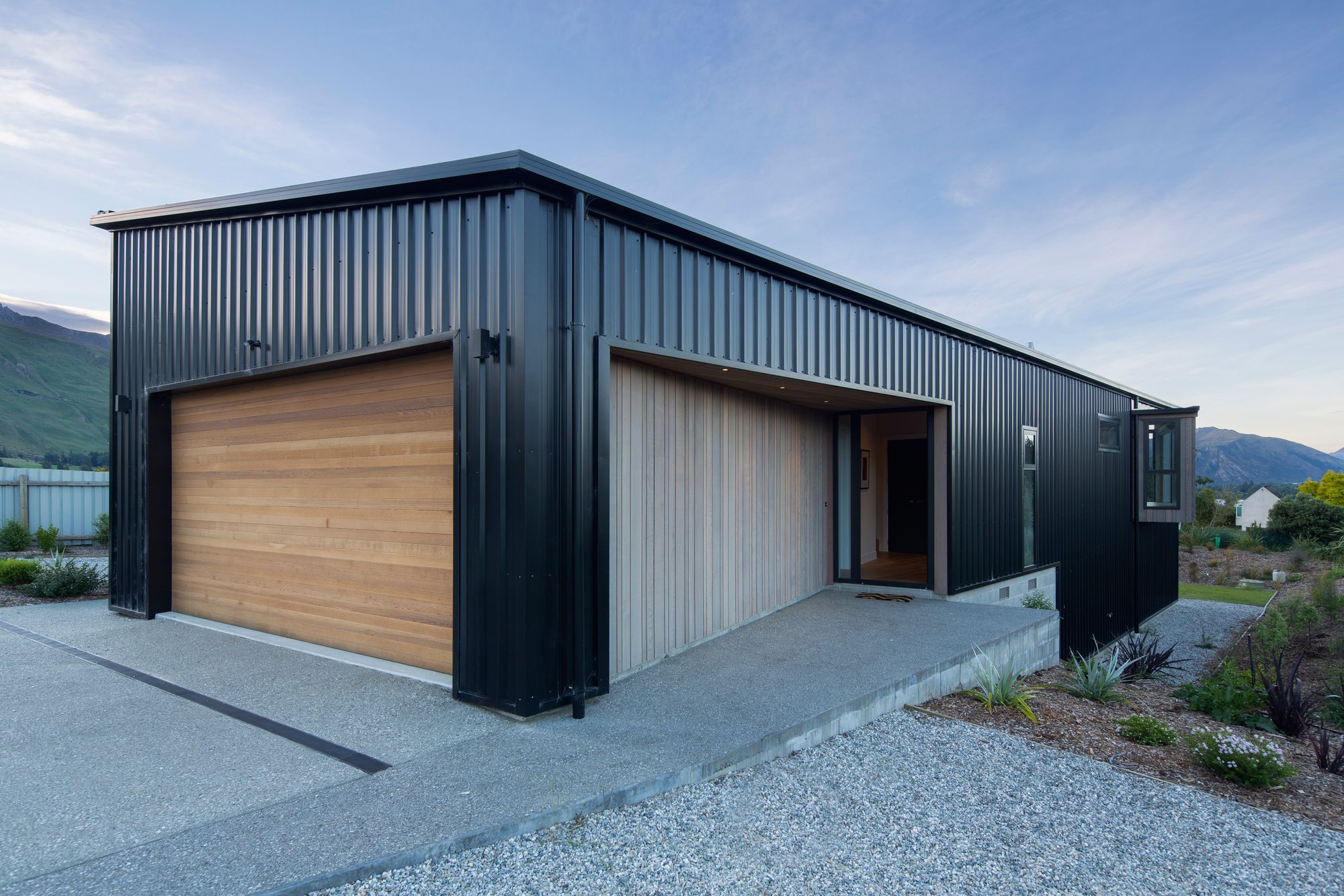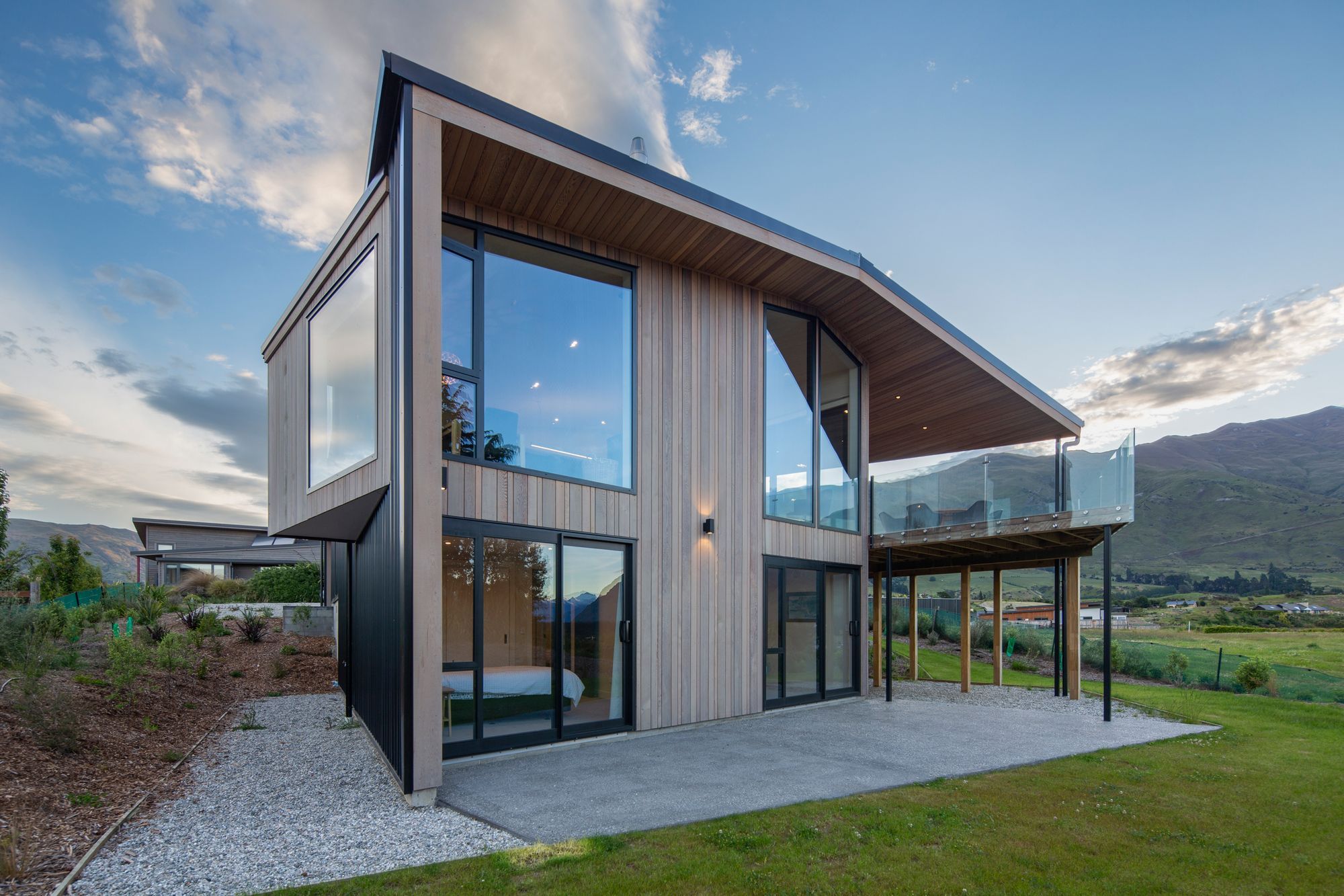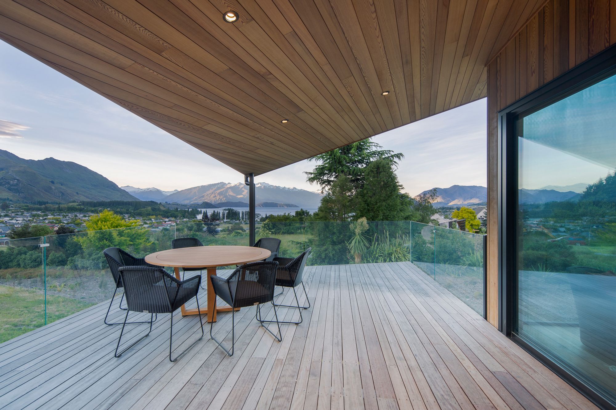 ArchiPro Project Summary - A holiday home designed for optimal sunlight and breathtaking views of Lake Wanaka, featuring a 5-Rib and cedar construction, a cedar soffit, and a hardwood balcony, with an eyebrow roof that provides shade while preserving stunning vistas.