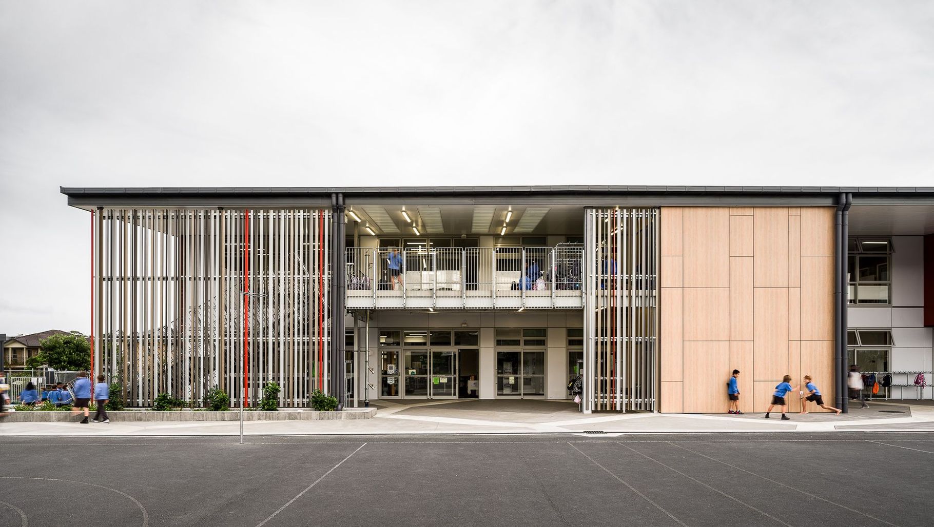 ArchiPro Project Summary - Stonefields School features innovative Trespa Meteon cladding, designed by Jasmax, utilizing a palette of Sienna Brown, Dark Denim, Winter Grey, and Milano Sabbia, ensuring durability and low maintenance for a vibrant learning environment in Auckland.