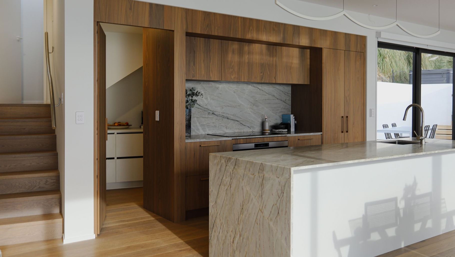 This kitchen showcases the perfect harmony of luxury and warmth, featuring a dramatic waterfall island in Cosentino’s Sensa stone in Vancouver and custom cabinetry in VidaSpace walnut veneer. Designed with both functionality and style in mind, the space embraces natural textures and earthy tones to create a grounded, welcoming atmosphere. From the integrated appliances to the thoughtfully selected materials, every detail works together to form a refined yet relaxed environment — a modern sanctuary at the heart of the home.