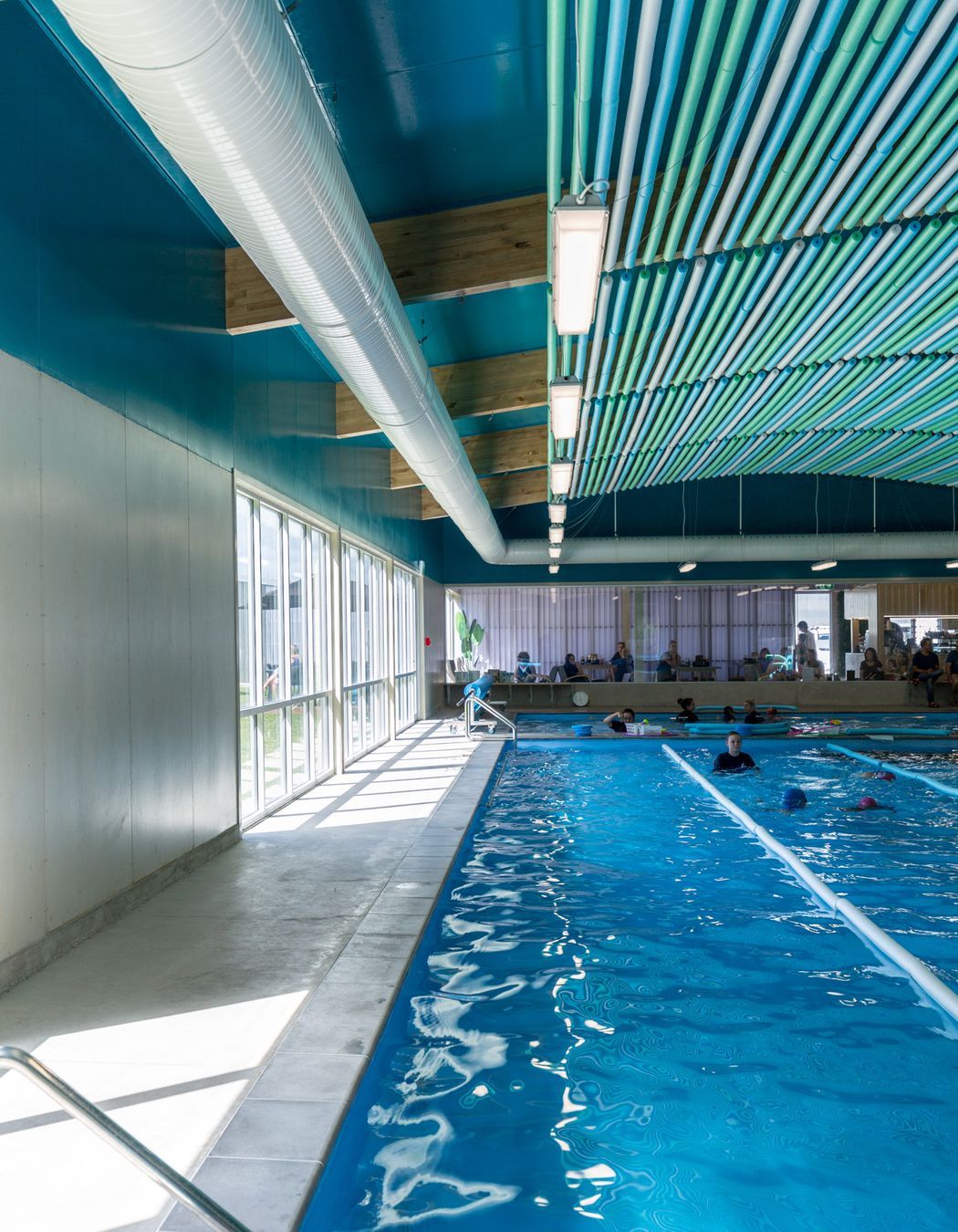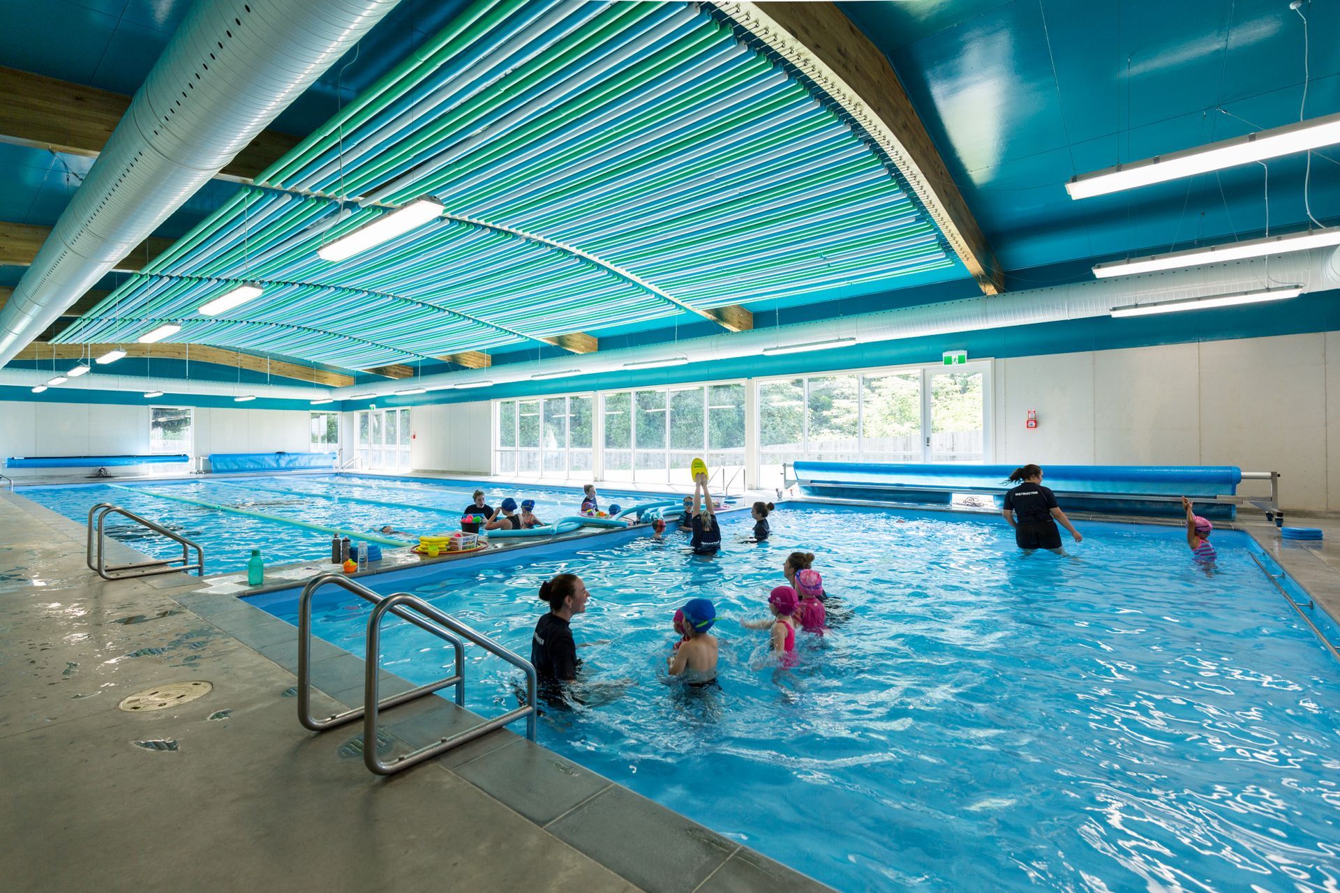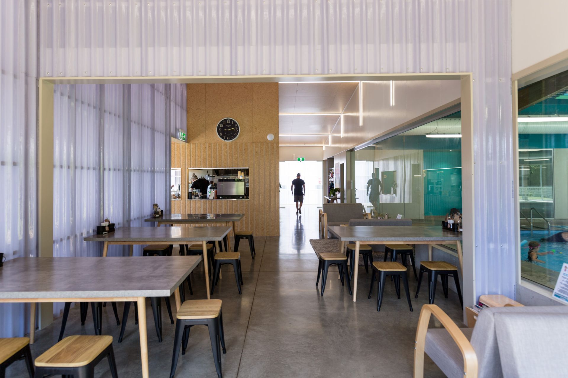 ArchiPro Project Summary - A finalist in the 2018 Civic Interior Awards, Streamline Swim Academy features a dual training pool complex with integrated changing facilities, a parent viewing area, and an independent café, all designed for efficiency and functionality within an industrial park setting.