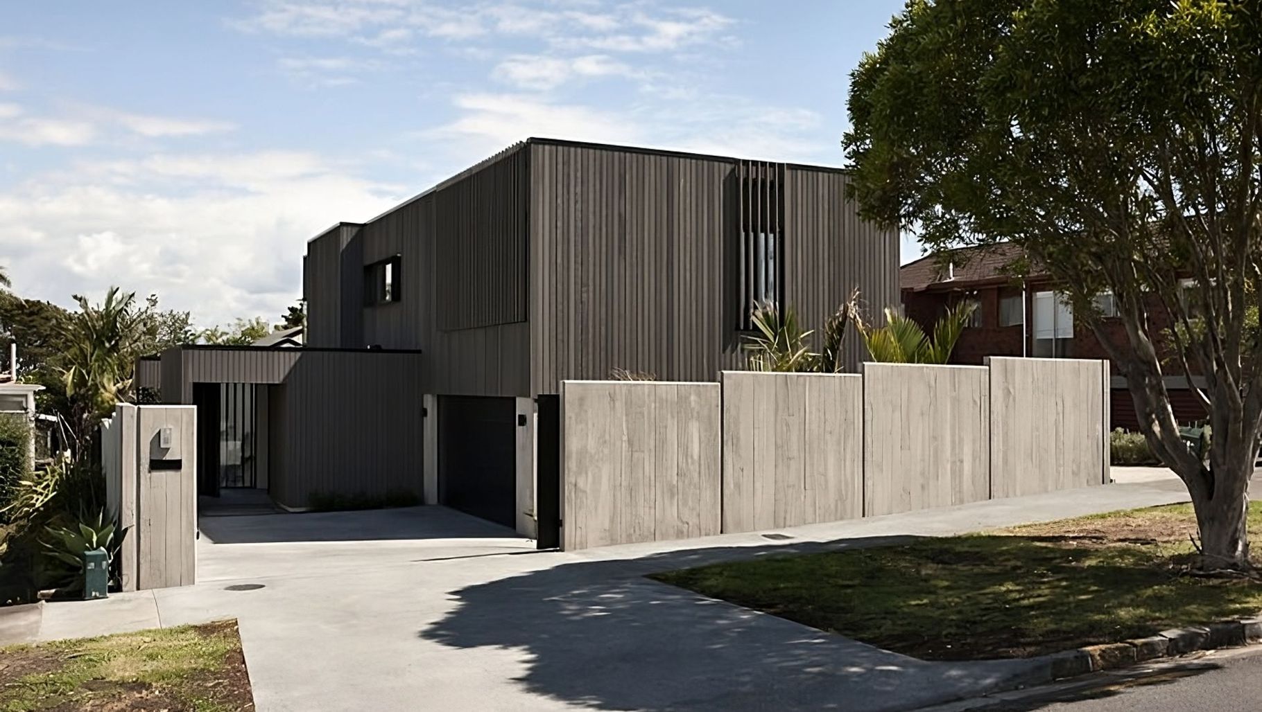 ArchiPro Project Summary - Modernist building featuring cedar weatherboards and precast panels, designed with careful detailing for privacy and security while enhancing views.