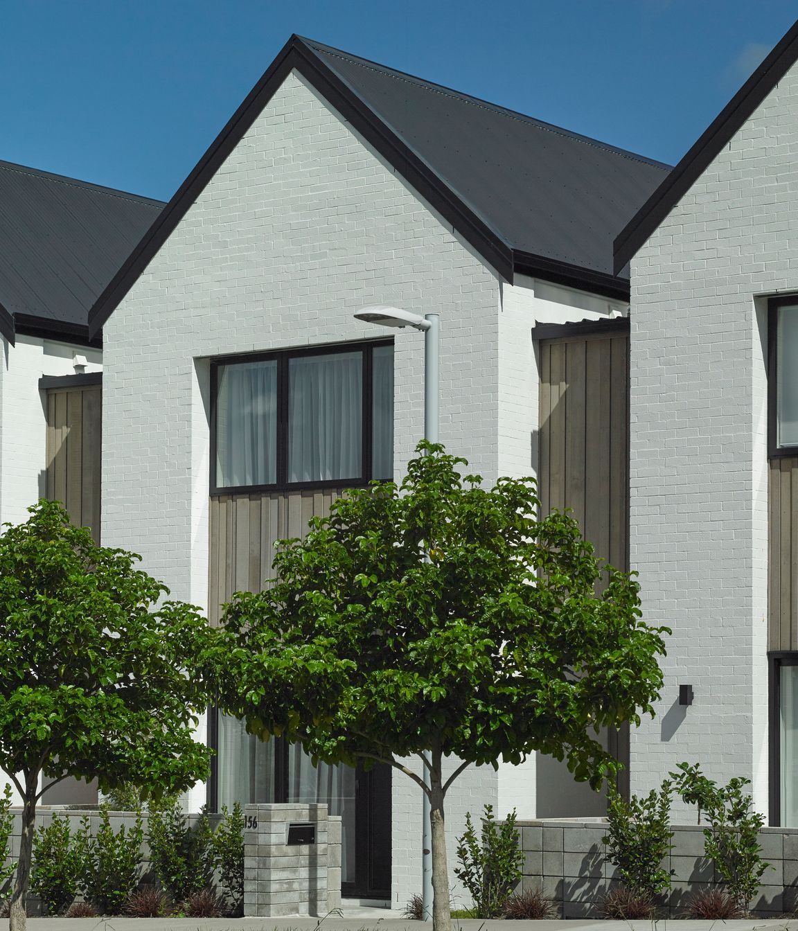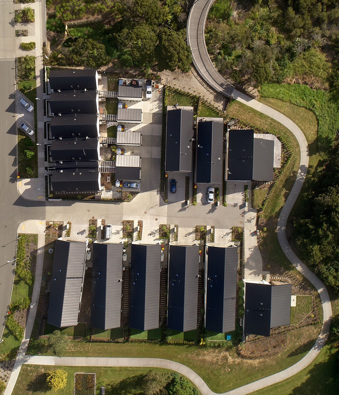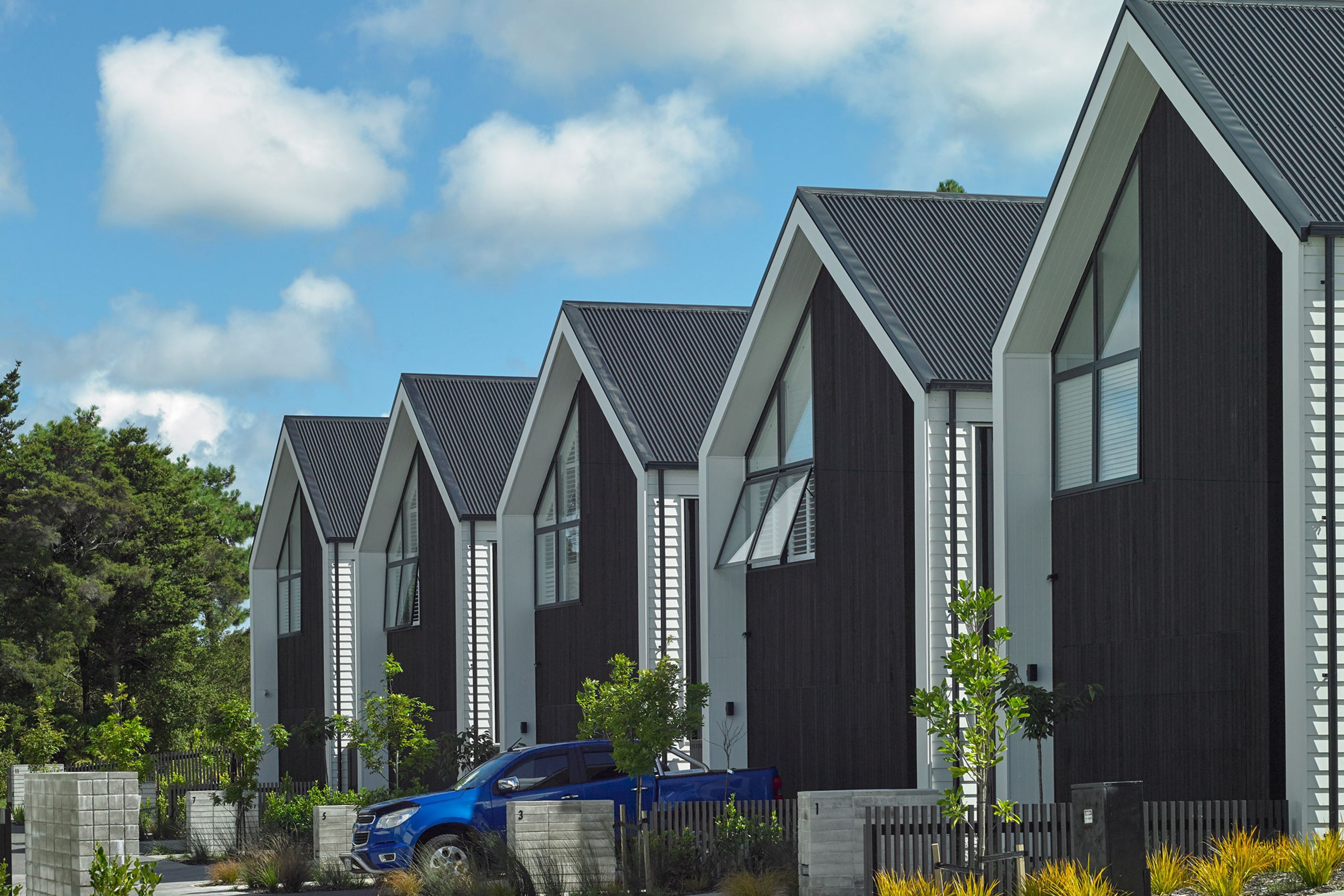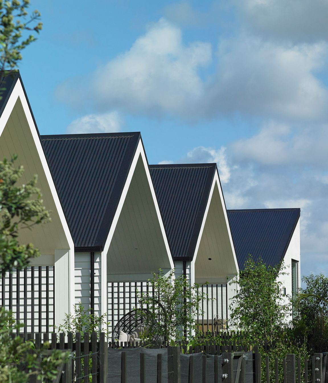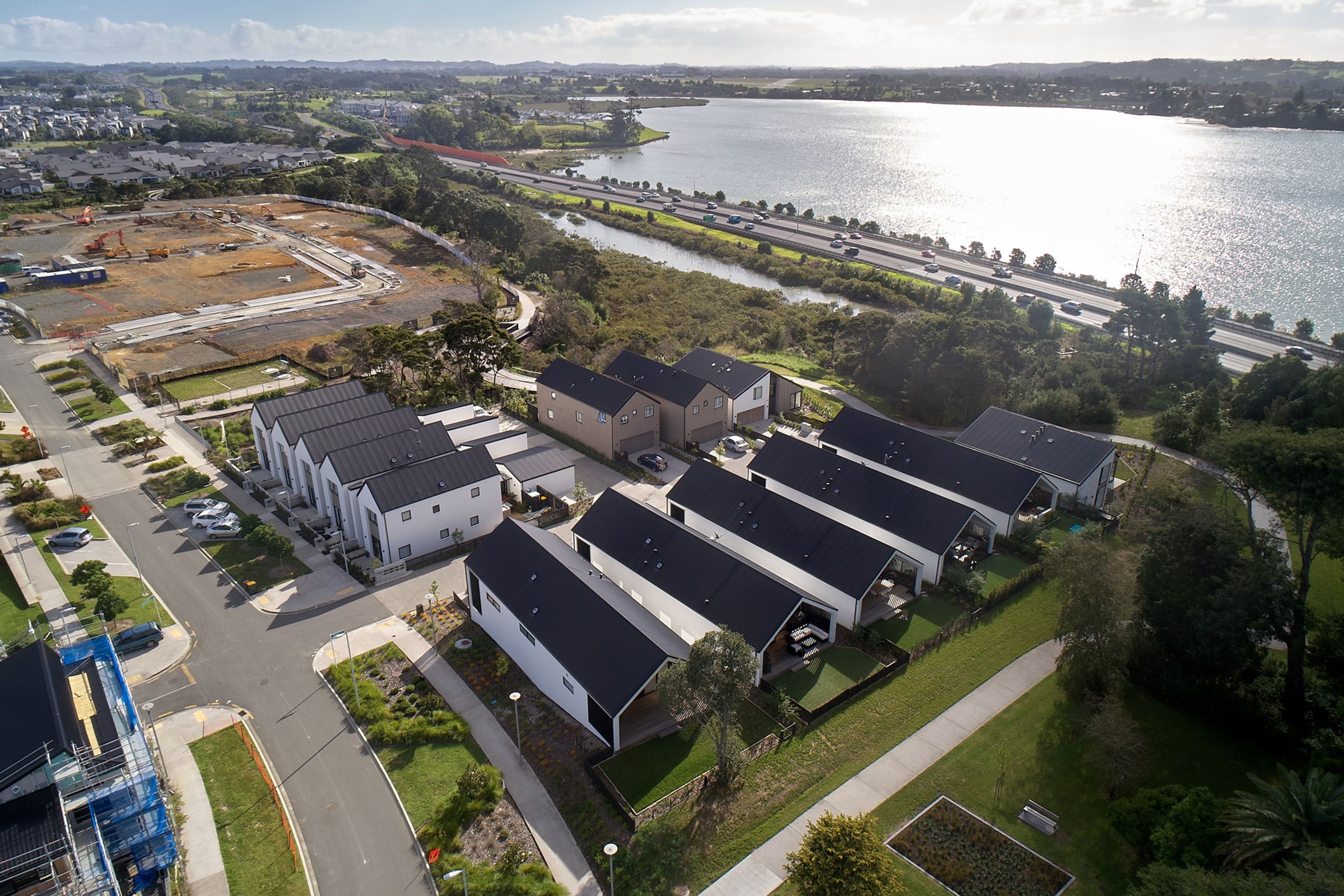 ArchiPro Project Summary - Contemporary coastal development featuring 14 elegantly designed homes, inspired by boathouse typologies, with a focus on low maintenance materials and thoughtful architecture, creating a unique and cohesive new neighborhood at Hobsonville Point.