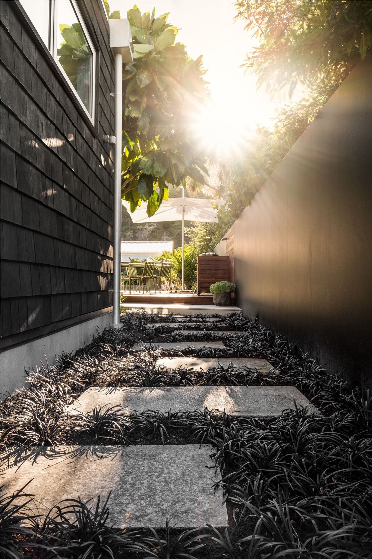 ArchiPro Project Summary - A revitalized outdoor space featuring semi-tropical planting, family-friendly entertainment areas, and locally sourced materials, creating a harmonious coastal retreat.