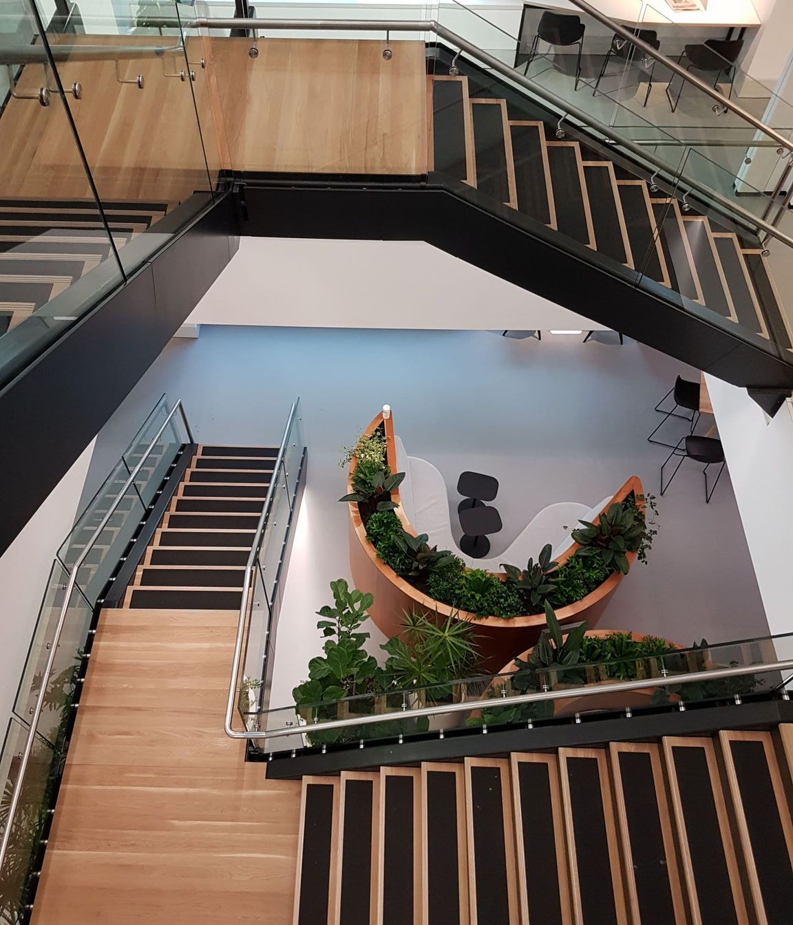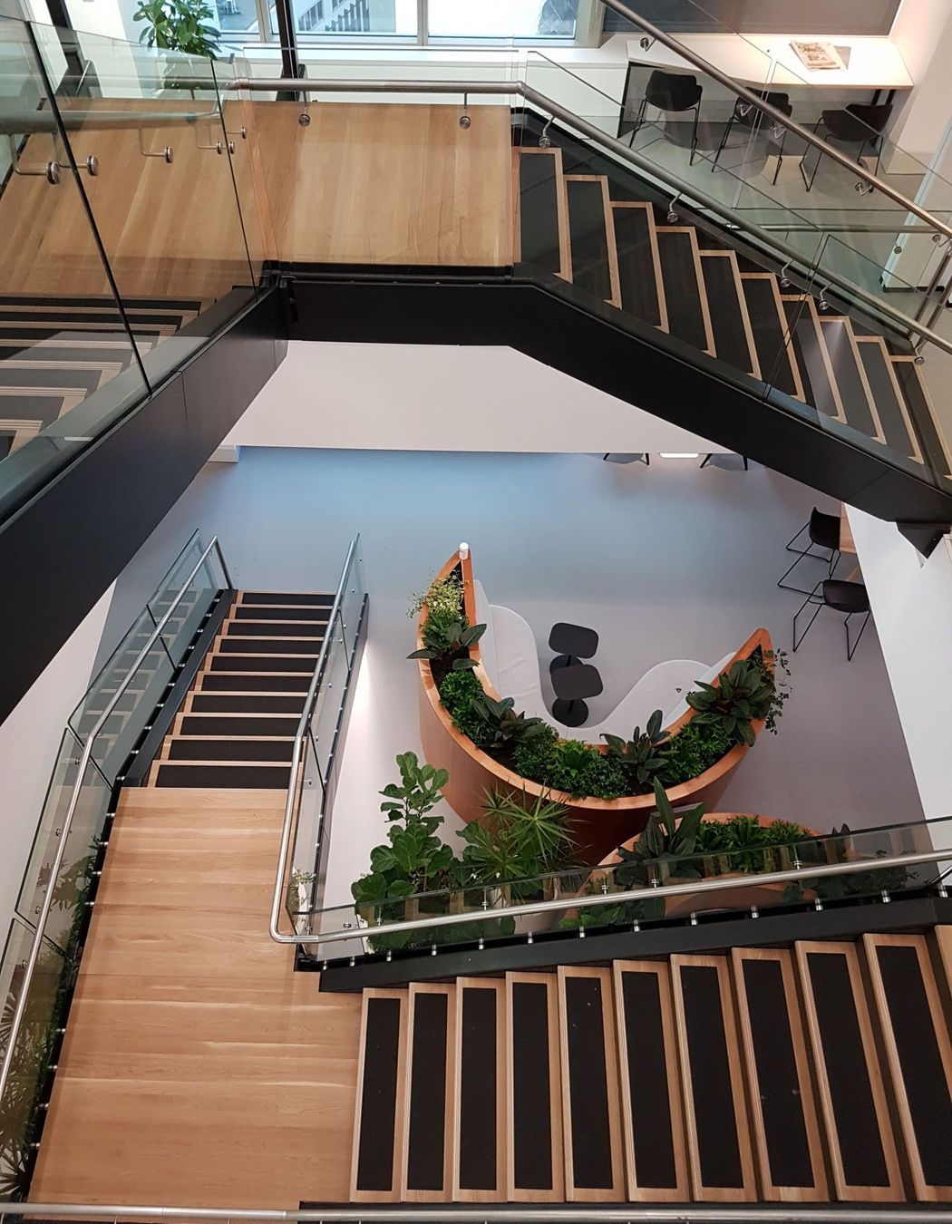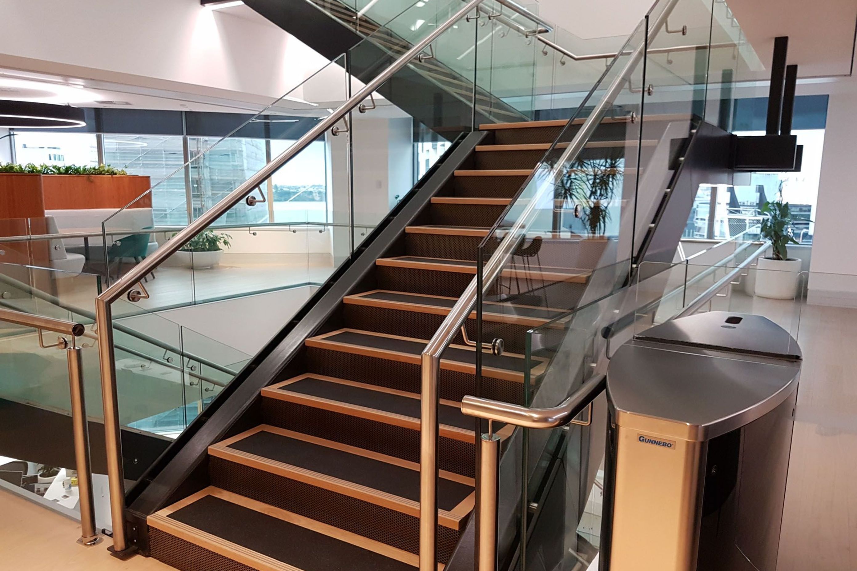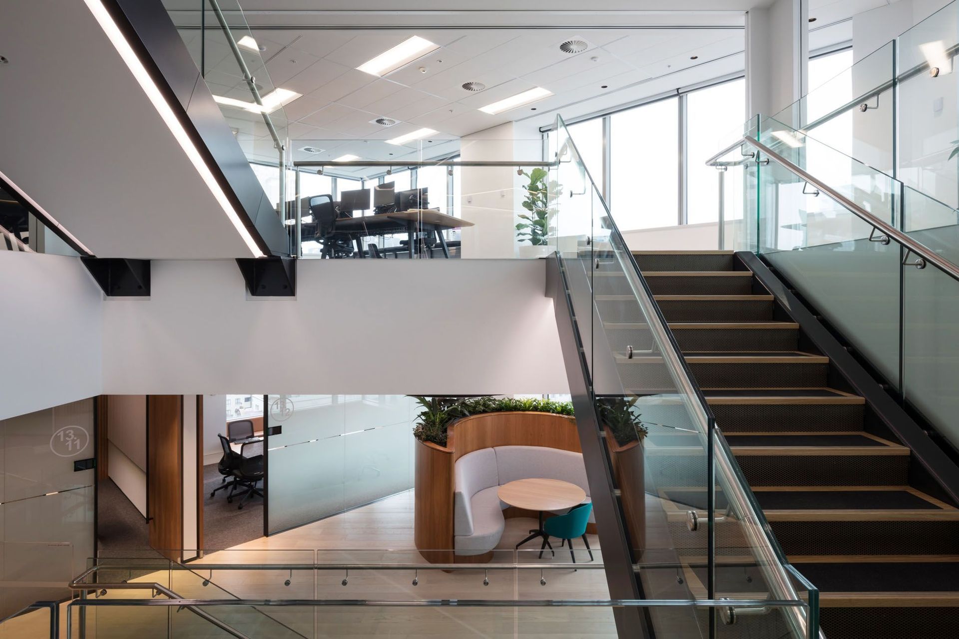 ArchiPro Project Summary - A striking stairway featuring solid American oak treads enhances the contemporary design of the Suncorp Vero Building, seamlessly integrating four levels while adhering to health and safety standards.