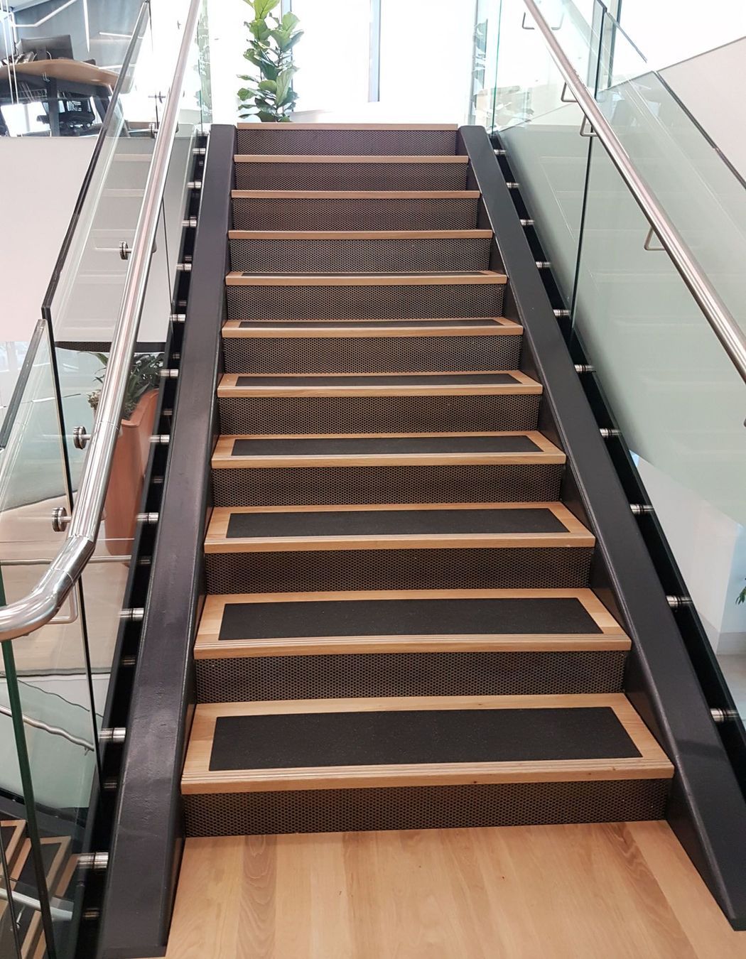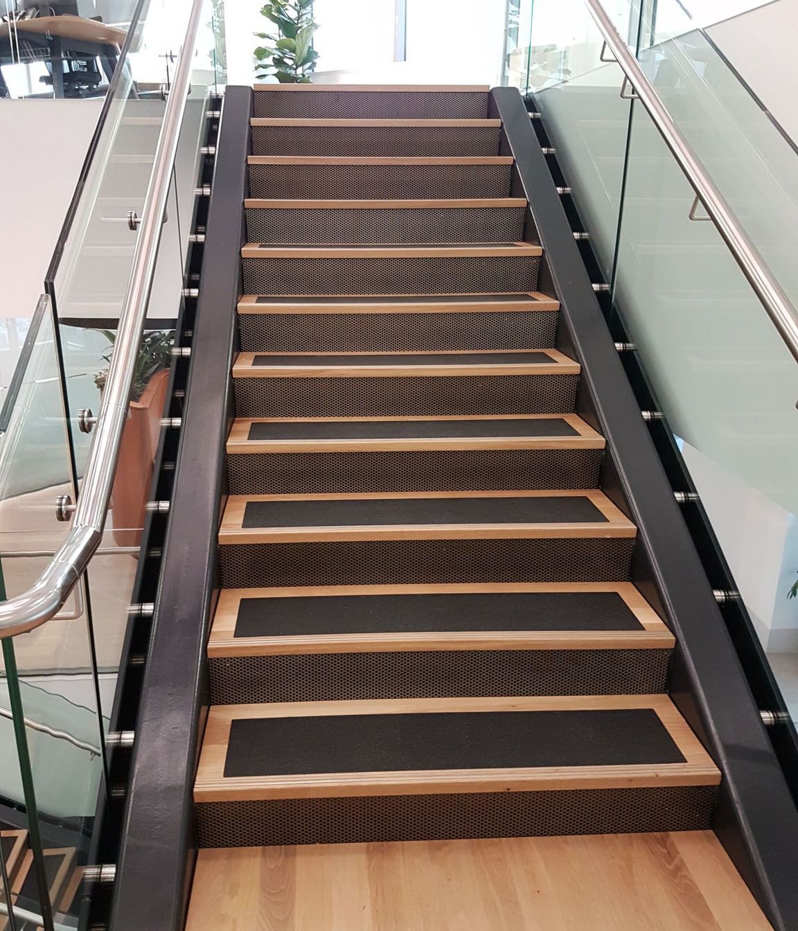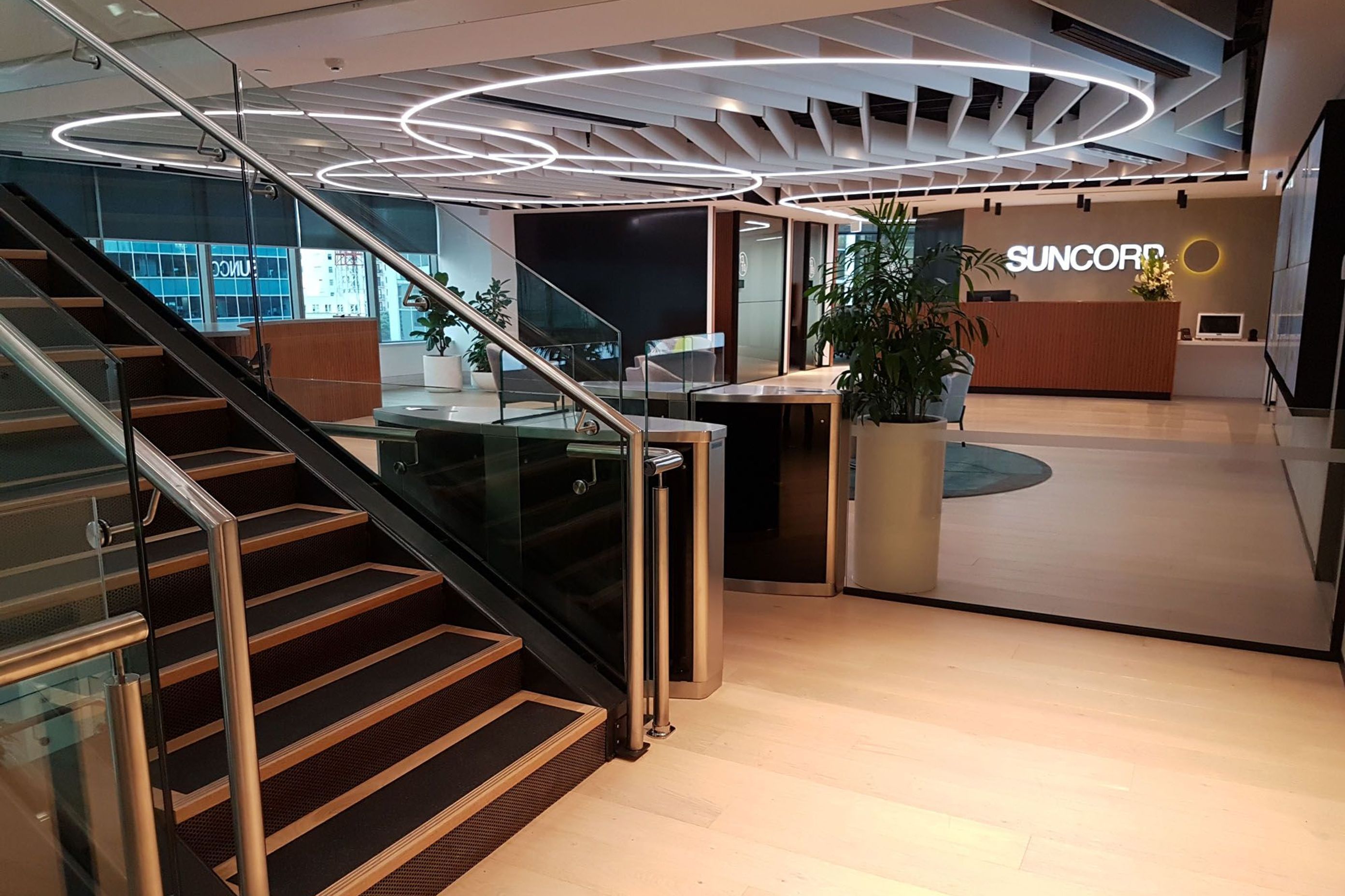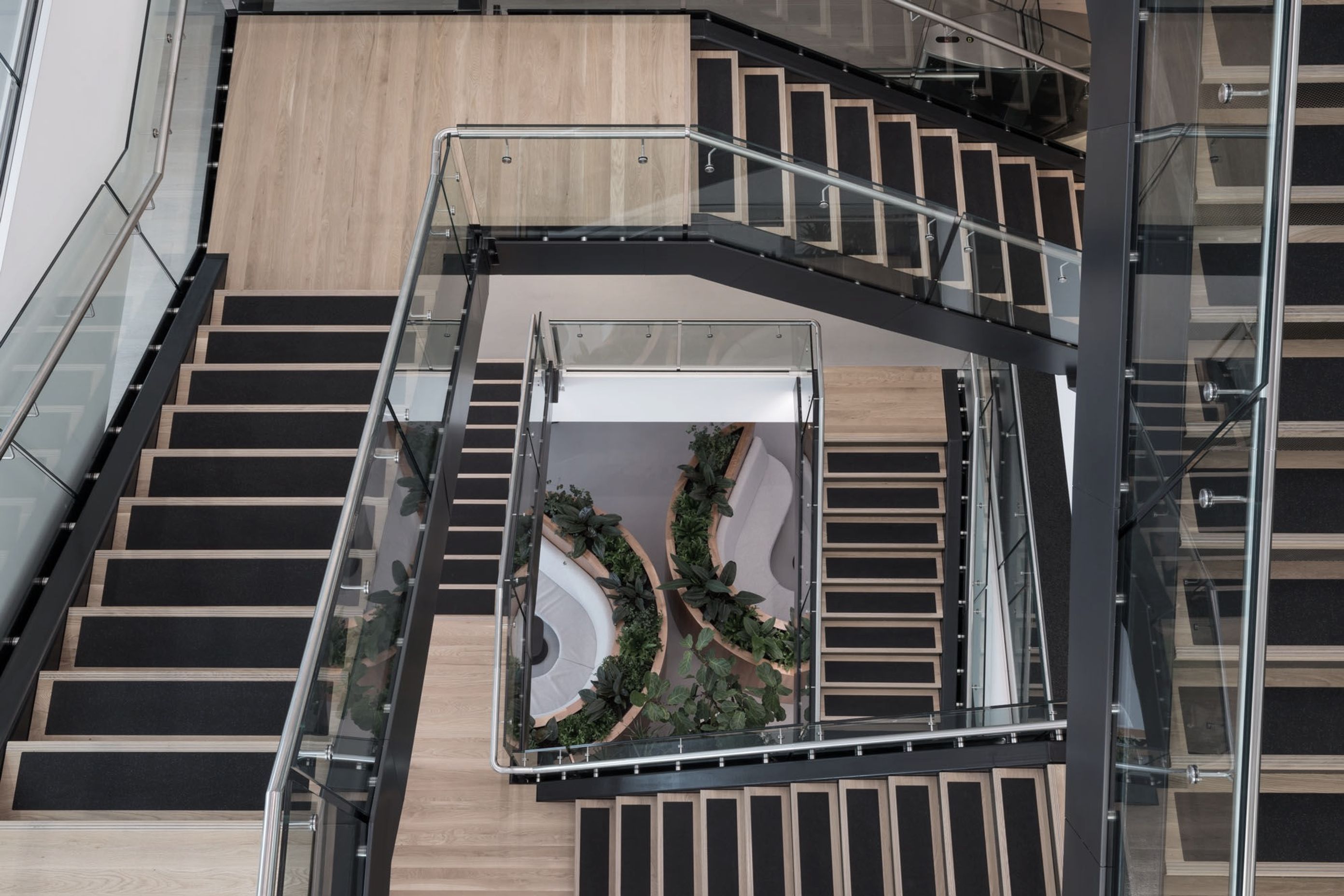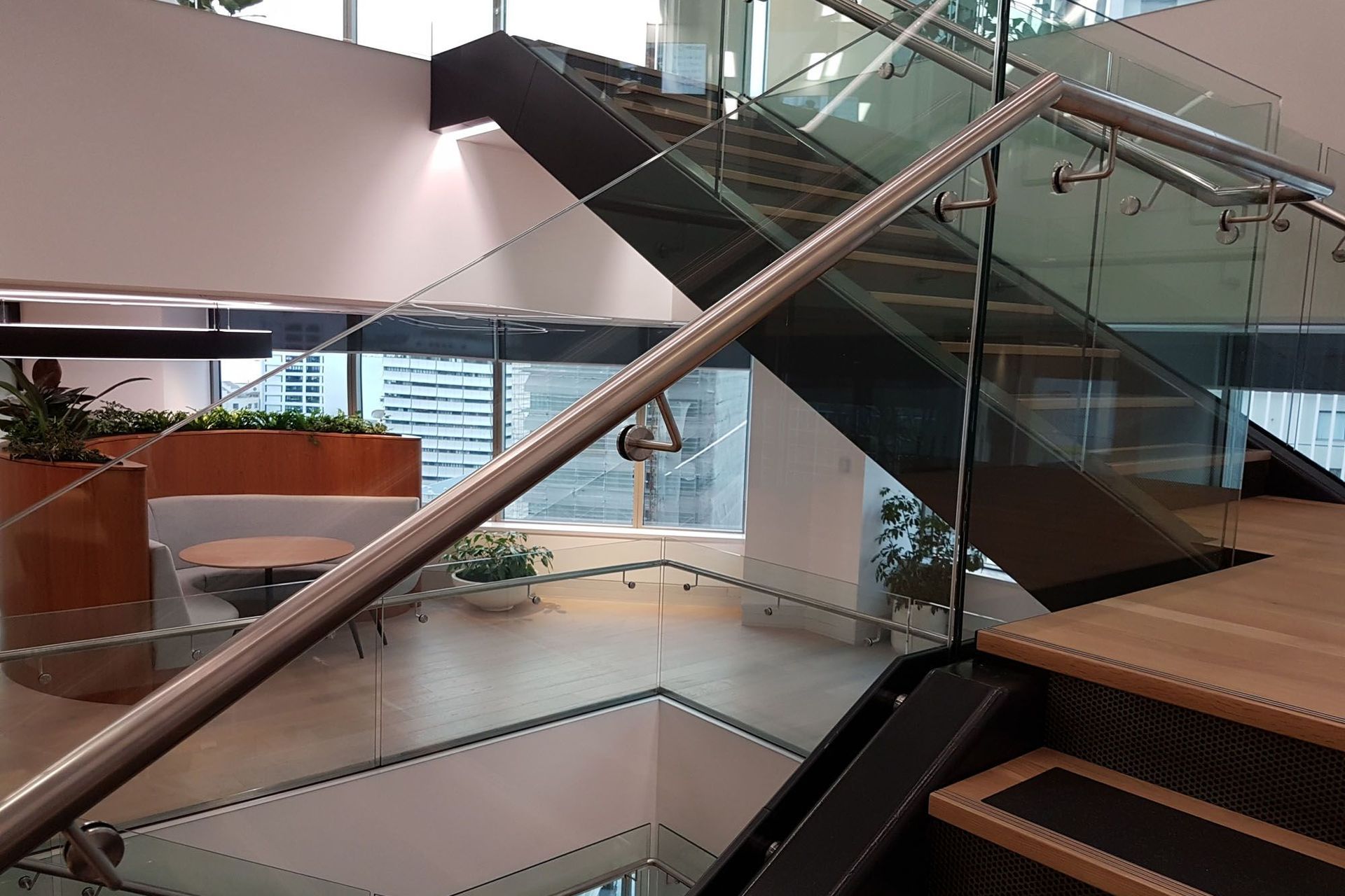 ArchiPro Project Summary - A striking stairway featuring solid American oak treads enhances the contemporary design of the Suncorp Vero Building, seamlessly integrating four levels while adhering to health and safety standards.