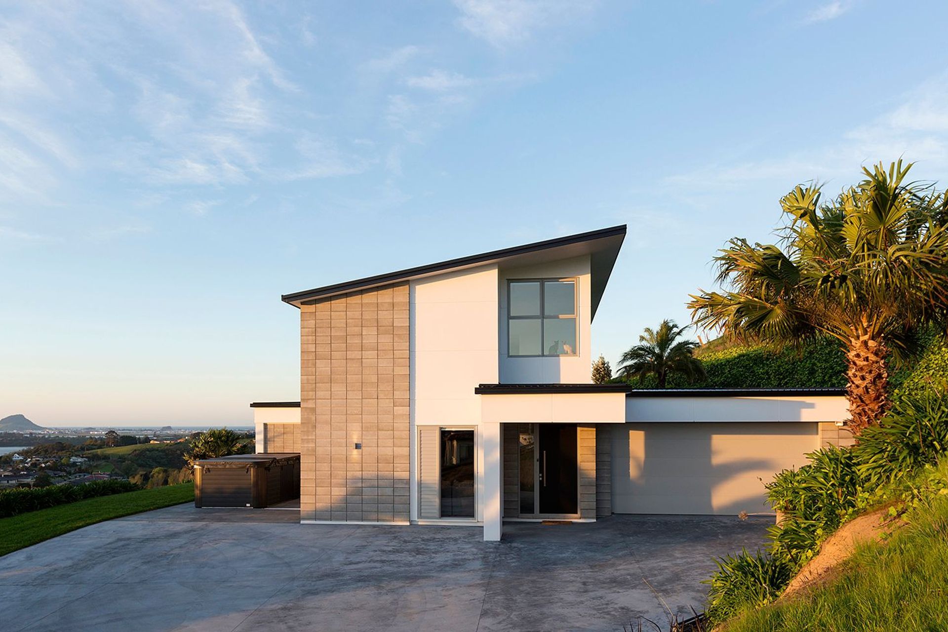ArchiPro Project Summary - Contemporary hillside home with breathtaking views of Tauranga harbour, featuring 290m2 of living space, four bedrooms, three bathrooms, and advanced septic drainage system.