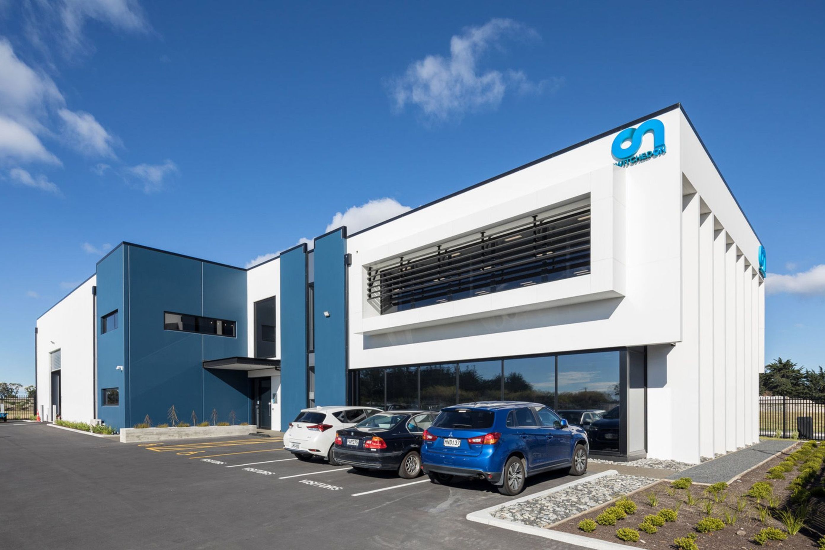 ArchiPro Project Summary - A contemporary two-storey facility for Switched On, featuring open workspaces and a warehouse, designed to showcase quality craftsmanship and accommodate future growth, with a modern aesthetic and thoughtful design elements.