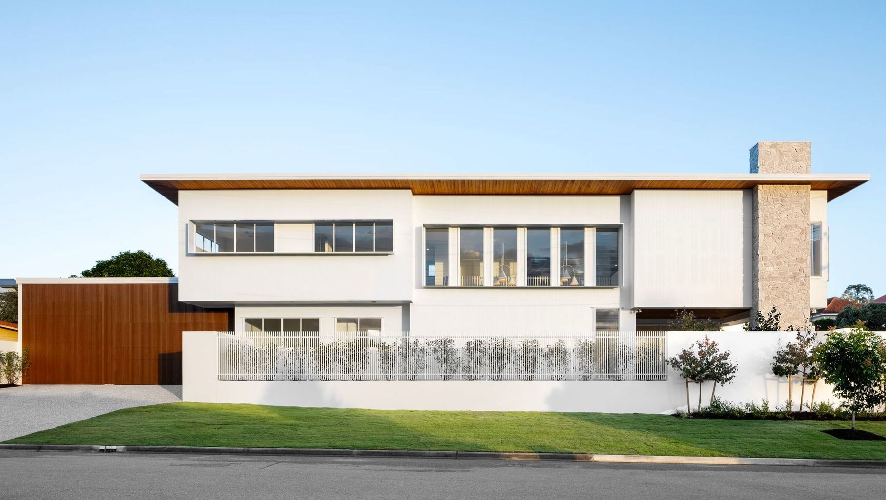 ArchiPro Project Summary - Sydney Ave 2.0 Residence features a striking design on a corner block in Camp Hill, Brisbane, showcasing long horizontal lines and a crisp white palette that enhances natural light through expansive voids and windows.