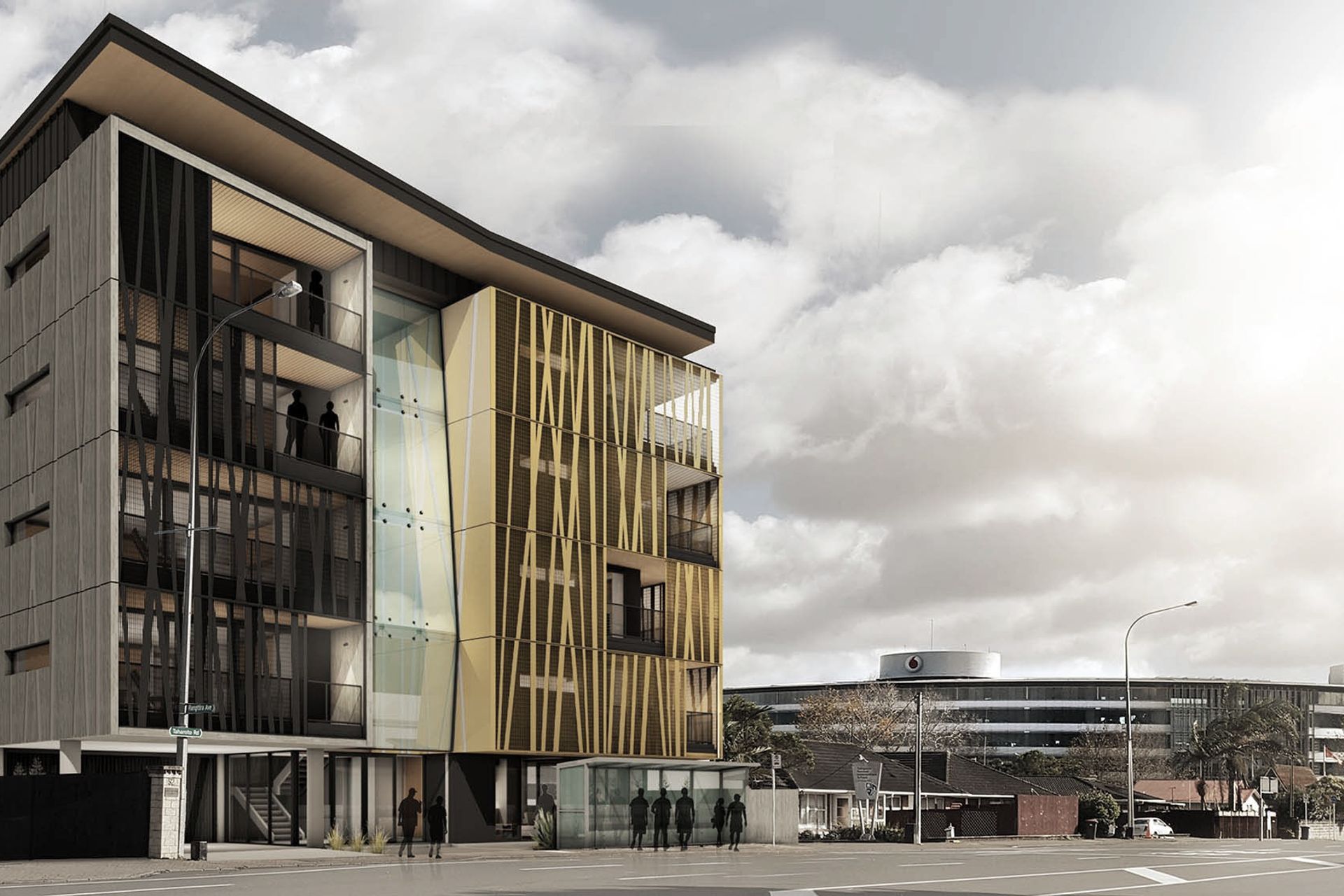ArchiPro Project Summary - Taharoto Apartments is a multi-unit residential development inspired by its namesake, featuring a striking 5-storey glass mezzanine, a mix of one to three-bedroom apartments, and shared spaces, all designed to evoke elements of nature with balconies that create dynamic light patterns.