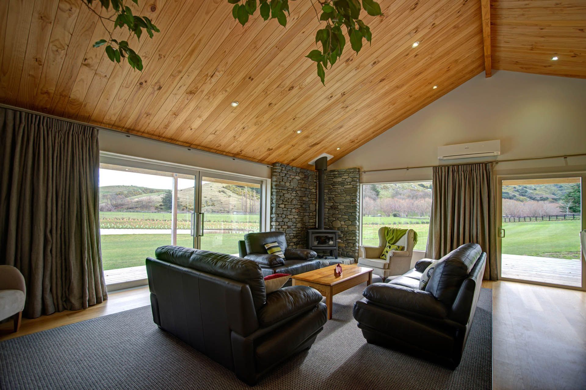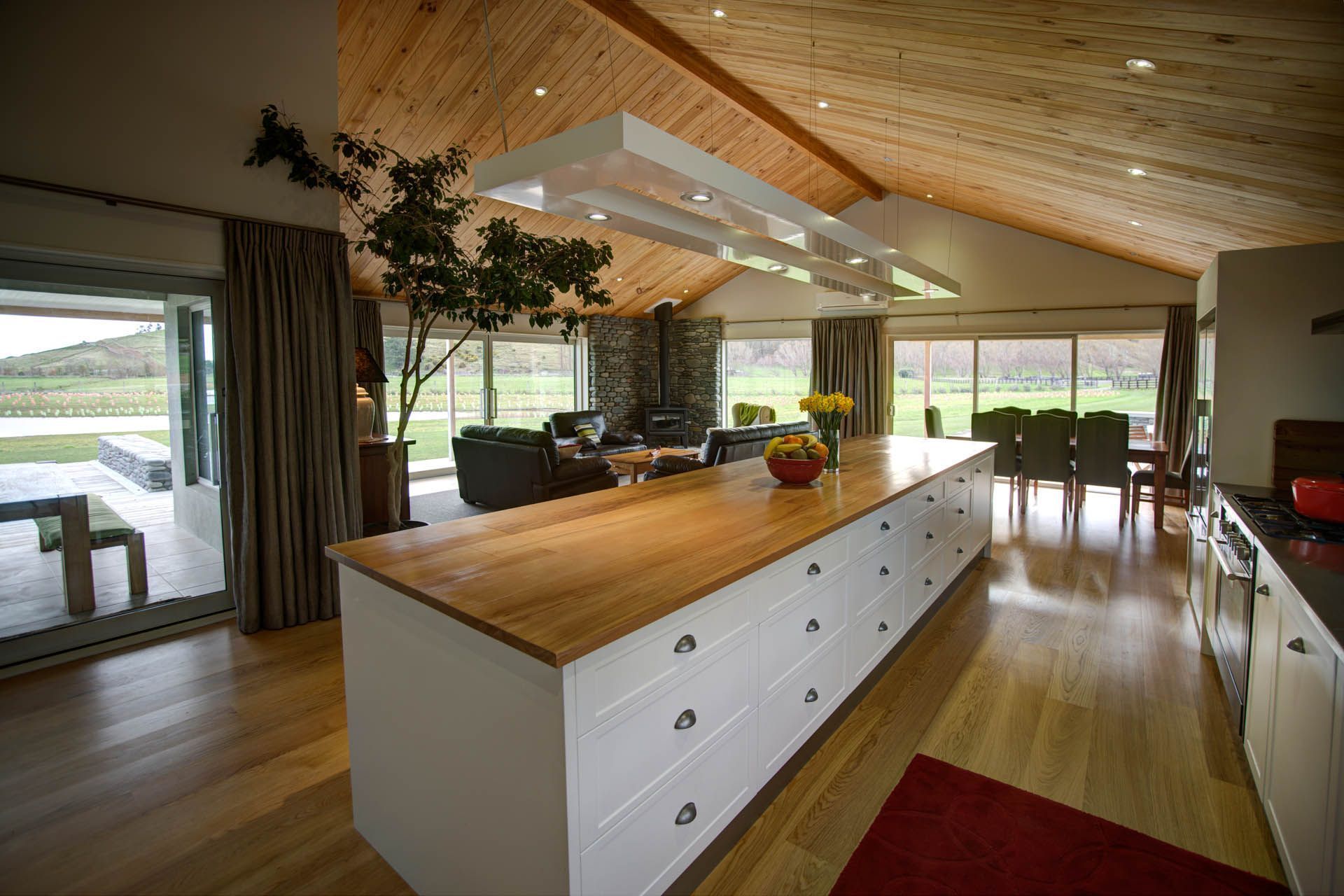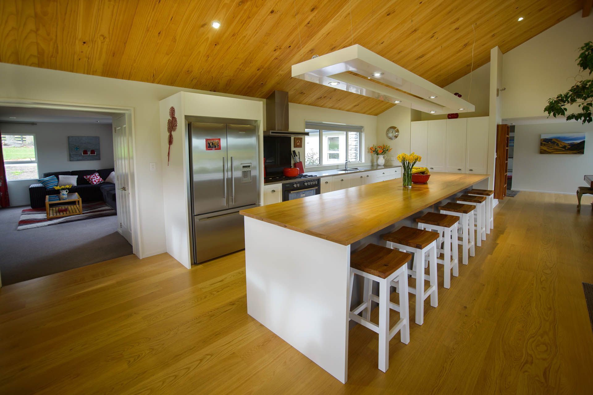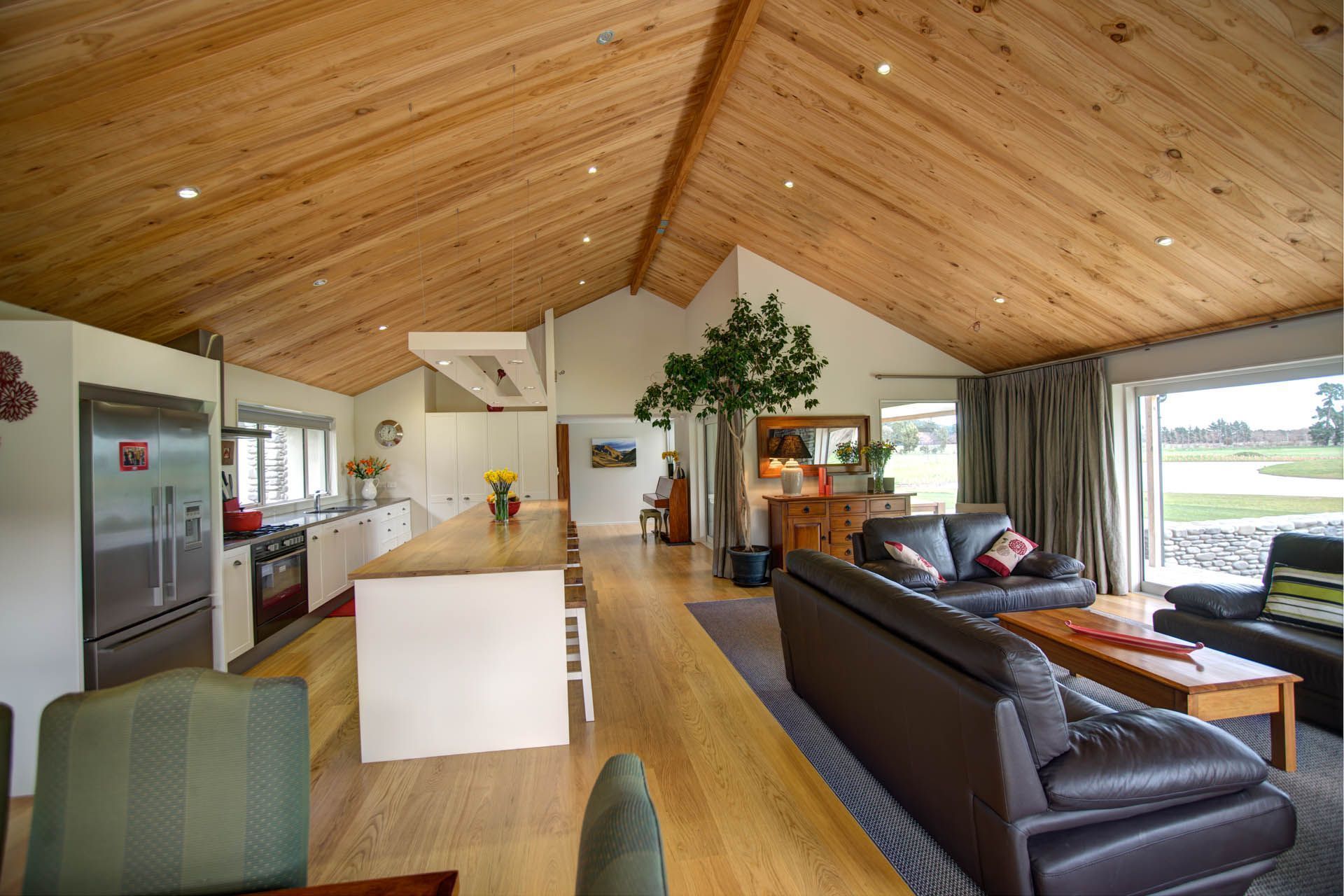 ArchiPro Project Summary - Tai Tapu: A spacious country hideaway featuring a vaulted timber ceiling, Waimakariri Stone fire surround, open-style kitchen, and a strategically designed wraparound verandah for optimal thermal comfort throughout the seasons.