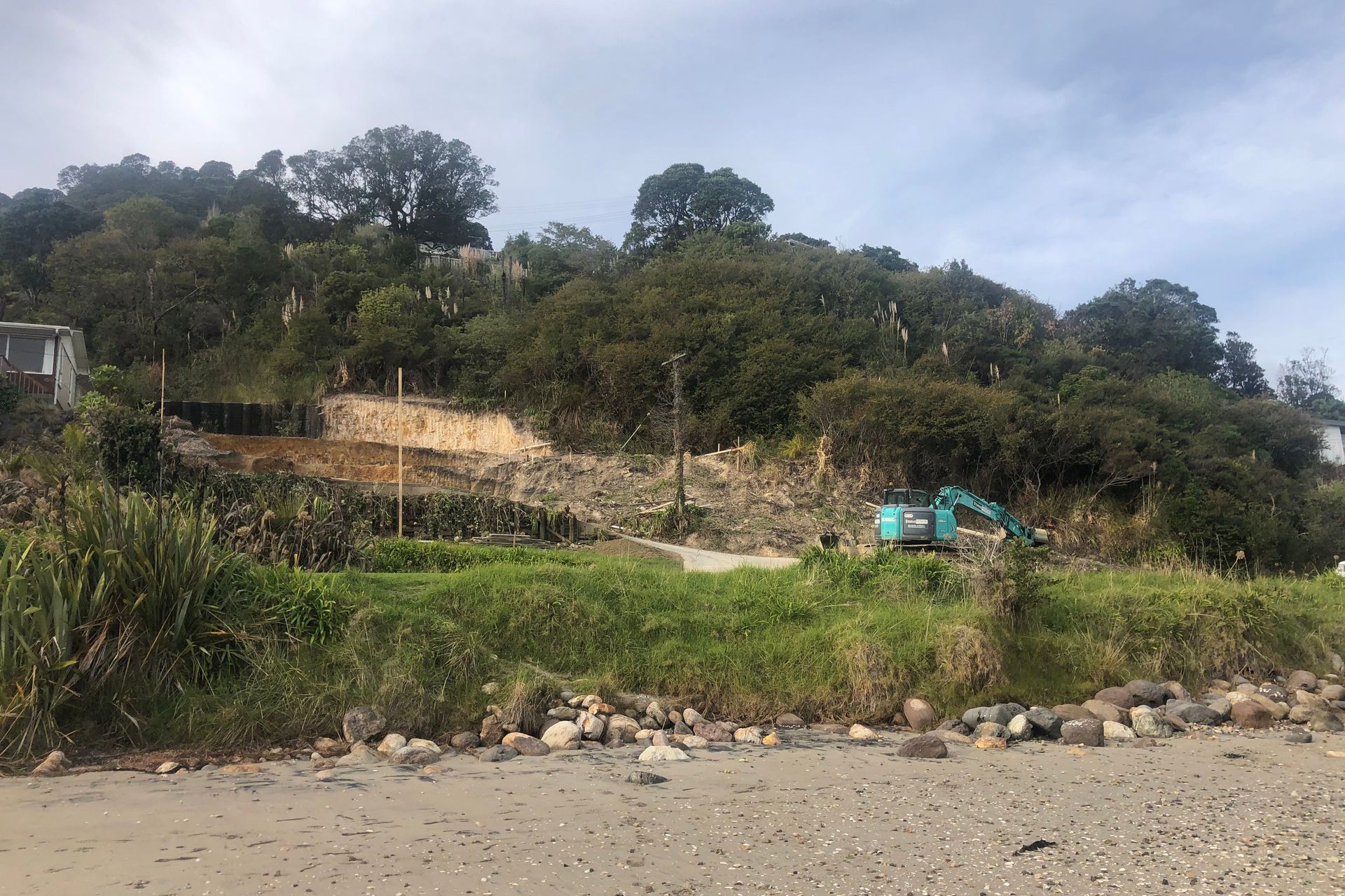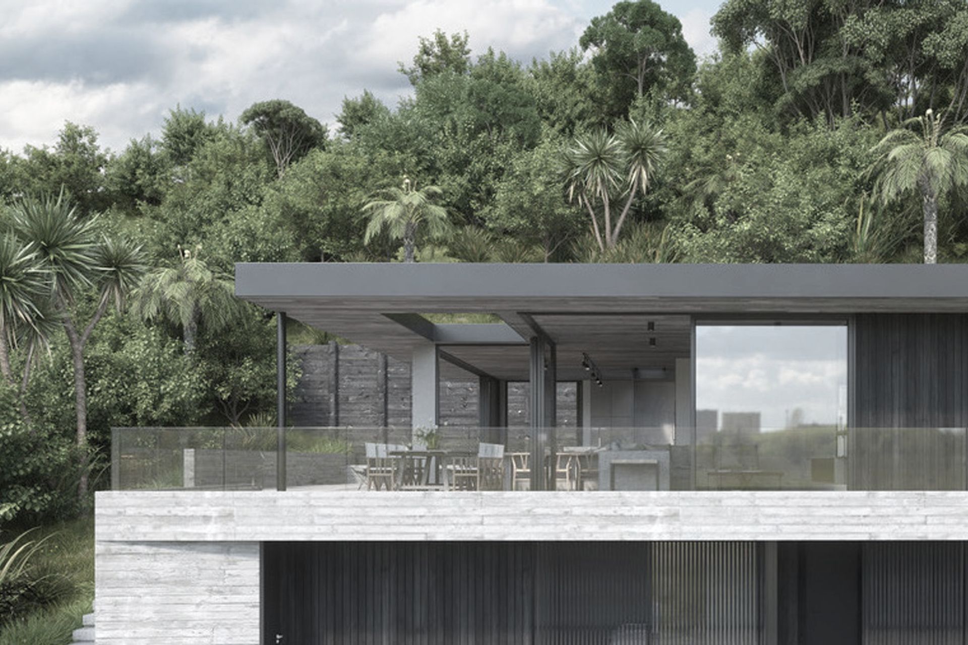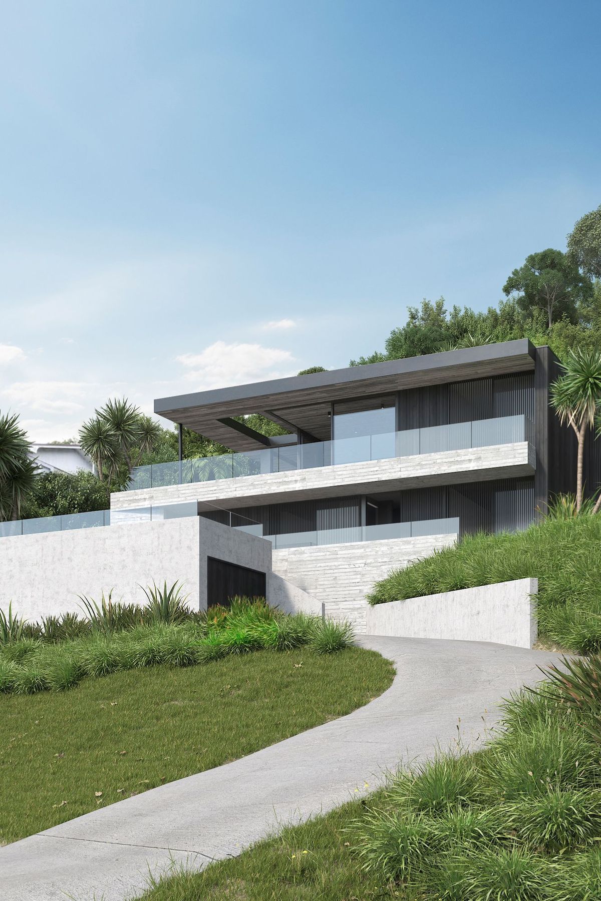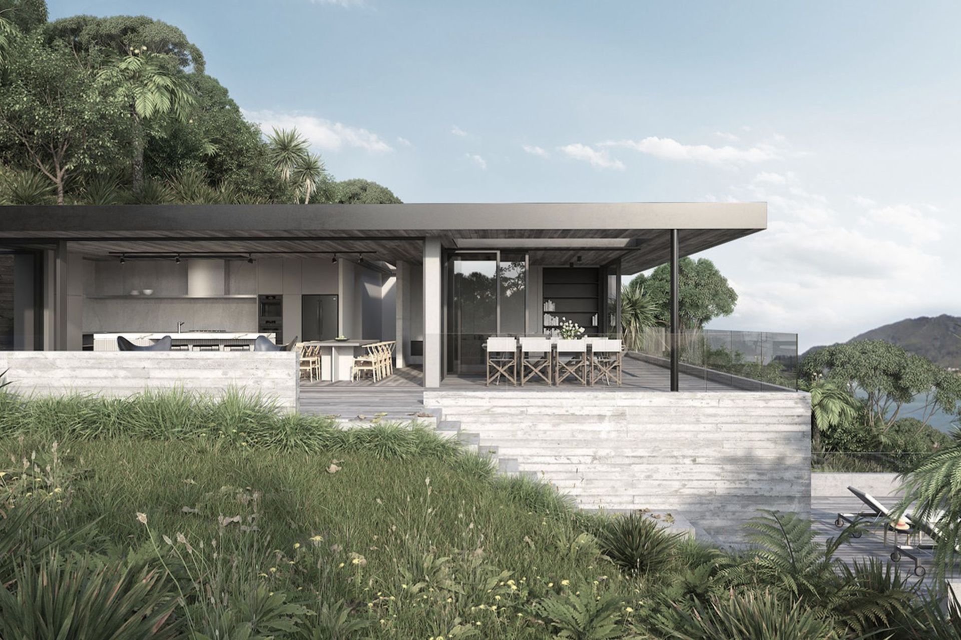 ArchiPro Project Summary - A stunning three-level residence on Paku Hill, Tairua, featuring expansive entertaining spaces, a blend of black stained Accoya shiplap and Insitu concrete, and innovative sliding vertical slat screens for privacy and shading.