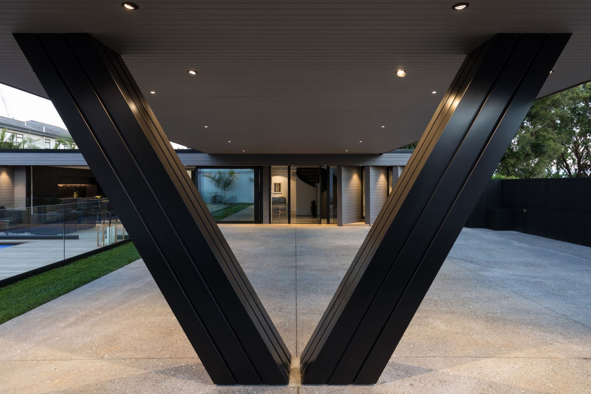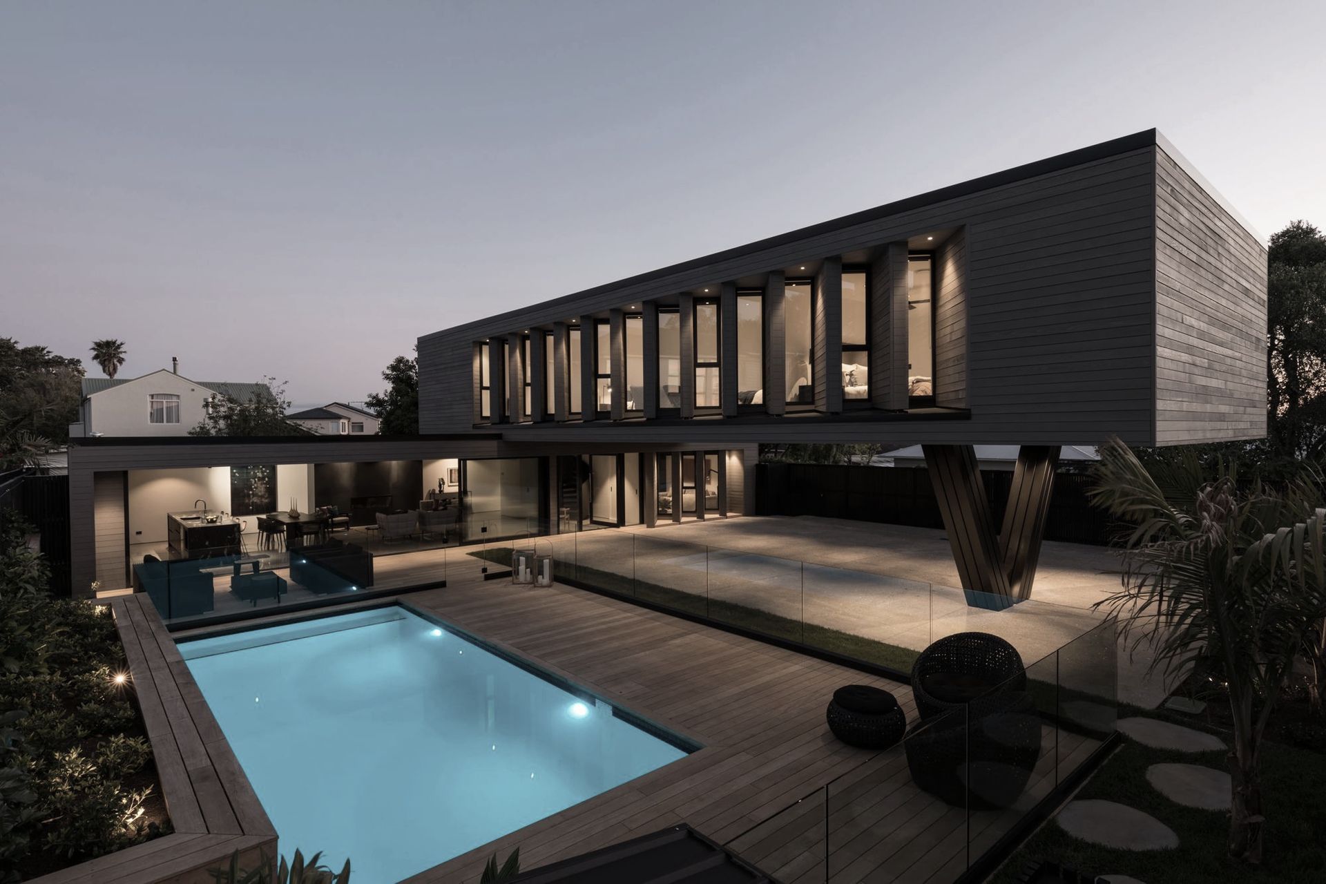 ArchiPro Project Summary - The Takapuna Home is a luxurious villa featuring a beautiful outdoor structure, a serene courtyard, and a spacious swimming pool, all surrounded by lush palm trees.