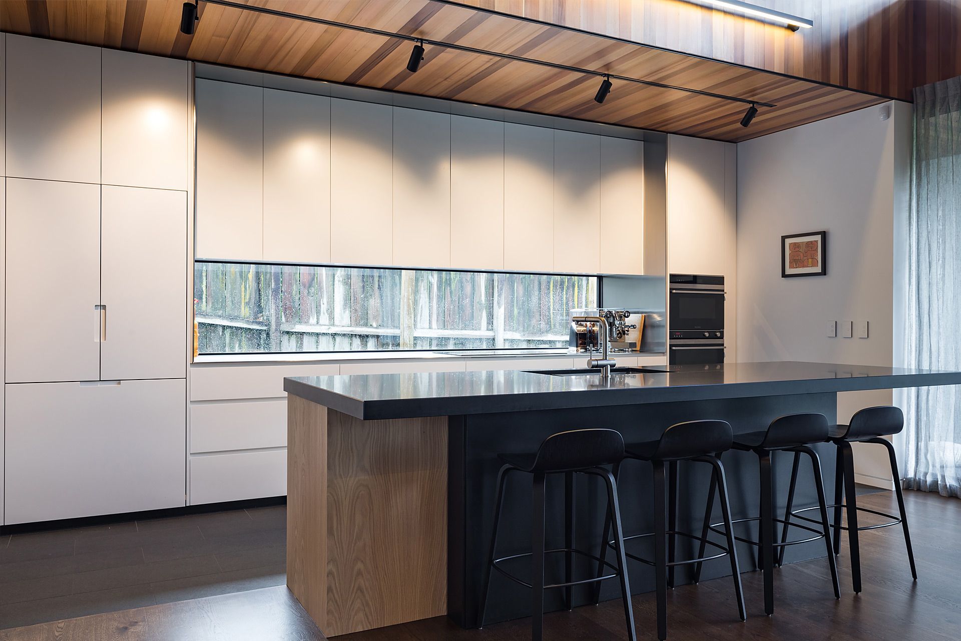ArchiPro Project Summary - Contemporary kitchen design by Herbst Architects featuring seamless cabinetry, a striking black granite island, and high-quality finishes from Blum and Fisher and Paykel.