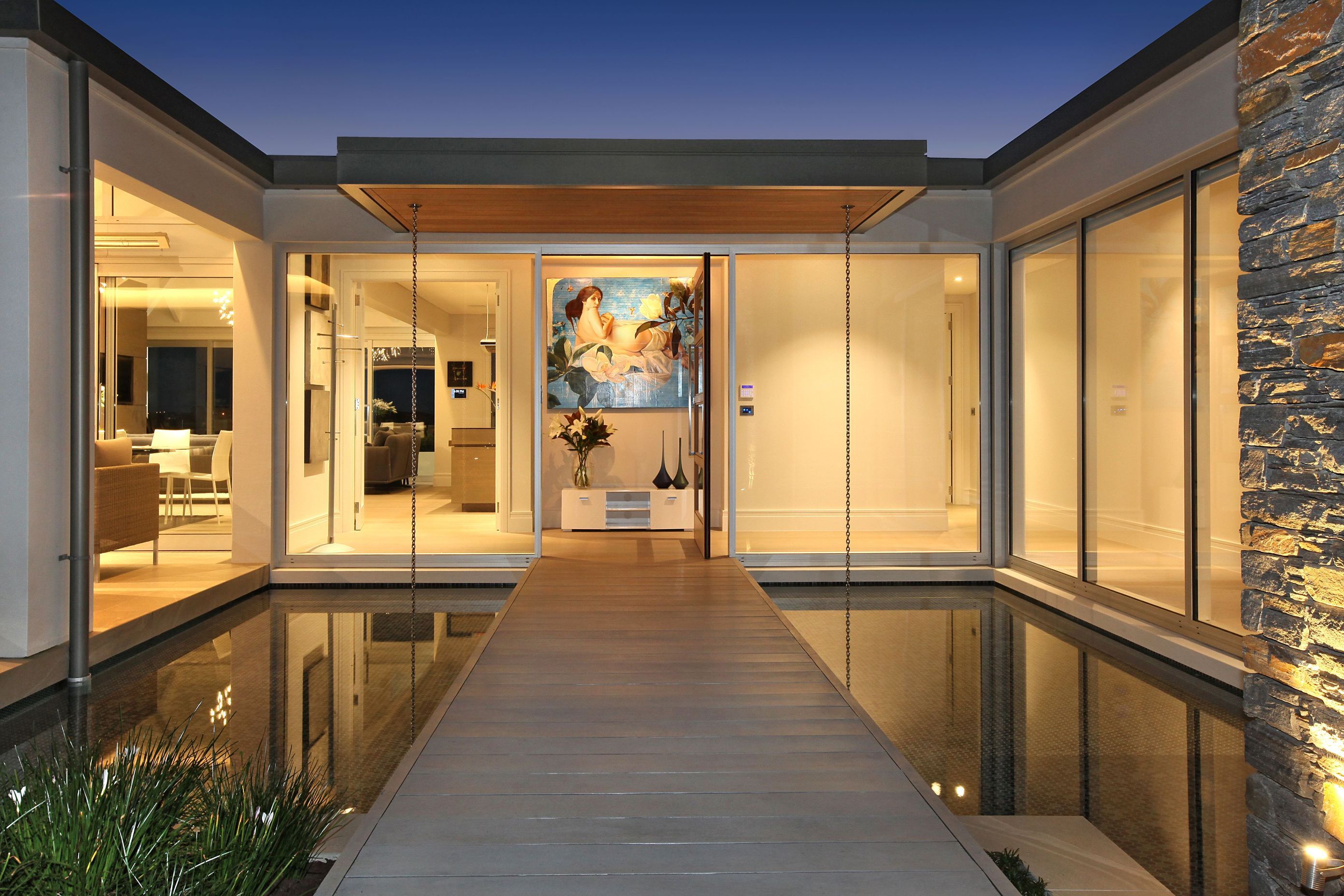ArchiPro Project Summary - Award-winning luxury home featuring three bedrooms, four bathrooms, multiple living areas, and stunning views of Lake Pupuke, connected by a timber walkway and elegant reflection pond.
