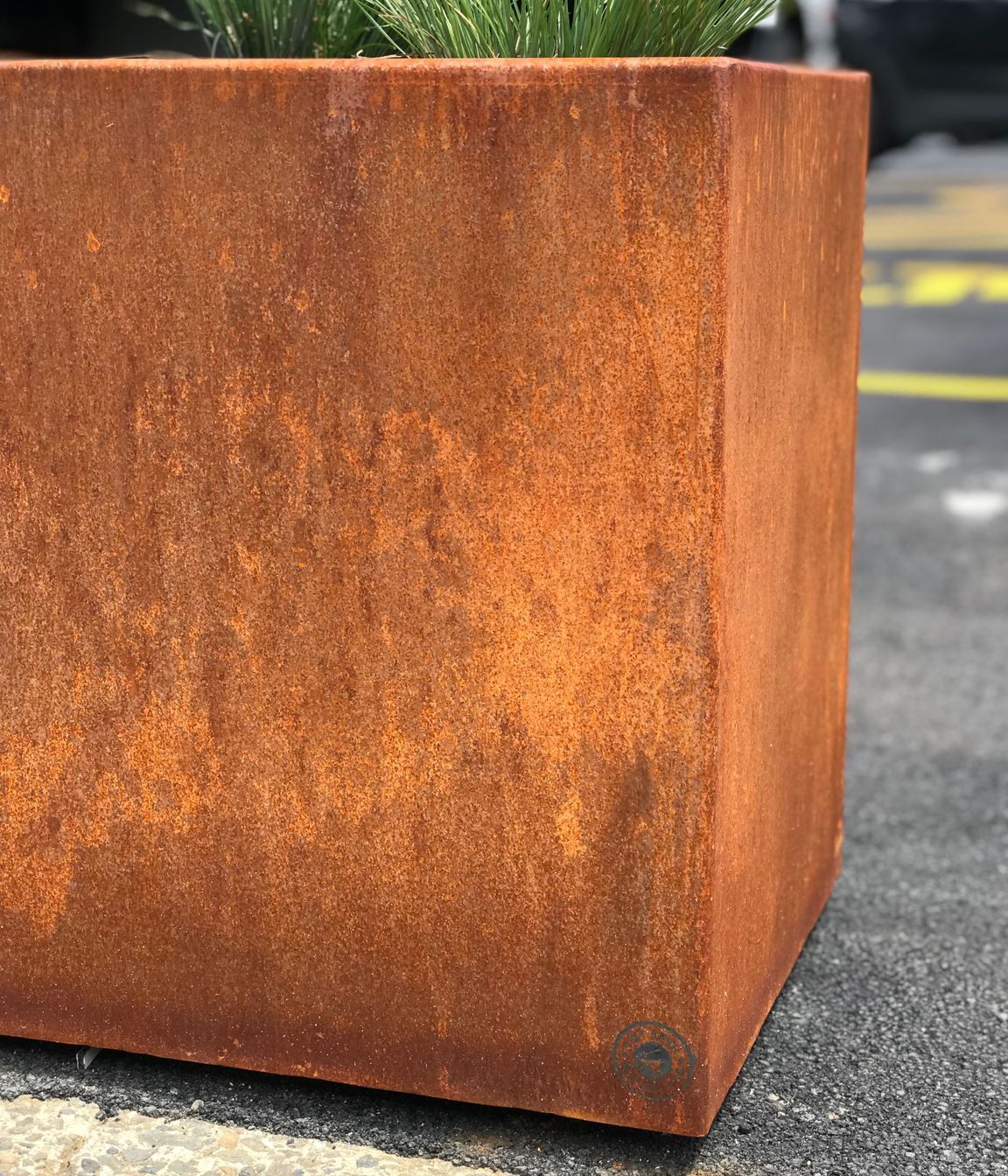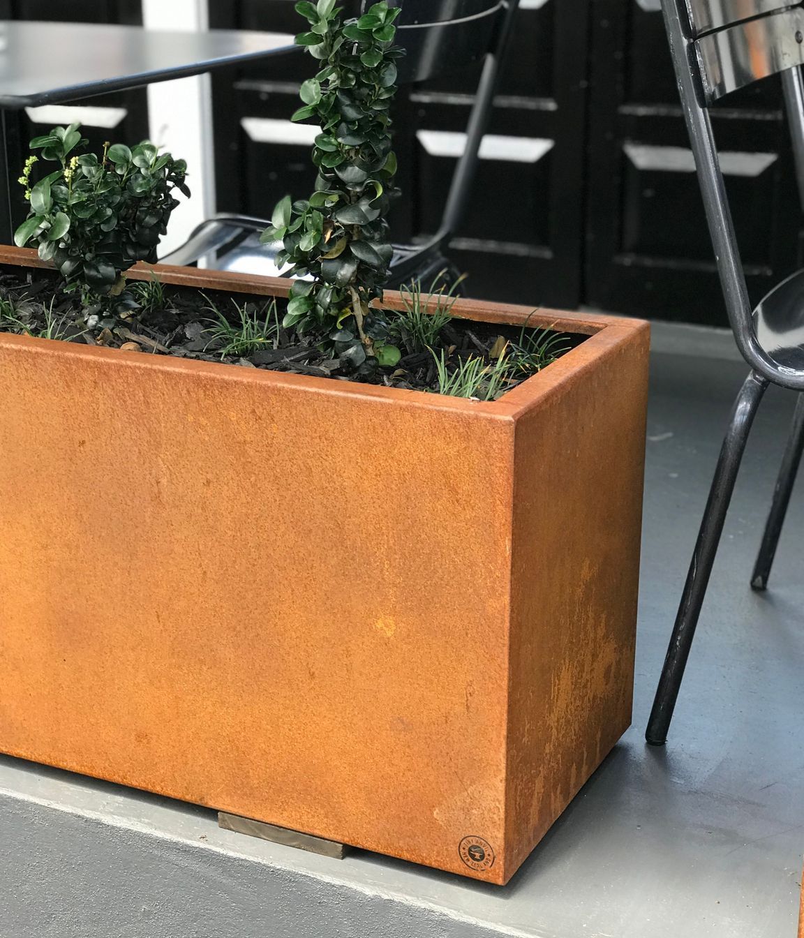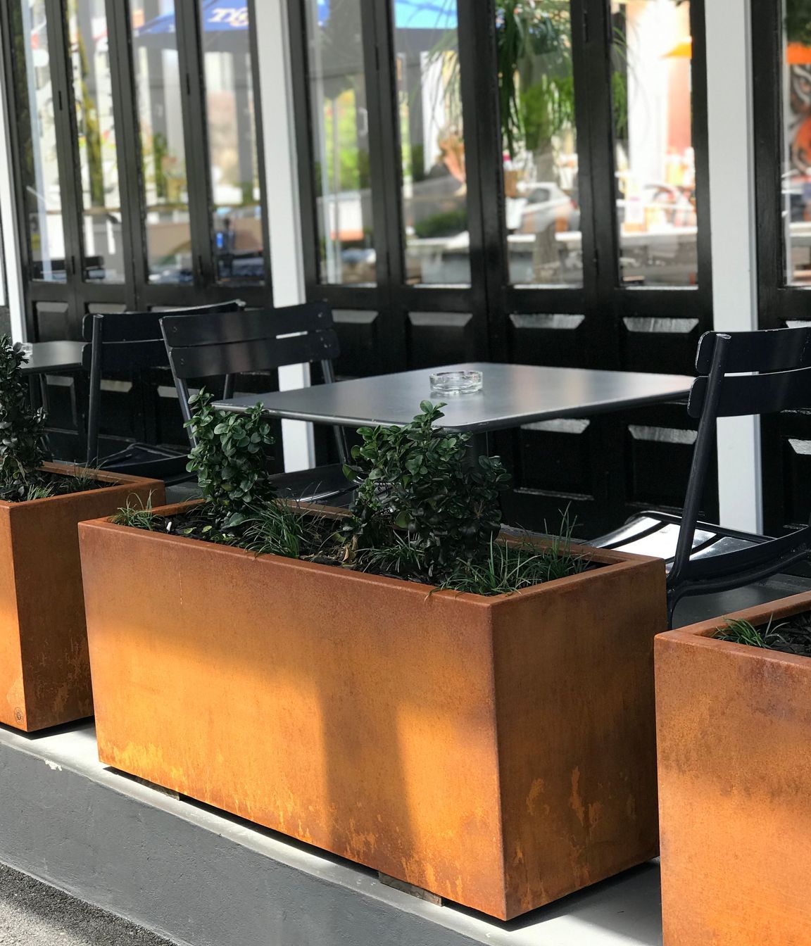 ArchiPro Project Summary - Corten steel planters enhance the aesthetic appeal of a low deck for a Takapuna restaurant, providing a stylish border solution that maintains and elevates the premium look desired by the owner and developer.