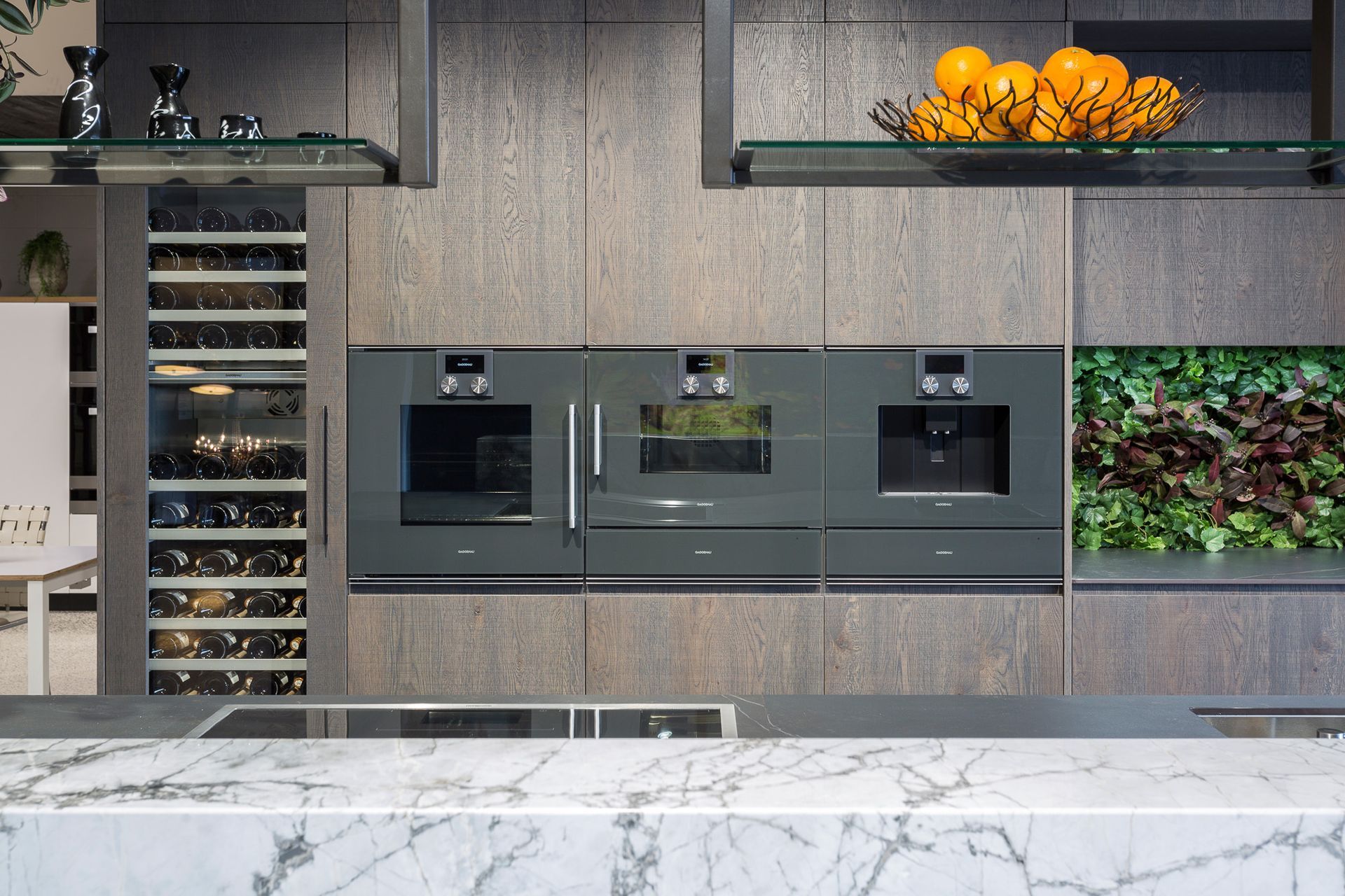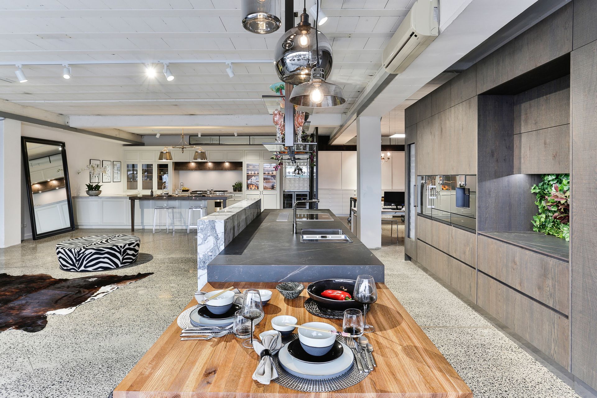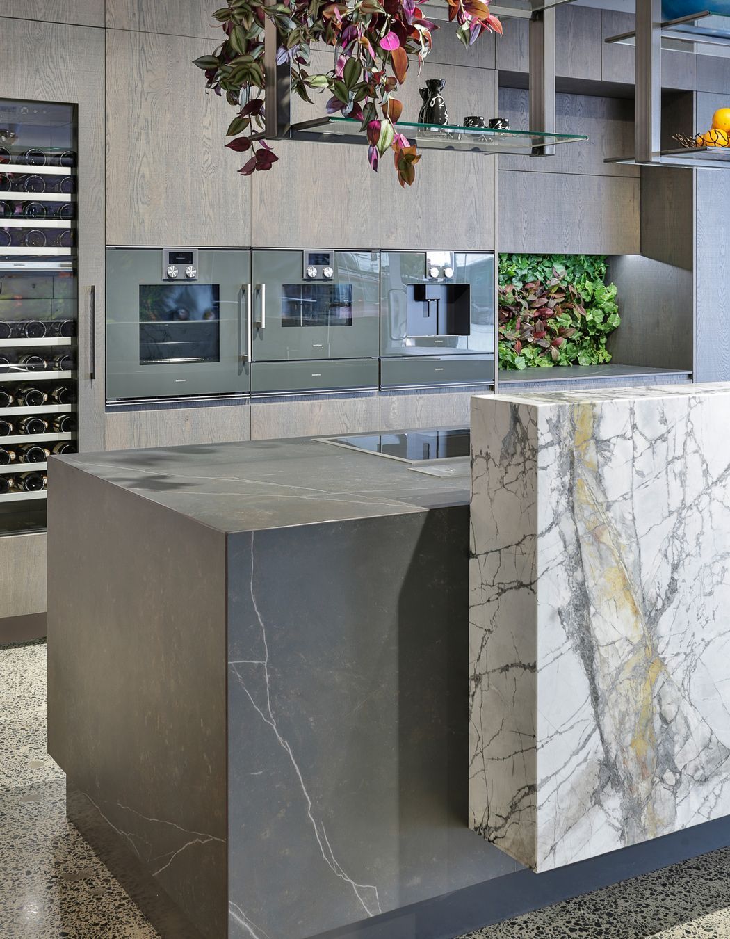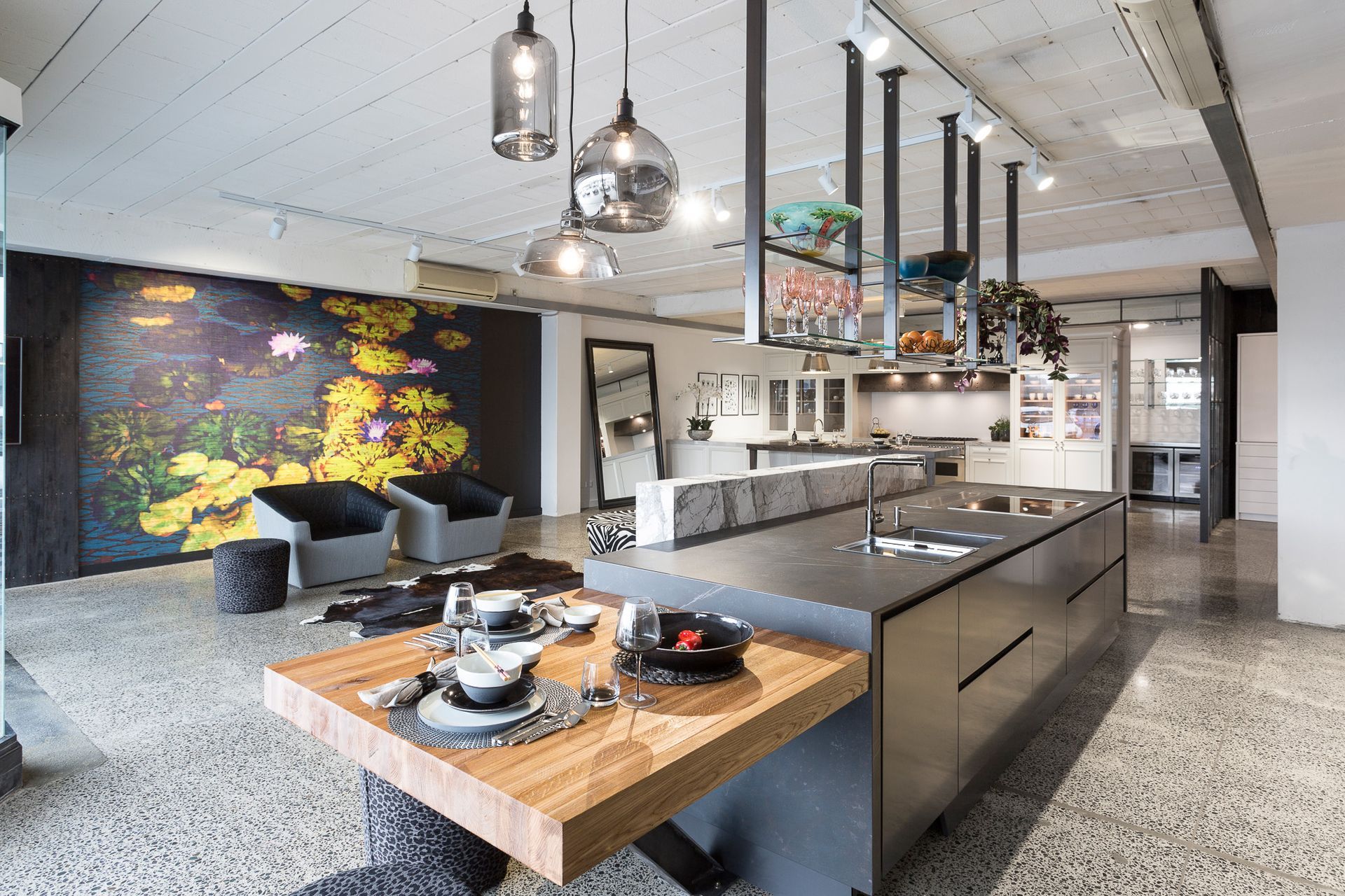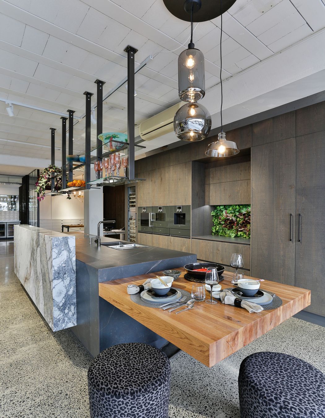 ArchiPro Project Summary - A modern showroom kitchen designed as a 'living kitchen', featuring functional zones, clean lines, innovative materials, and top-end Gaggenau appliances for a comfortable and stylish family environment.