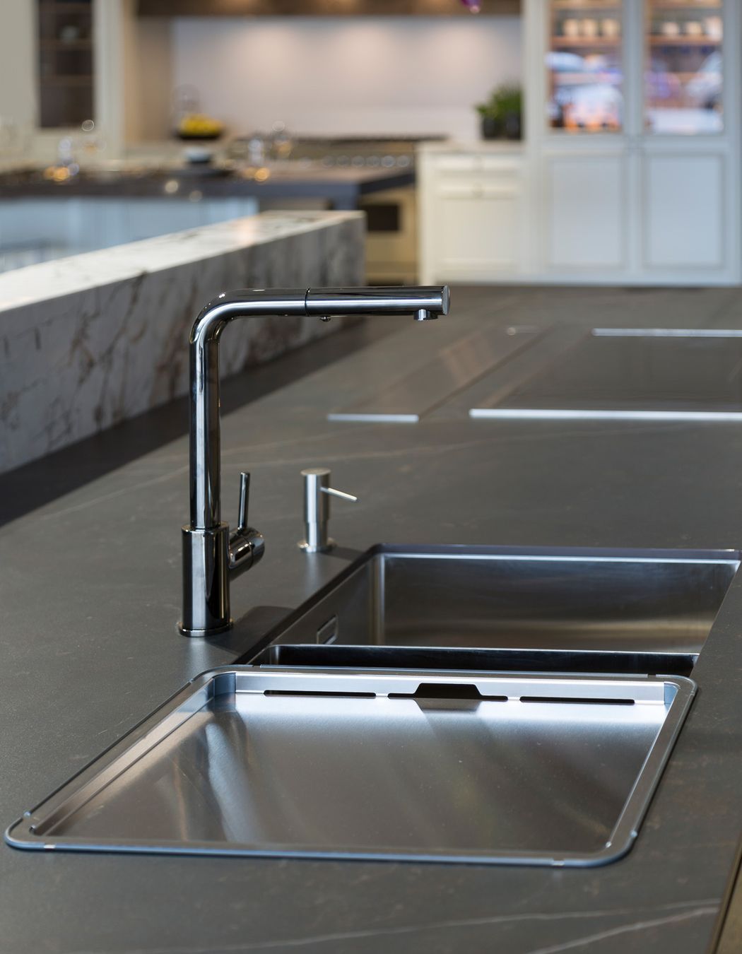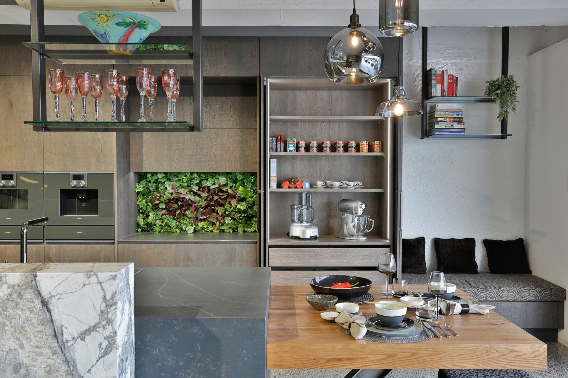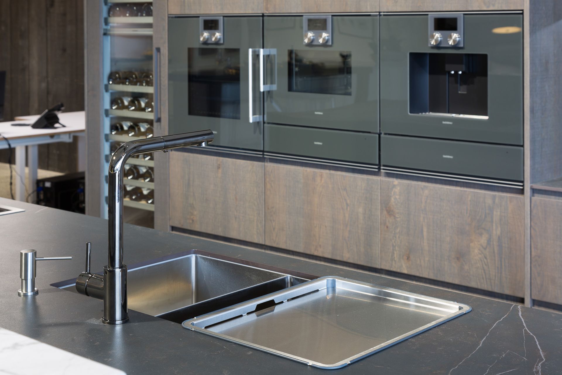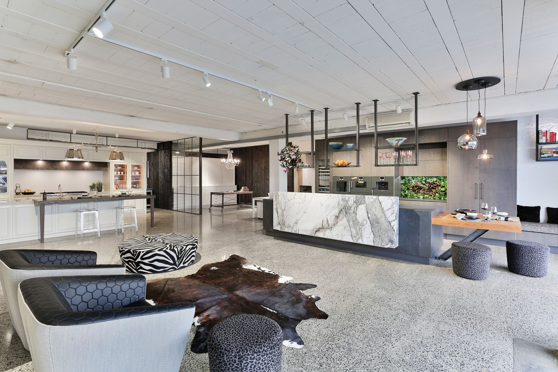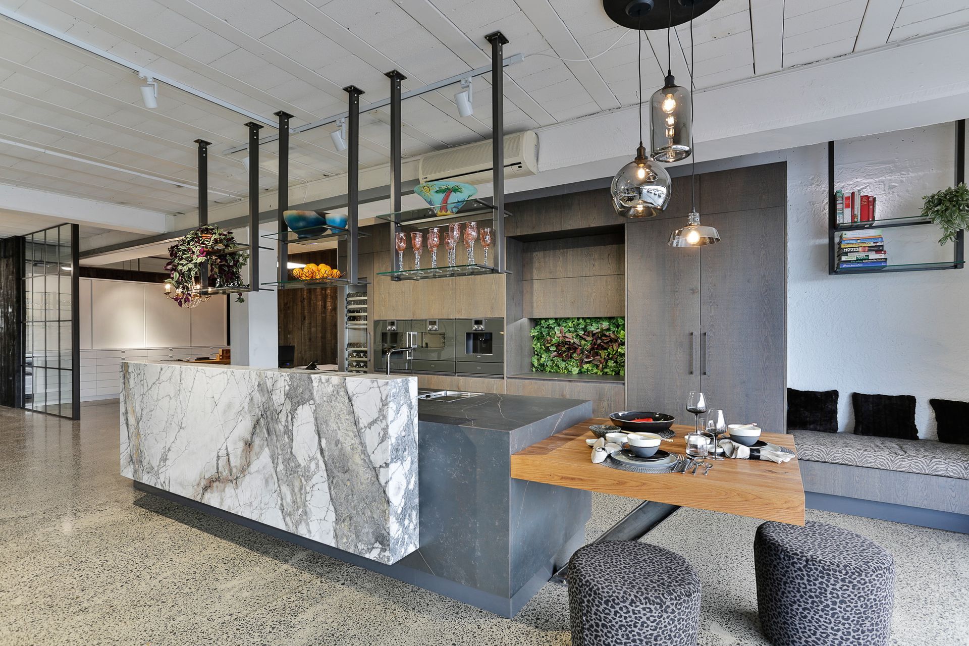 ArchiPro Project Summary - A modern showroom kitchen designed as a 'living kitchen', featuring functional zones, clean lines, innovative materials, and top-end Gaggenau appliances for a comfortable and stylish family environment.