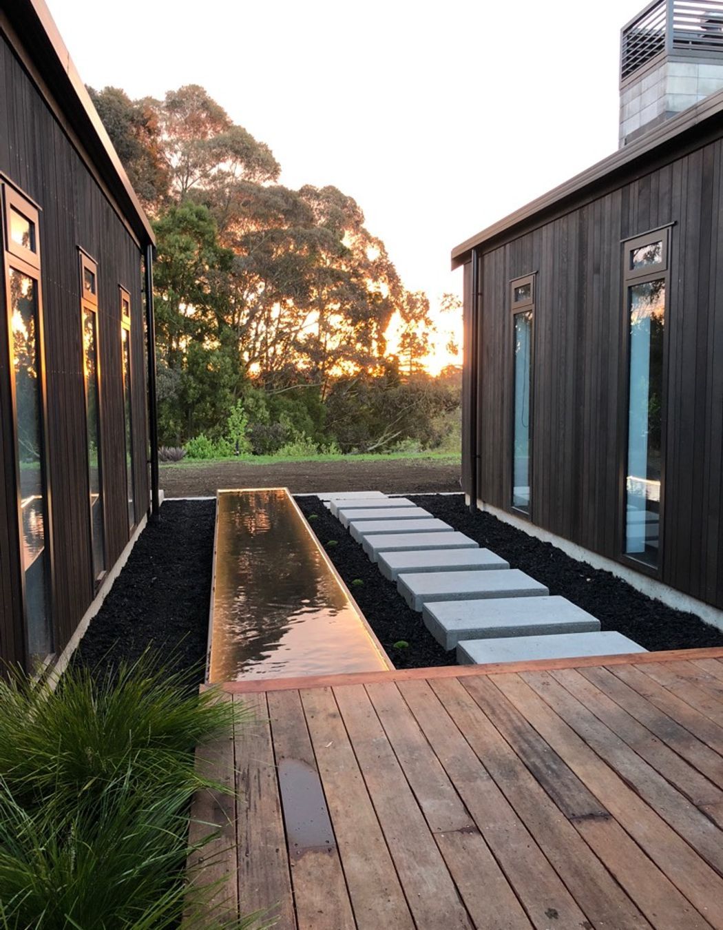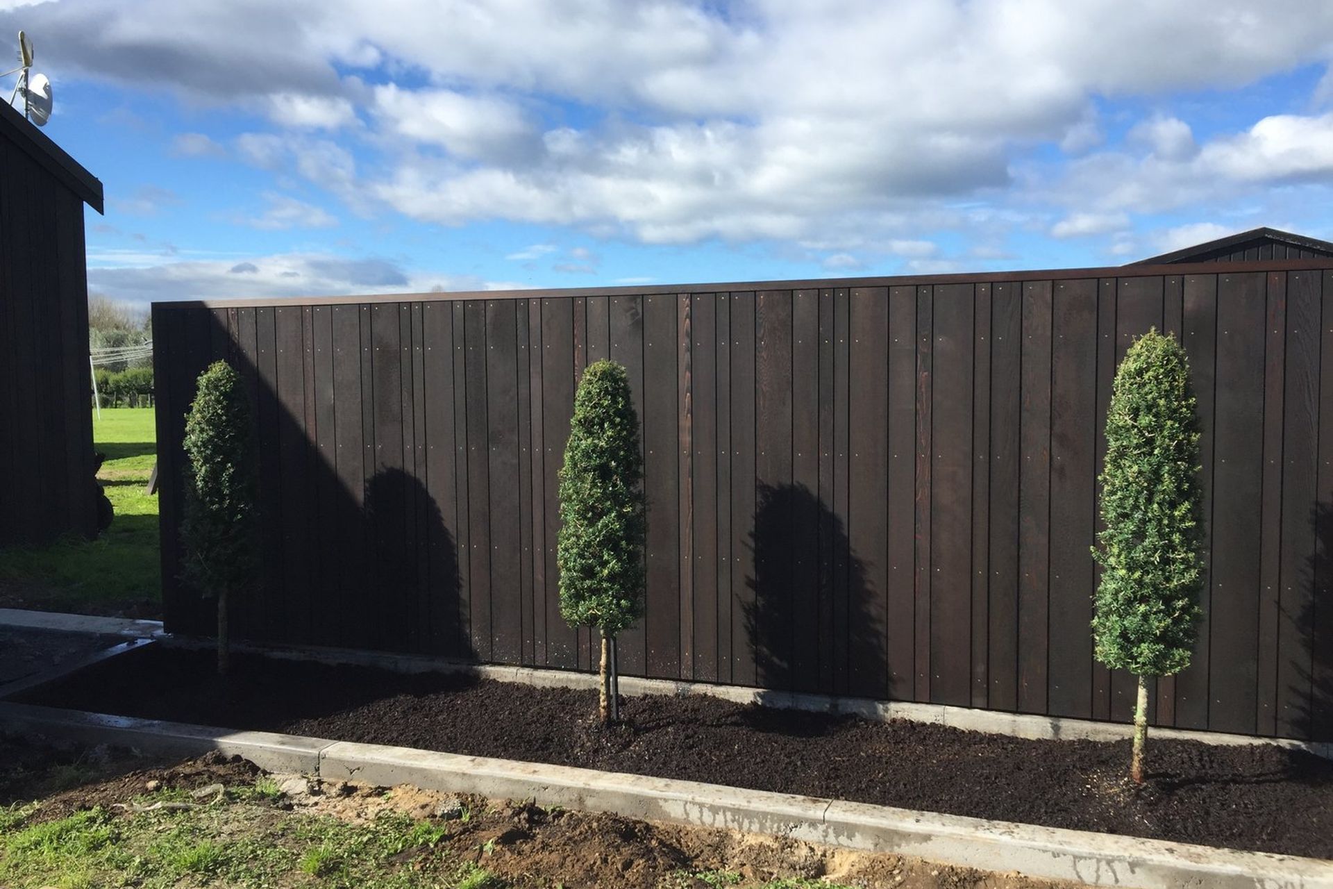 ArchiPro Project Summary - Stage one of the Tamahere landscaping project features bank planting, a cedar wall, kwila decking, lawn preparation and seeding, a corten pond, and a steel fin feature wall.