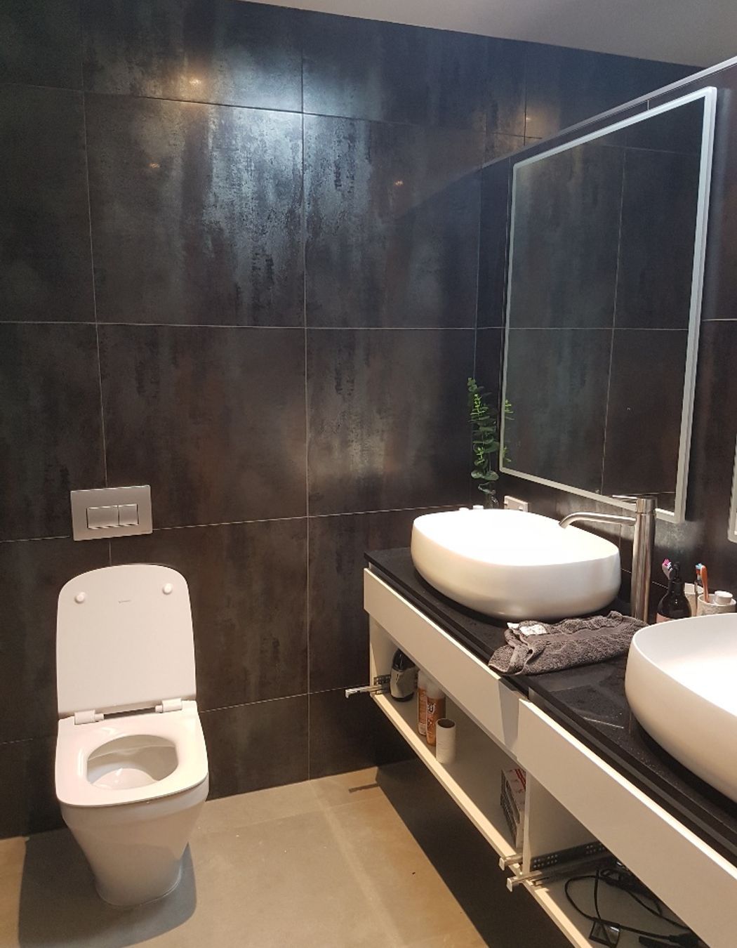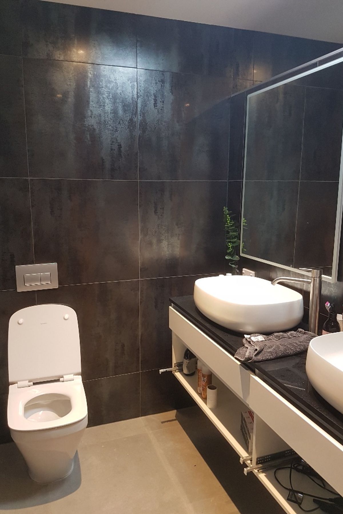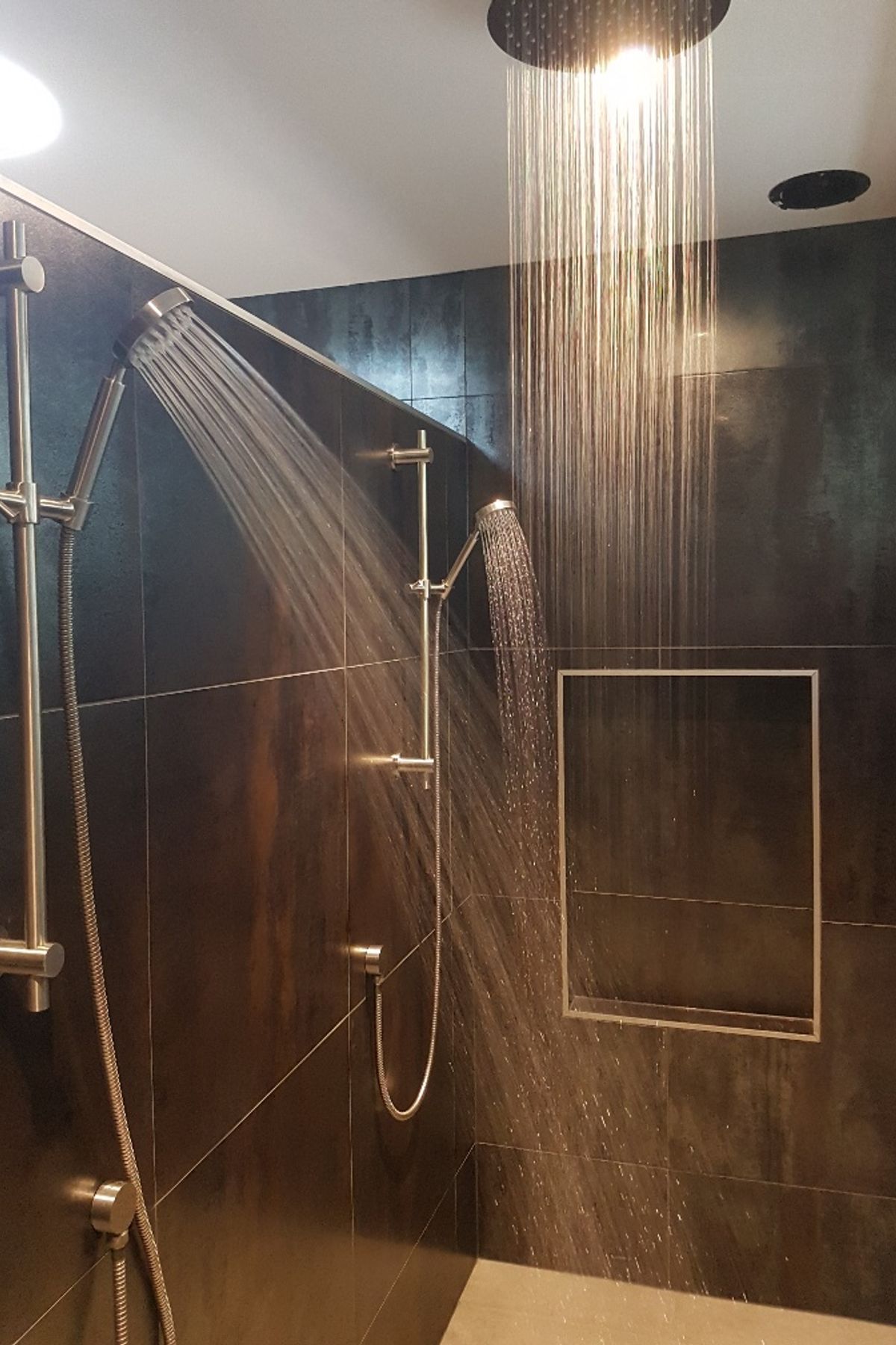 ArchiPro Project Summary - Comprehensive renovation of two 1960s bathrooms featuring full floor-to-ceiling stone tiling, upgraded plumbing, underfloor heating, Italian fittings, and mood lighting for a contemporary aesthetic.