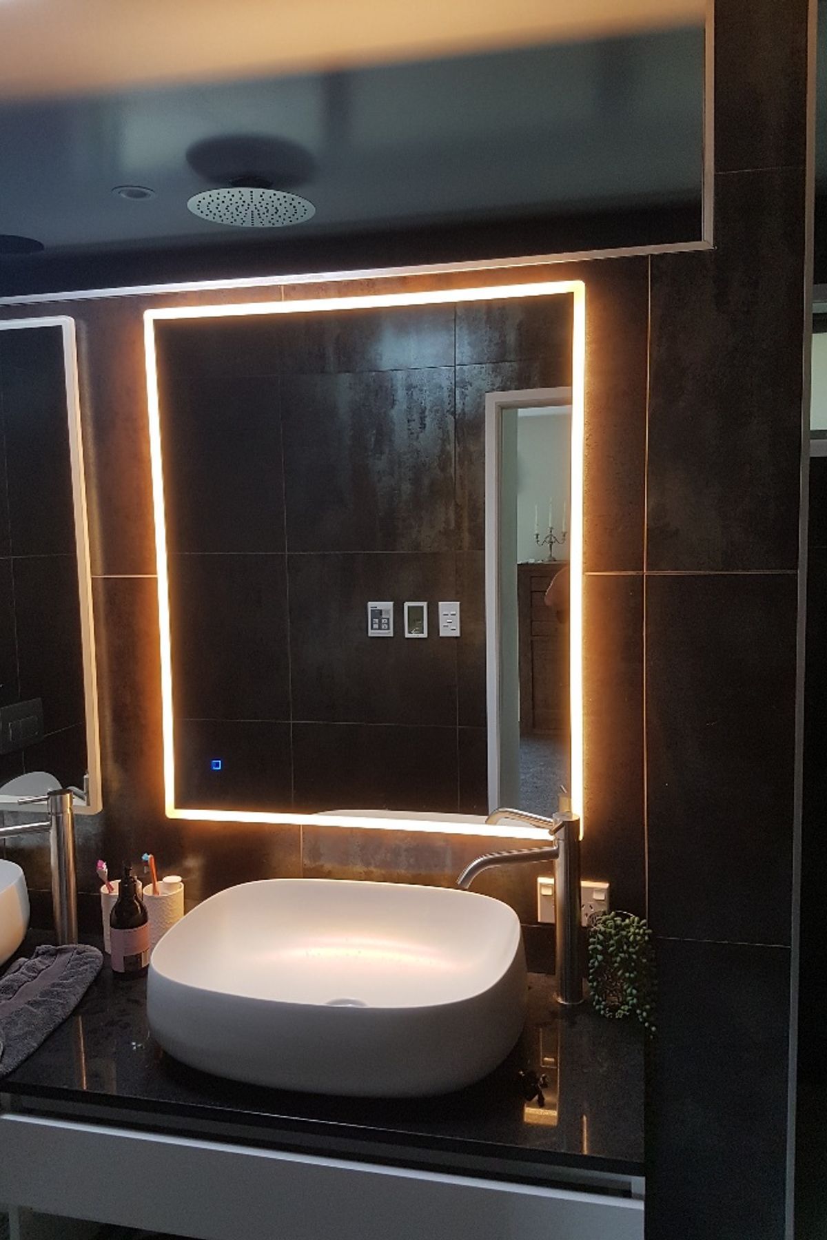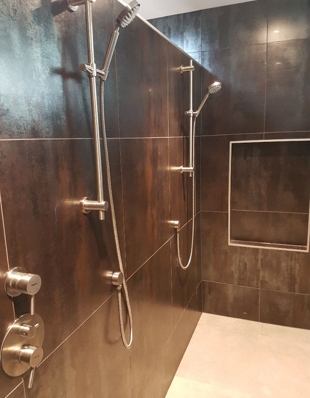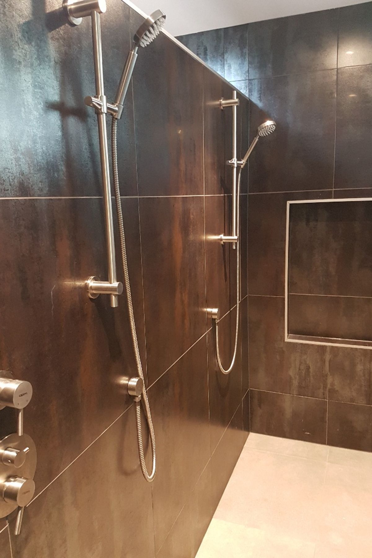 ArchiPro Project Summary - Comprehensive renovation of two 1960s bathrooms featuring full floor-to-ceiling stone tiling, upgraded plumbing, underfloor heating, Italian fittings, and mood lighting for a contemporary aesthetic.