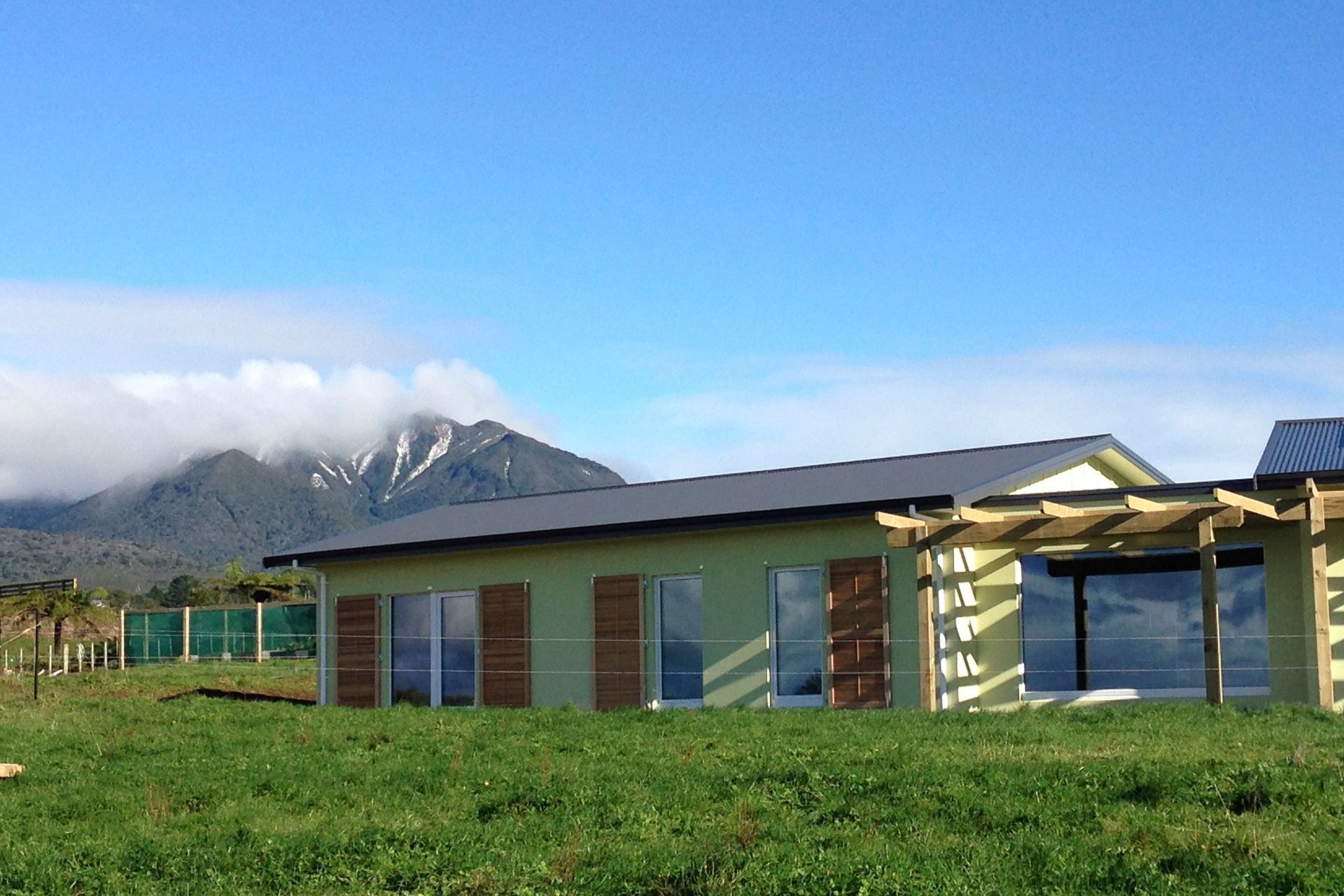 ArchiPro Project Summary - Classic passive house designed for comfort and warmth, featuring advanced insulation and ecological systems, set against the stunning backdrop of Mount Taranaki, completed in 2012.