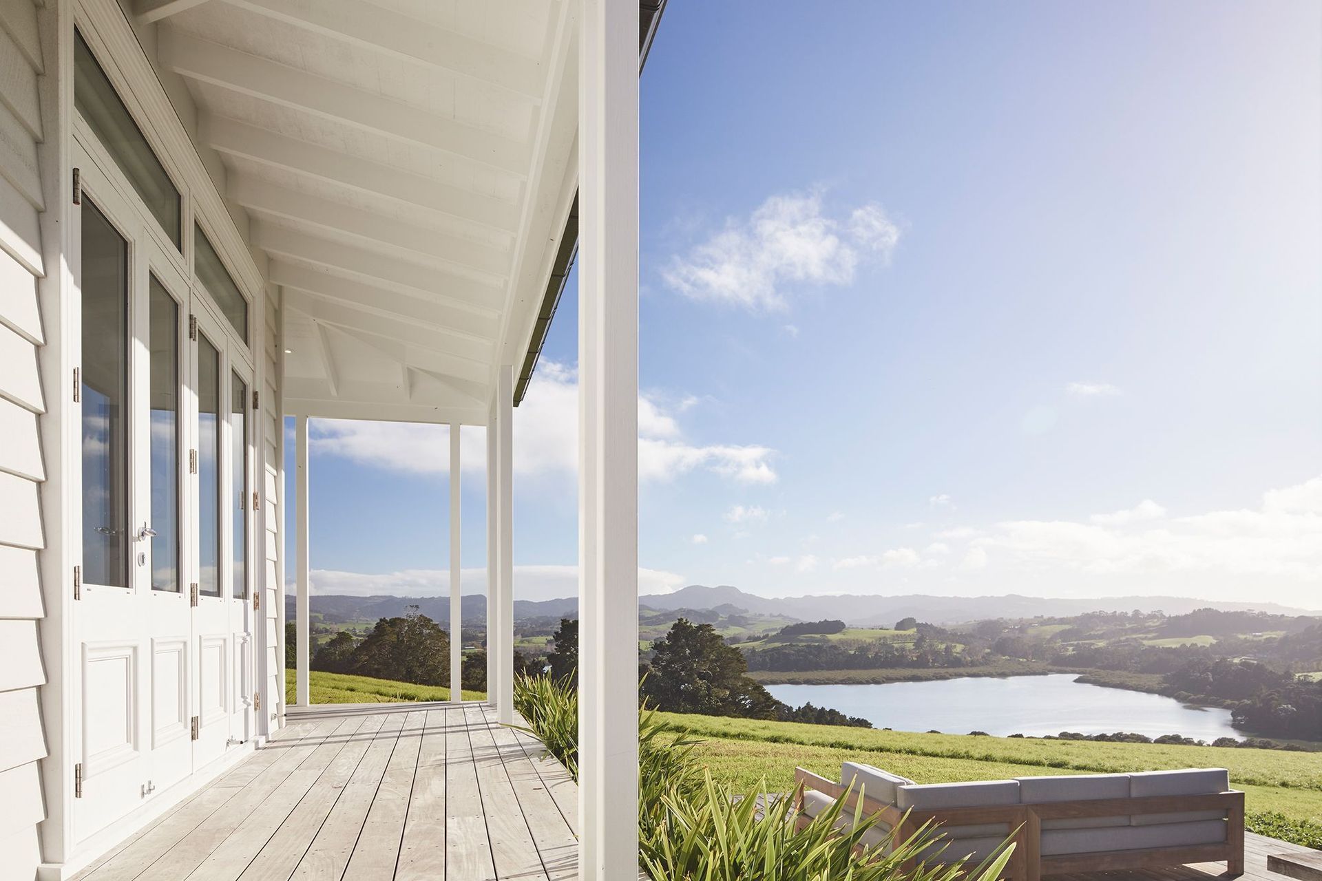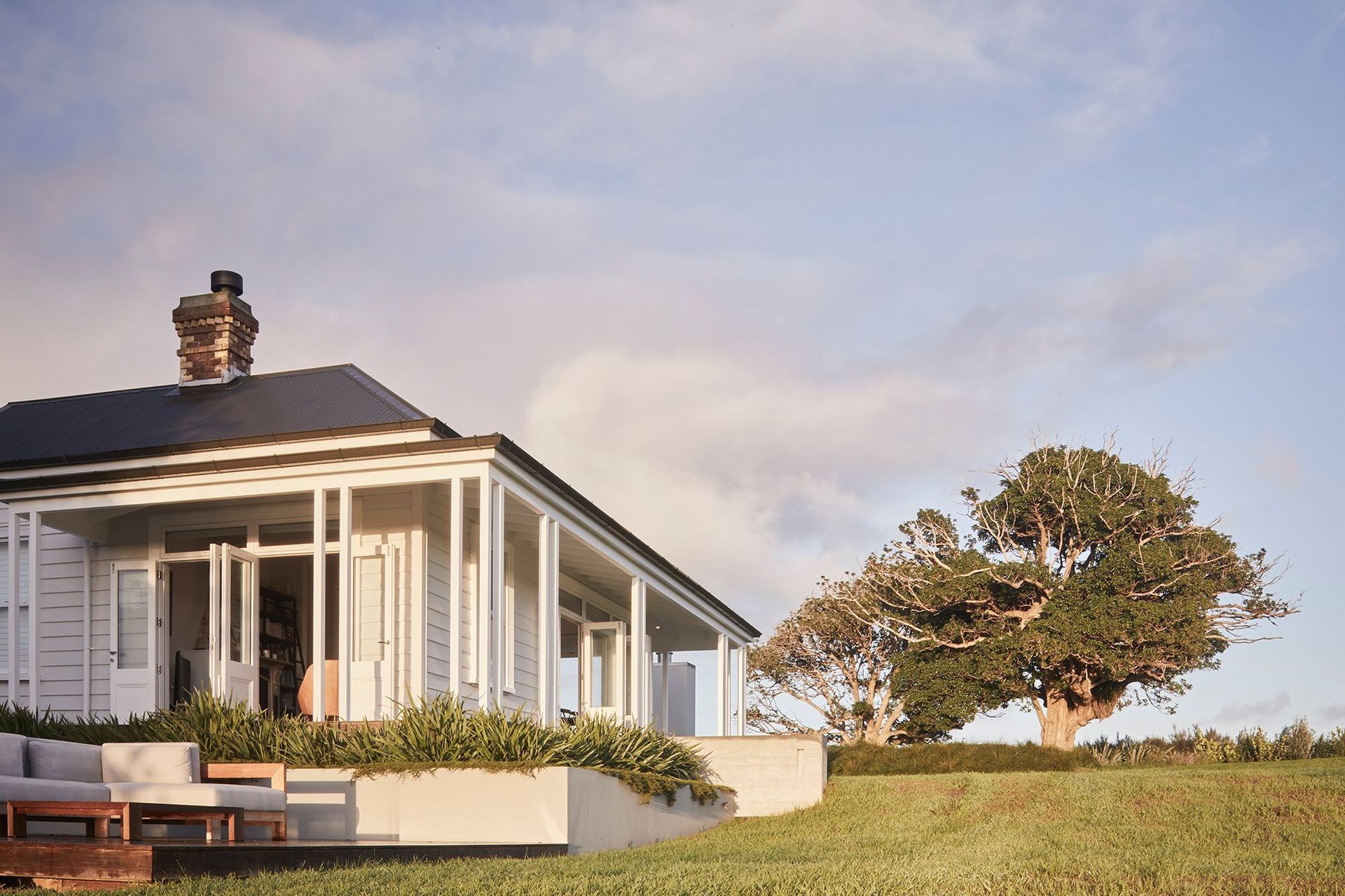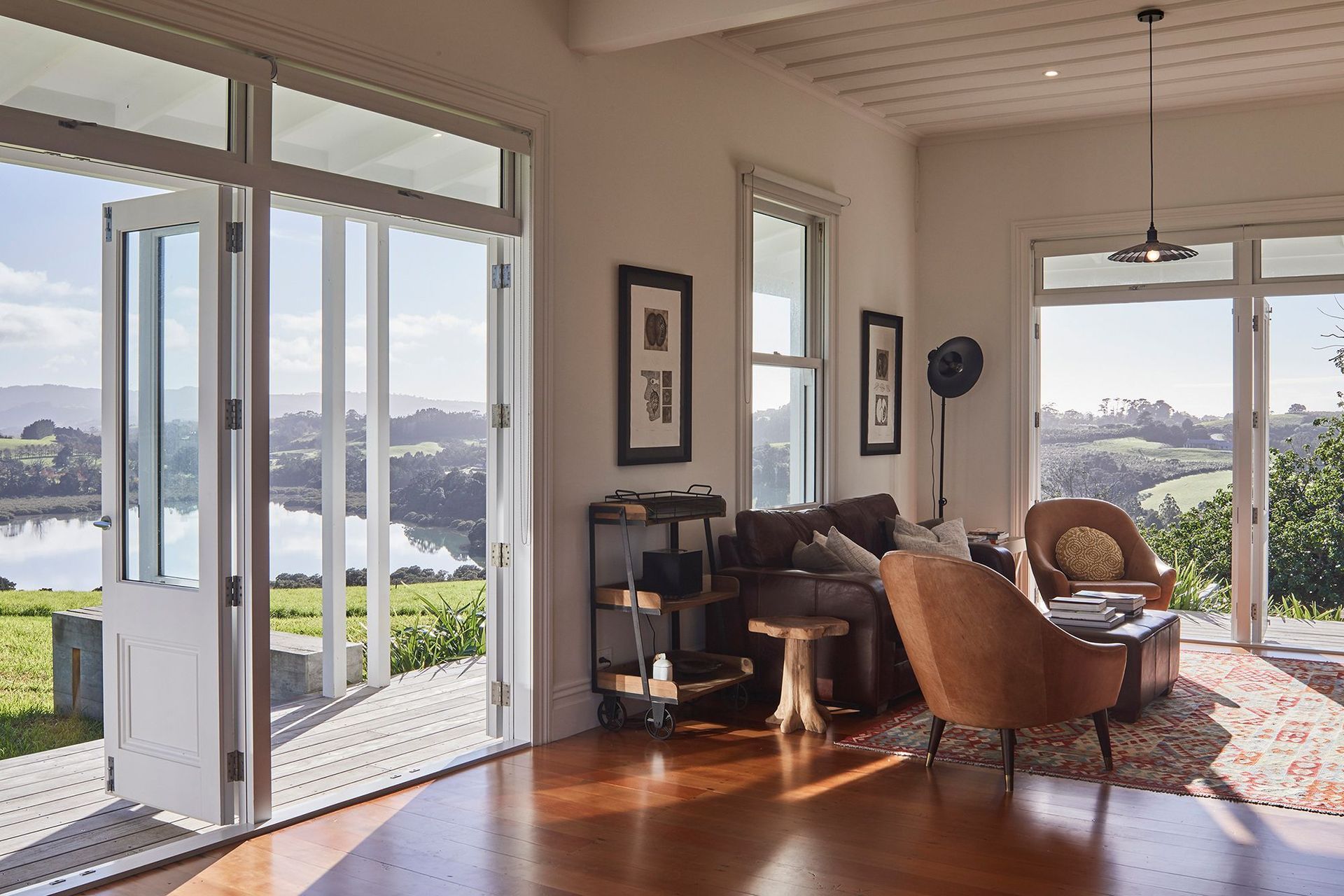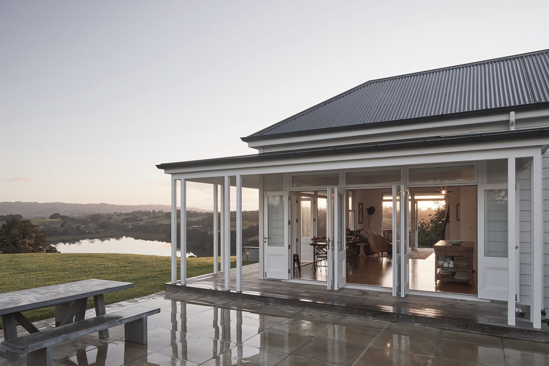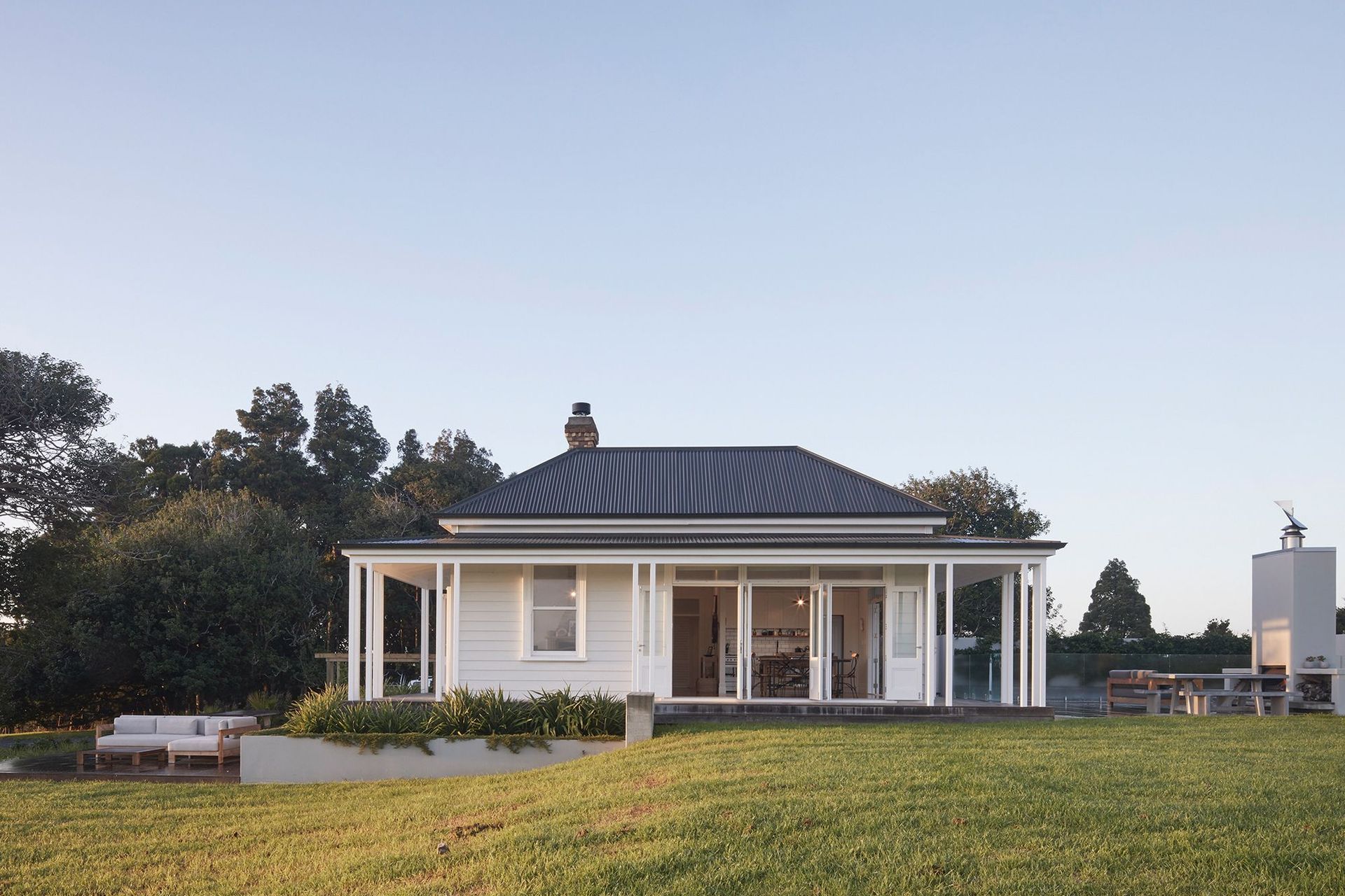 ArchiPro Project Summary - Restored 1800s Tawharanui Villa featuring a wrap-around verandah, outdoor entertaining area, and swimming pool, set on a stunning north-facing site overlooking the Matakana River.