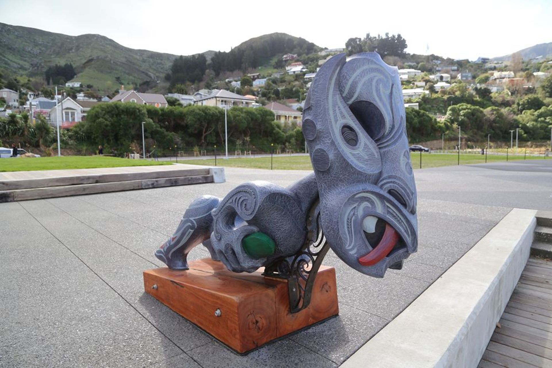 - large-scale promenade patterning with cultural references, using materials that relate to the area. The paving pattern reflects aramoana (pathway of the sea) and patterns of stylised zig-zag waves similar to those found on the wharenui Wheke at Rapaki Marae. These patterns dissipate as they move inland and become gravel paths;