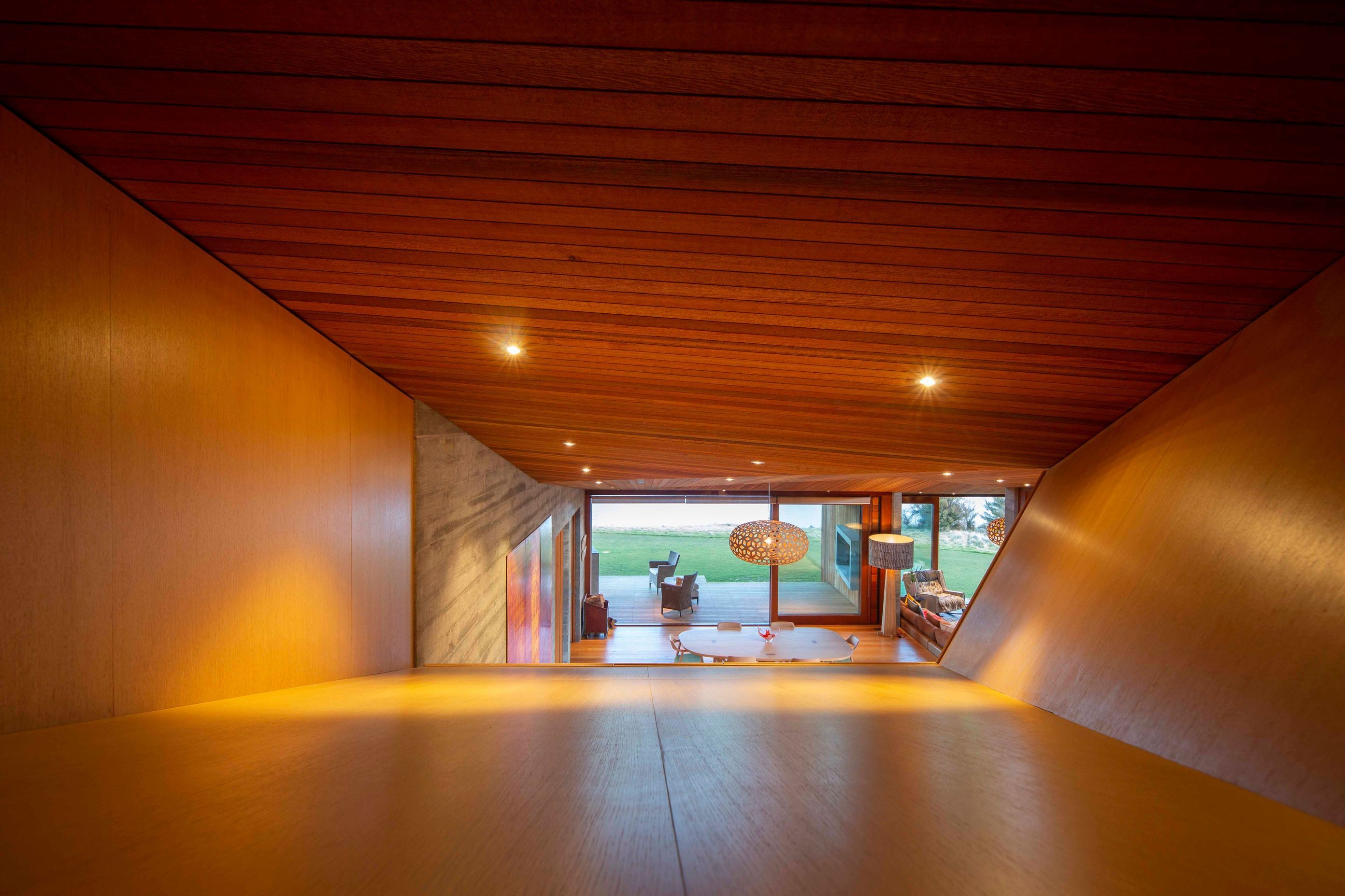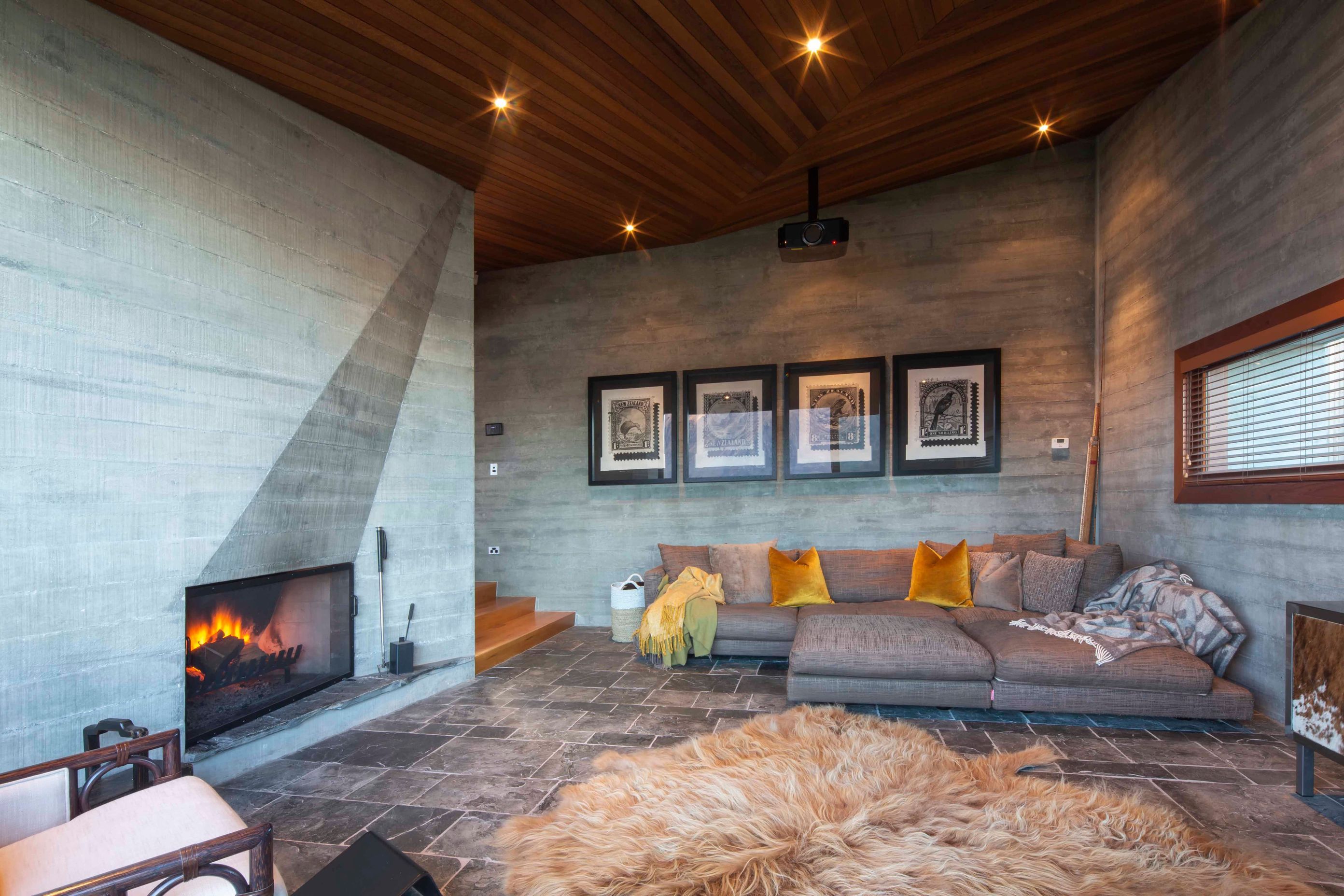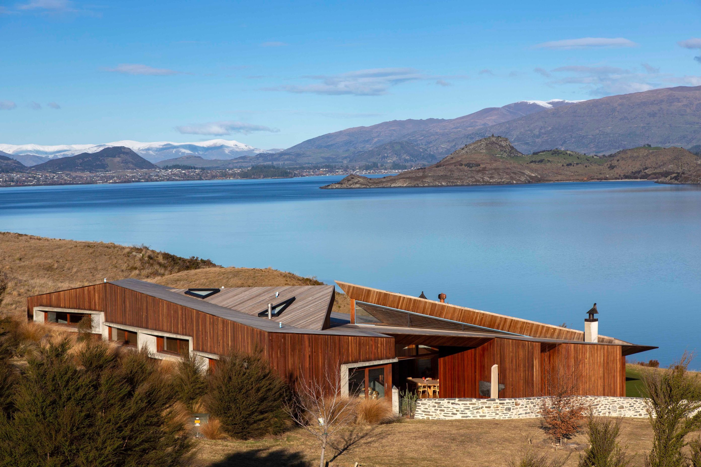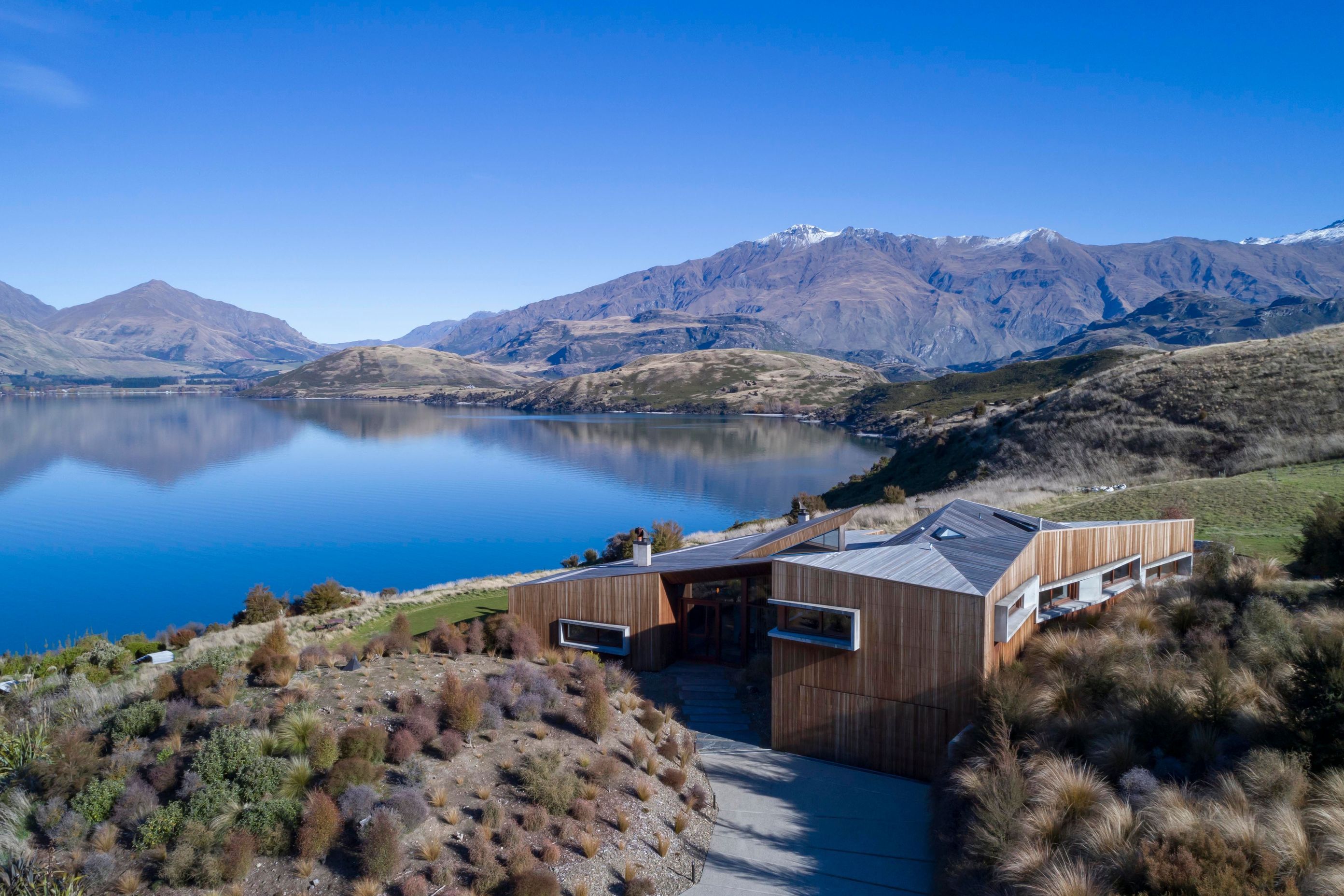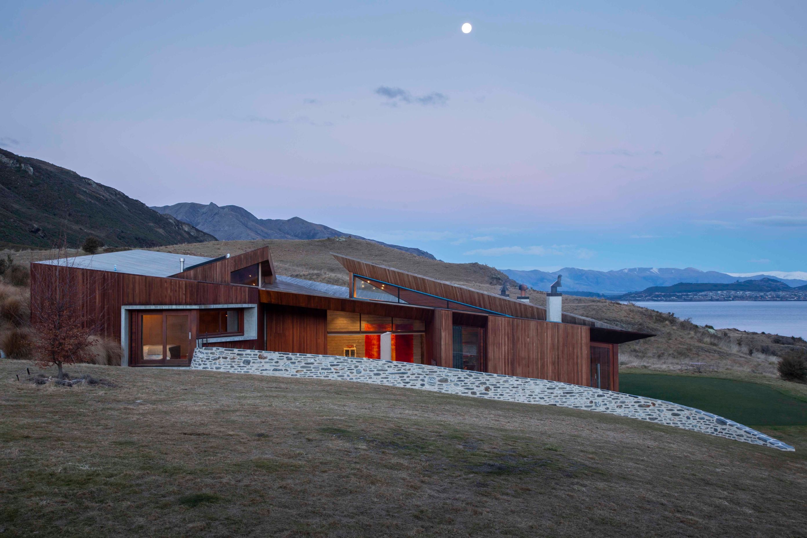 ArchiPro Project Summary - Award-winning architectural design featuring triangulated geometries and origami-like forms, crafted from pre-cast concrete and complemented by a cedar rain-screen, harmonizing with the stunning mountainous landscape of Wanaka.