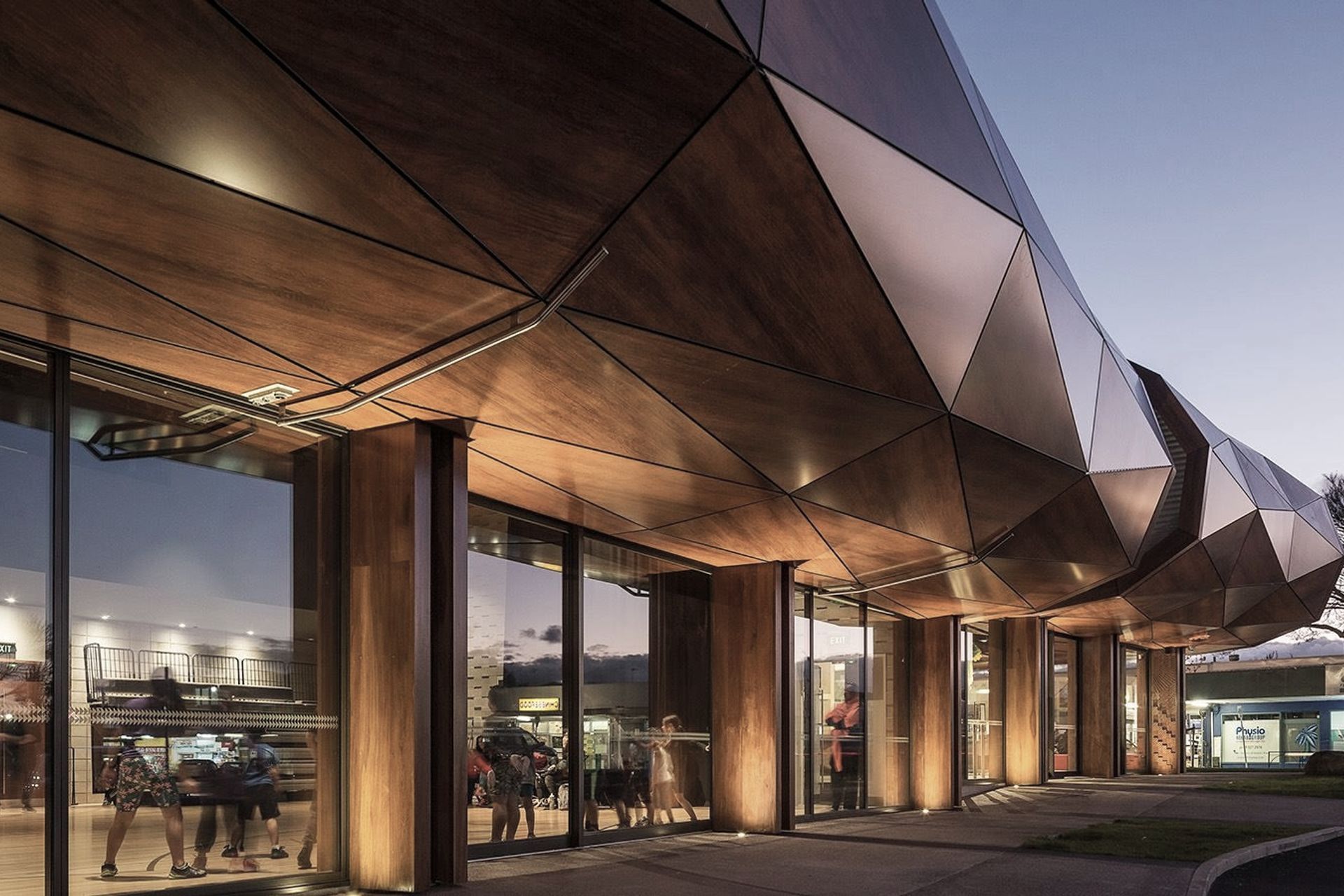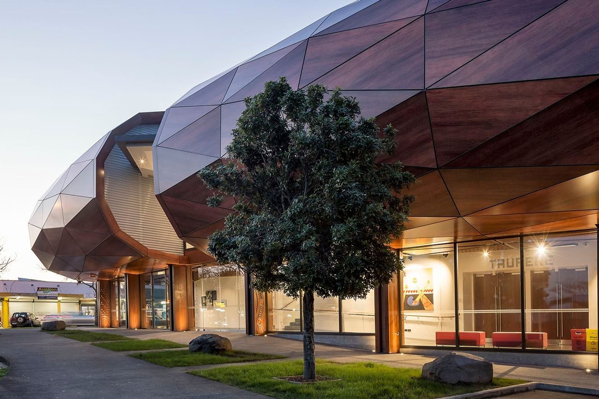 The design of the ceiling and skylights in the voids between the separate elements references a leaf canopy with light filtering through from above. The diamond patterns represent the idea of Pacific Island “binding”, unifying the disciplines of traditional and contemporary visual art, music and performance. The lower modular frame is defined by a grid of paired concrete columns, faced with timber blades (carved by local ethnic groups) and the superstructure is created by a series of LVL portal “ribs” enclosed in a facade of ACP, developed specifically for the project. The facade is faceted, as if “adzed” from a solid timber log.
