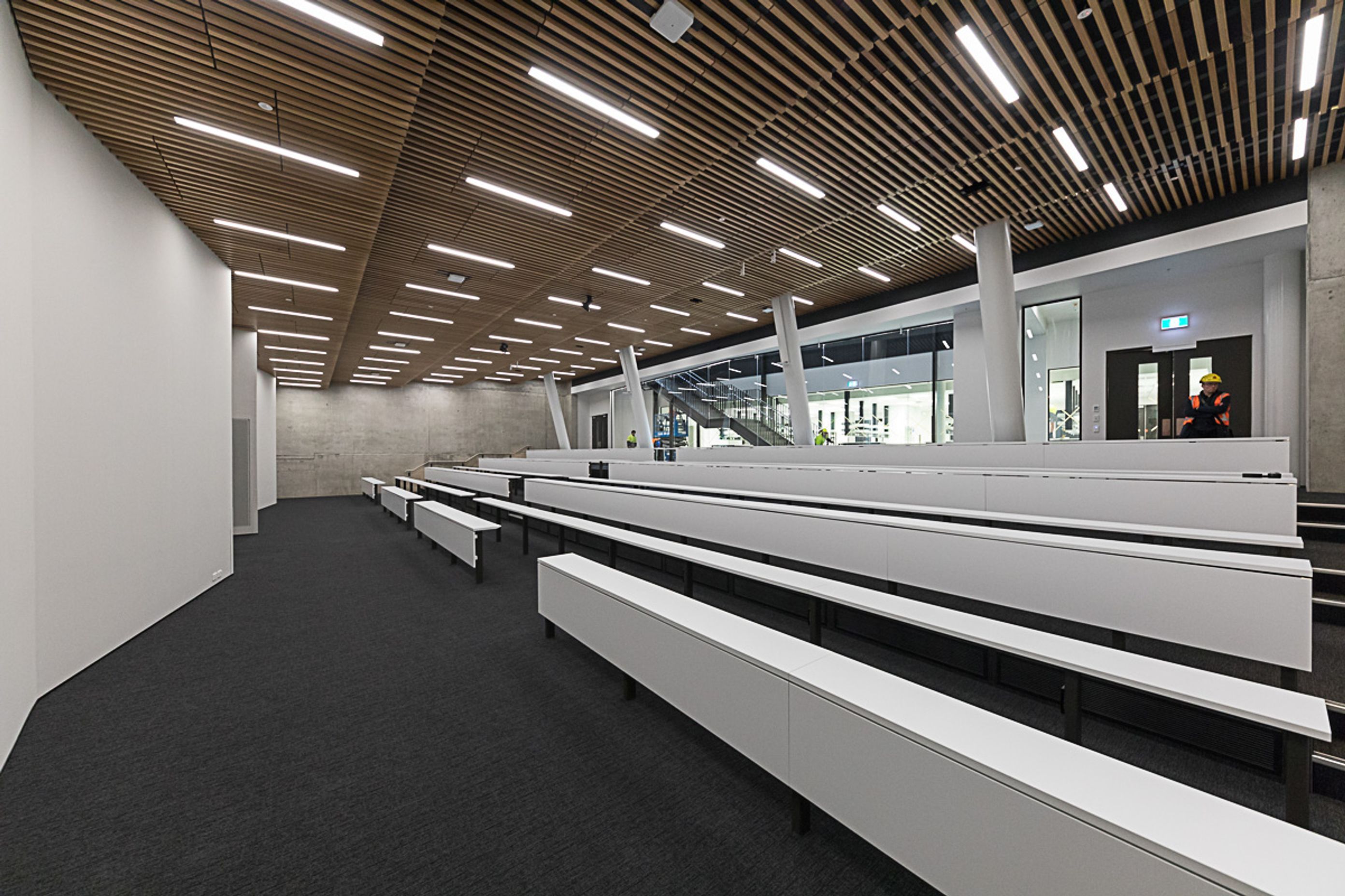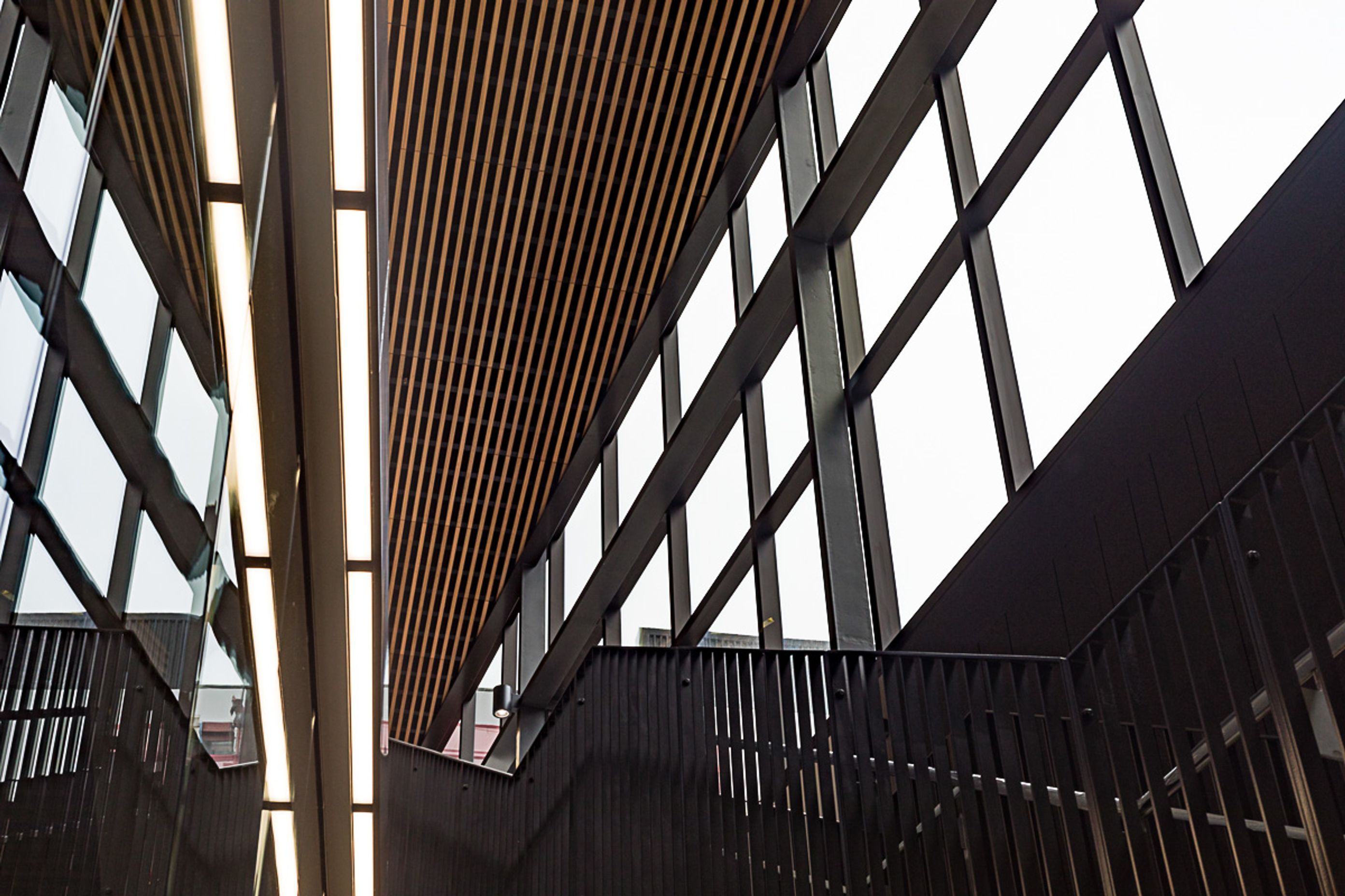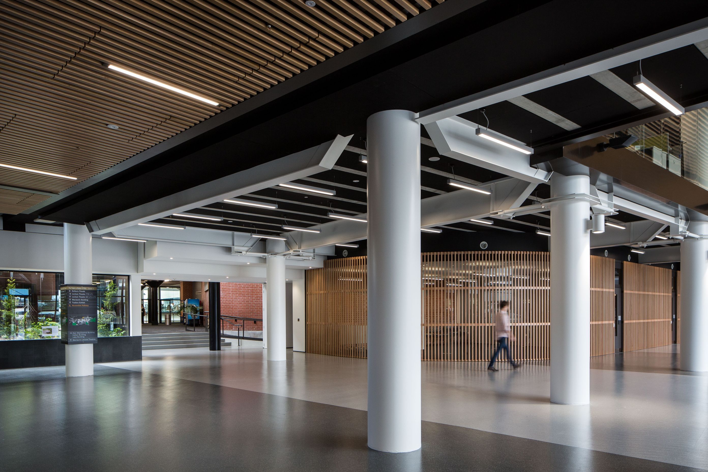 ArchiPro Project Summary - Te Toki a Rata Building, designed by Warren & Mahoney, features a striking façade with Décorslat made from 41mm timber battens and Tasmanian Ash veneer, complemented by a V41/68 perforation and a Decortech factory applied clear satin finish.