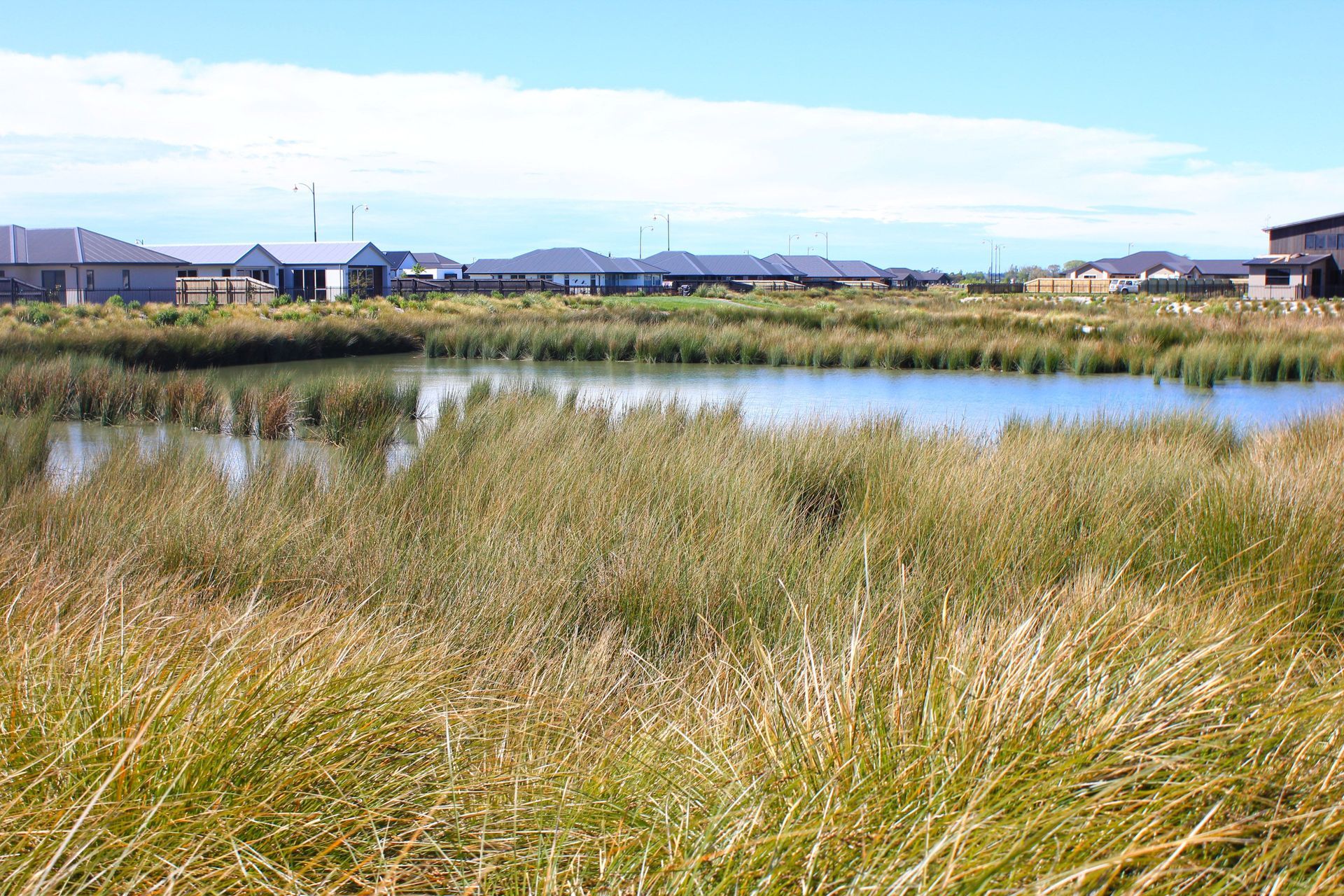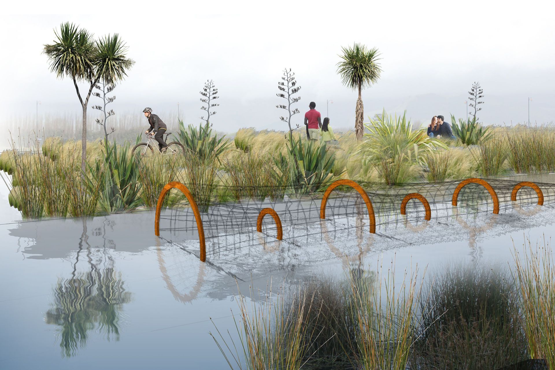 ArchiPro Project Summary - Te Whariki: A Ngai Tahu residential development featuring interconnected man-made wetlands, memorial gardens, recreation reserves, nature walks, and sculptural elements that celebrate the site's unique cultural history and ecological characteristics.