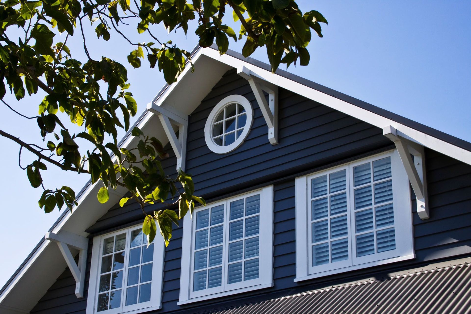 ArchiPro Project Summary - The Tebbutt House features modern design with large sash windows, stylish siding, and a contemporary roofline in a serene residential area.