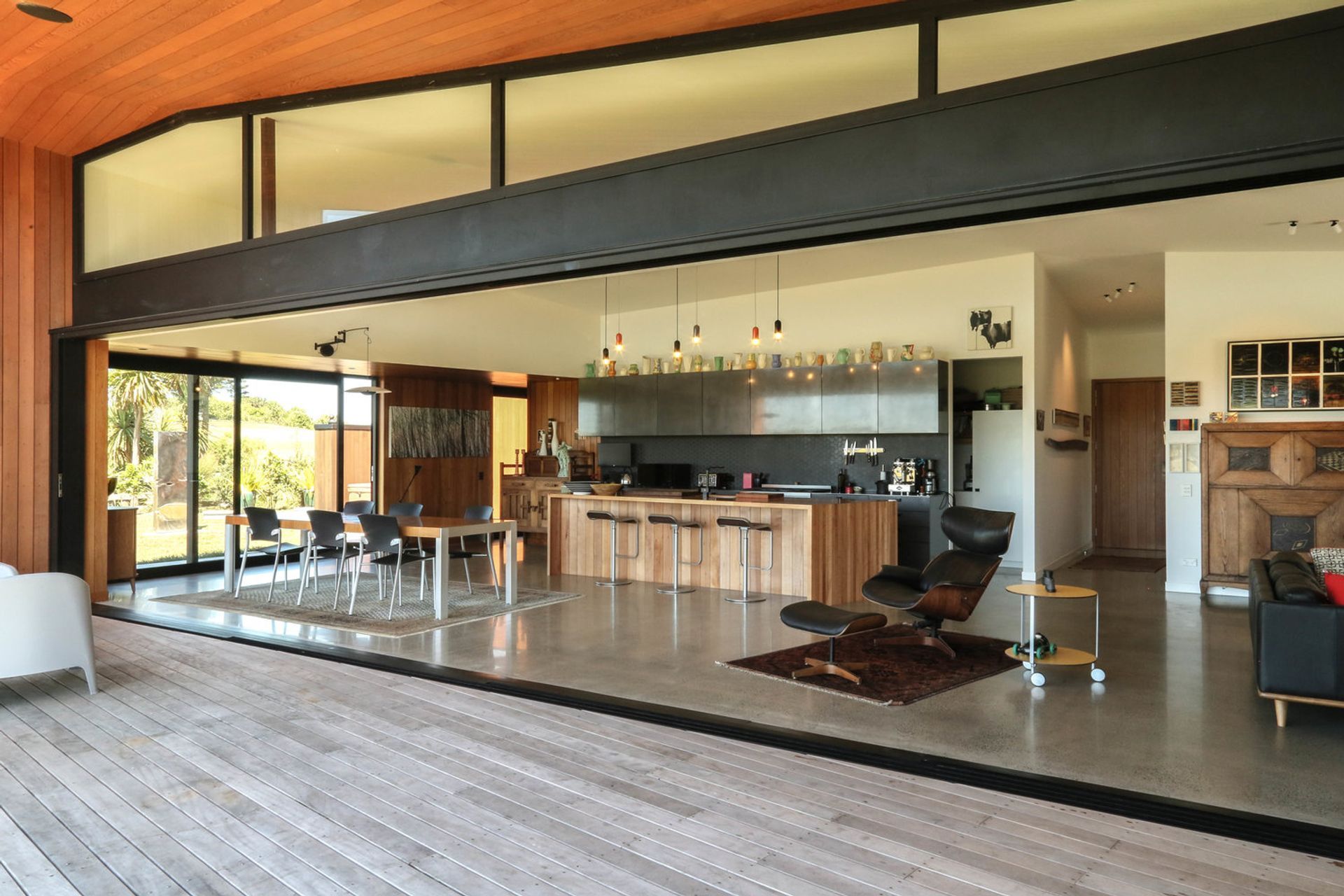 ArchiPro Project Summary - A light and airy coastal home in Mangawhai, featuring intersecting forms, durable materials, and expansive views, designed for both intimate living and larger gatherings.