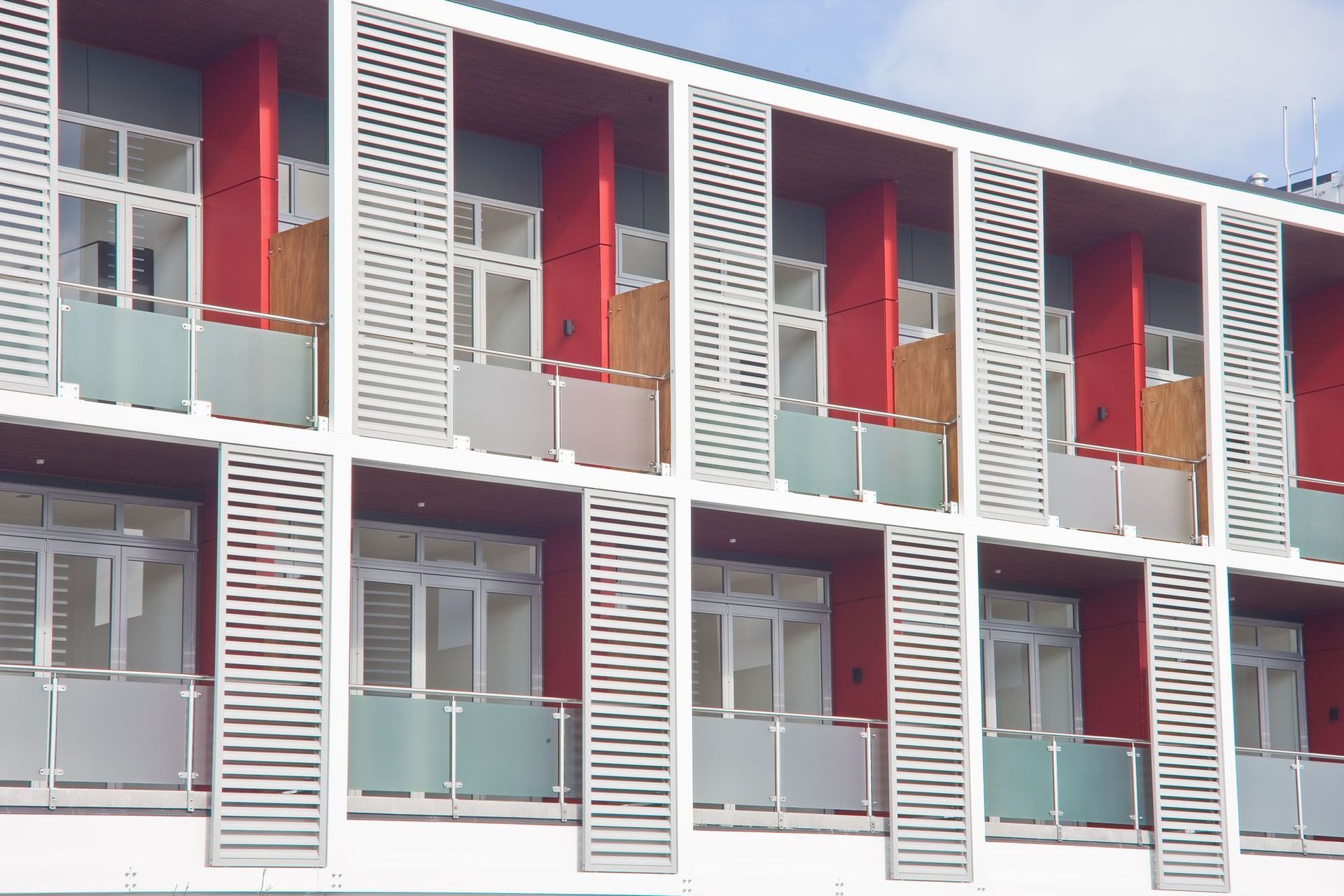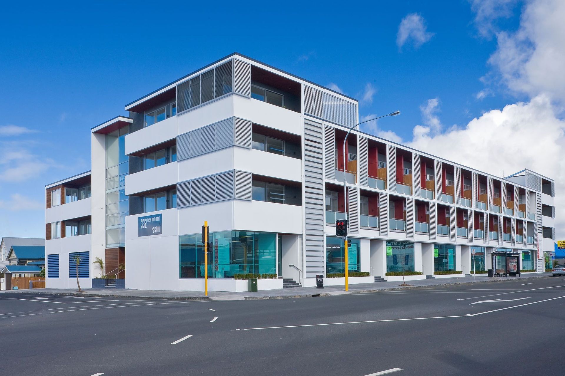 ArchiPro Project Summary - The Aston: A landmark 32-apartment development with over 1000m2 of commercial space, strategically located on the Great North Road ridgeline, offering stunning views of the Waitakere Ranges and Waitemata Harbour, and featuring a distinctive white façade with louvres.