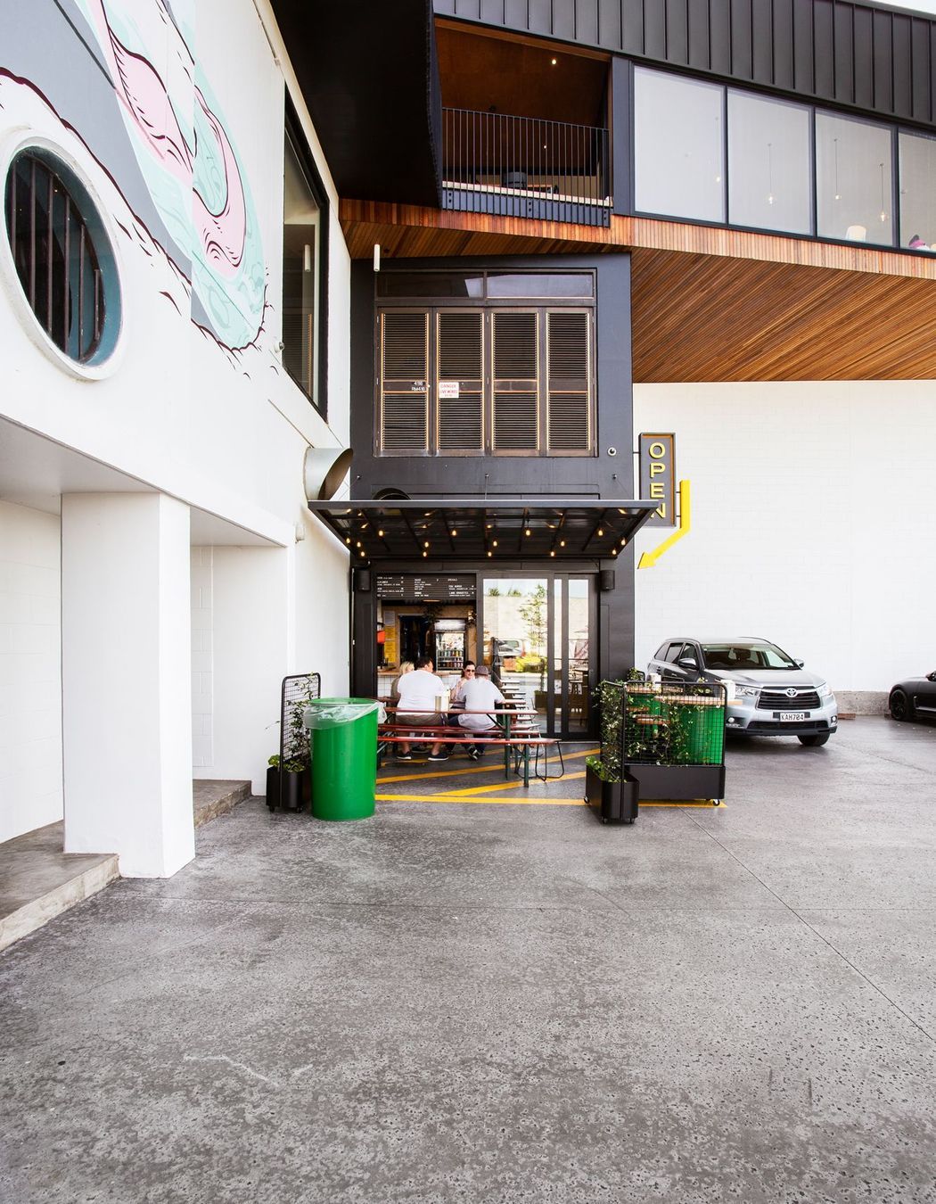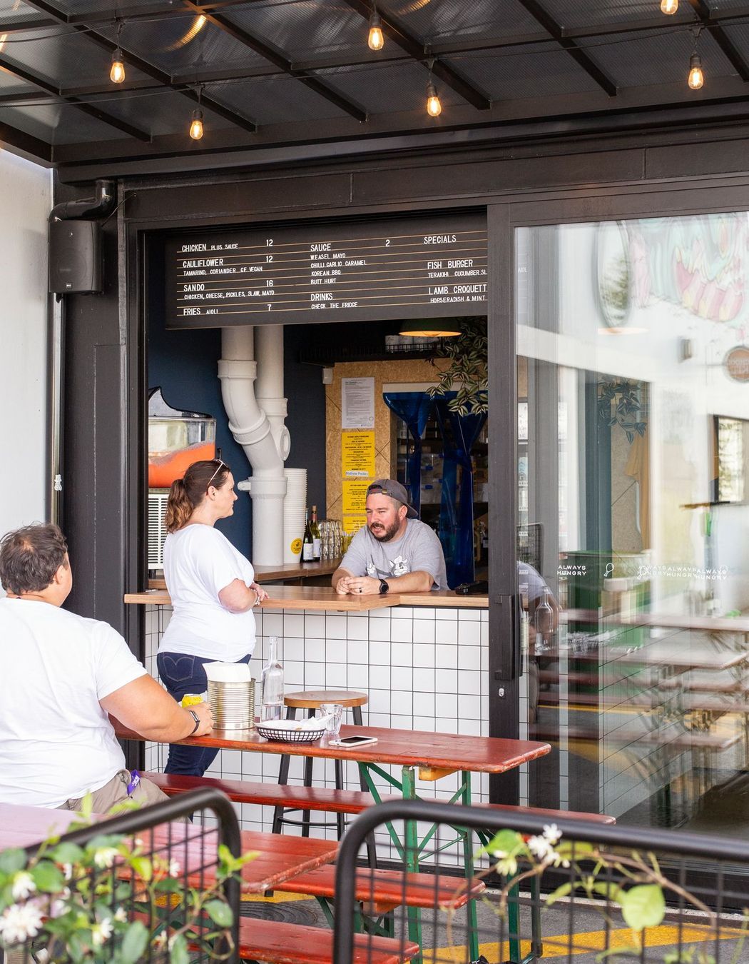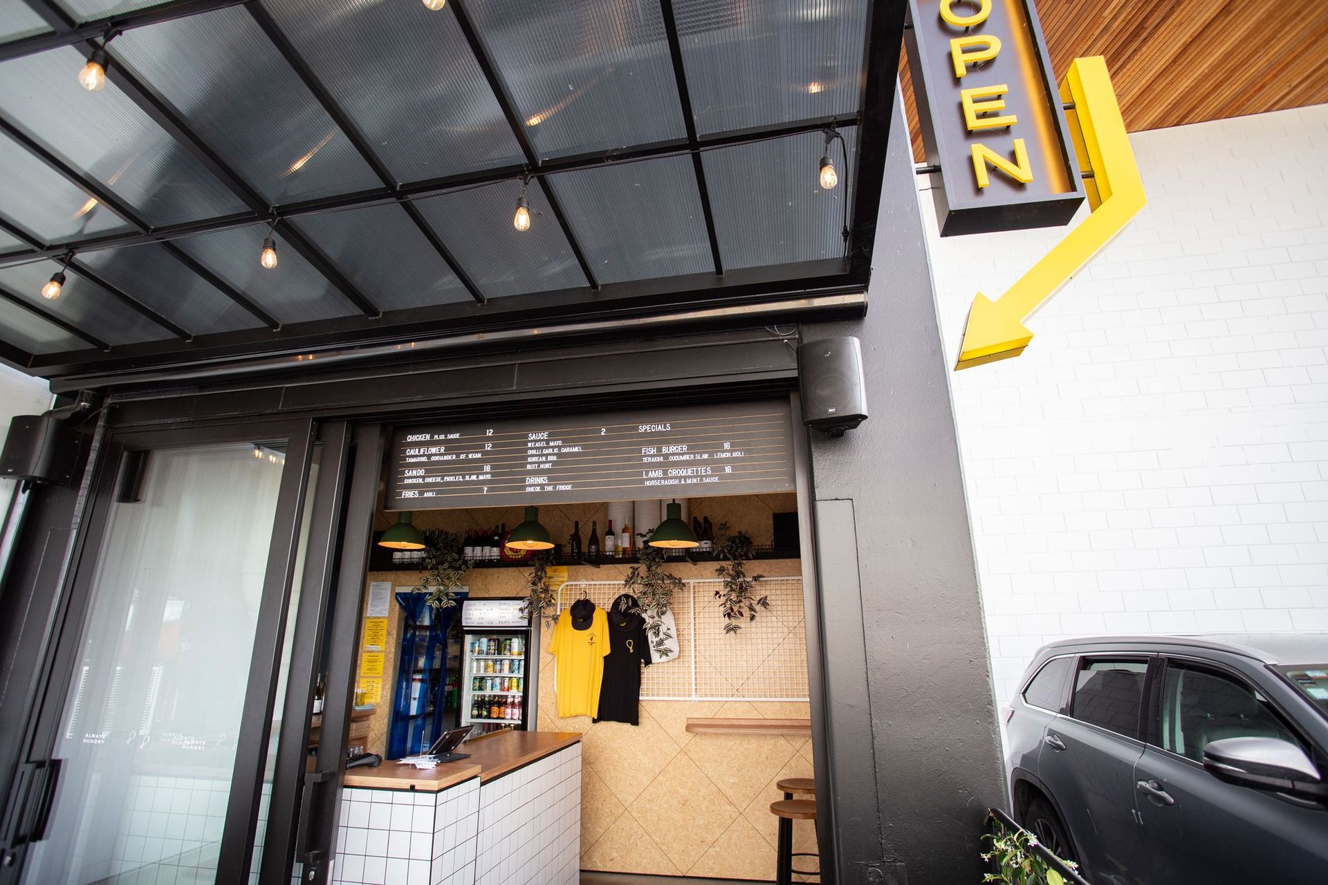 ArchiPro Project Summary - The Bearded Weasel transforms an old loading dock into a vibrant hole-in-the-wall fried chicken shop, featuring a custom canopy, mobile planters, and versatile sliding menu boards, all within a clever 18m2 design.