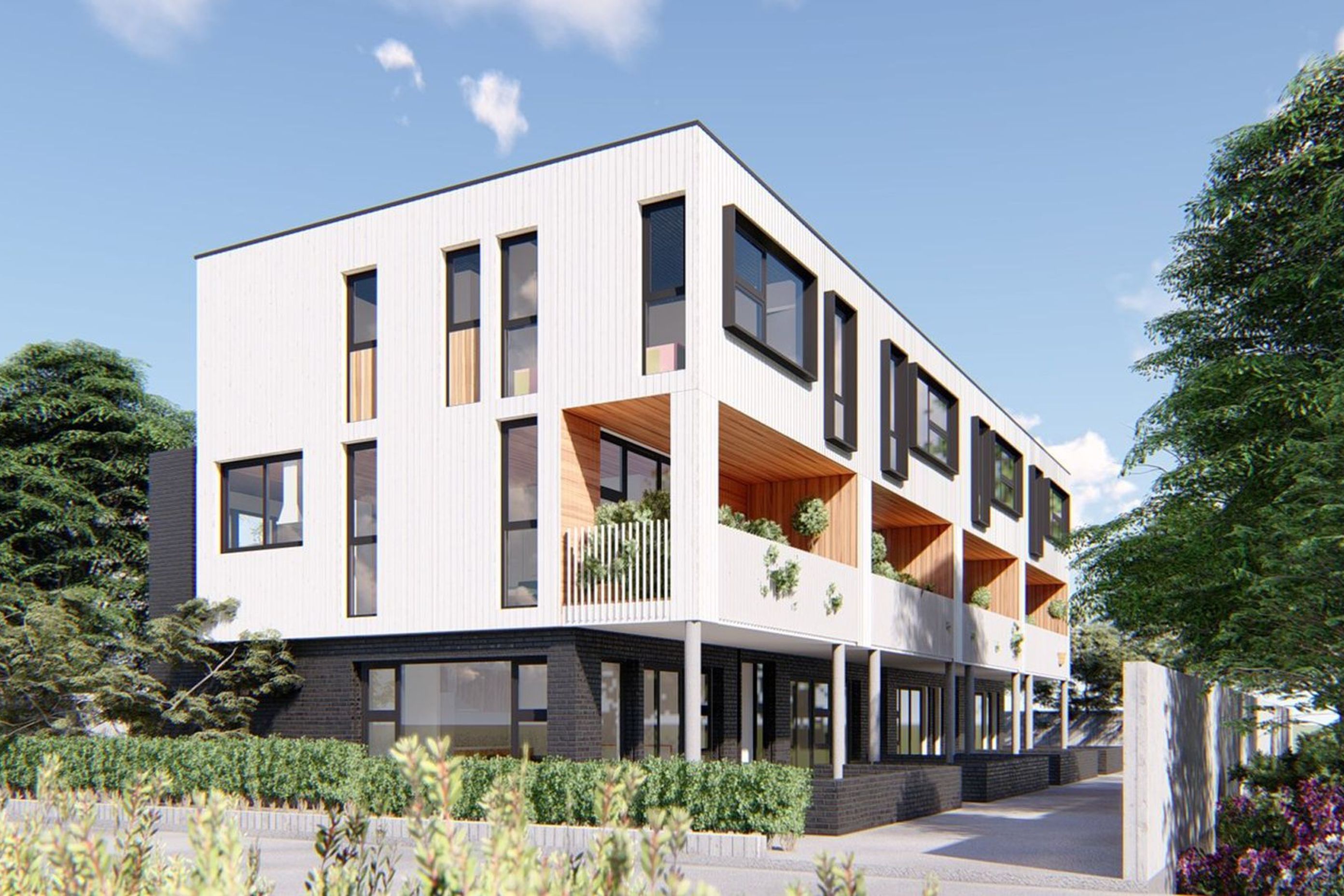 ArchiPro Project Summary - Prototype design for a three-level building featuring a ground floor apartment and two-level walk-up apartments, maximizing gross allowable floor areas with conveniently located remote car parking in West Auckland.