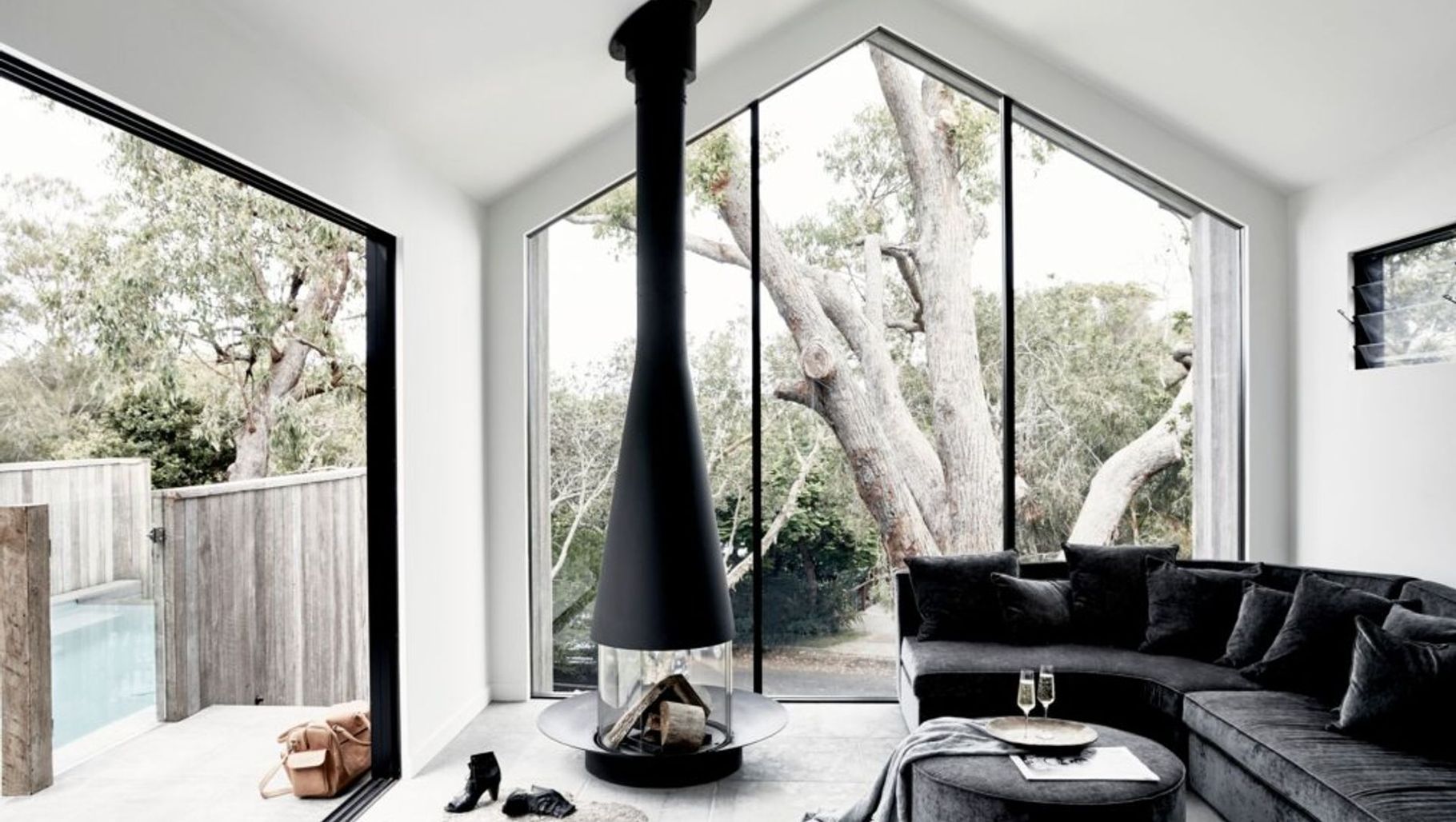 ArchiPro Project Summary - The Cabin: A luxurious treetop hideaway in Byron Bay, designed by Taliah Lowry, featuring natural finishes and a stunning Filiofocus fireplace, seamlessly blending indoor and outdoor living.