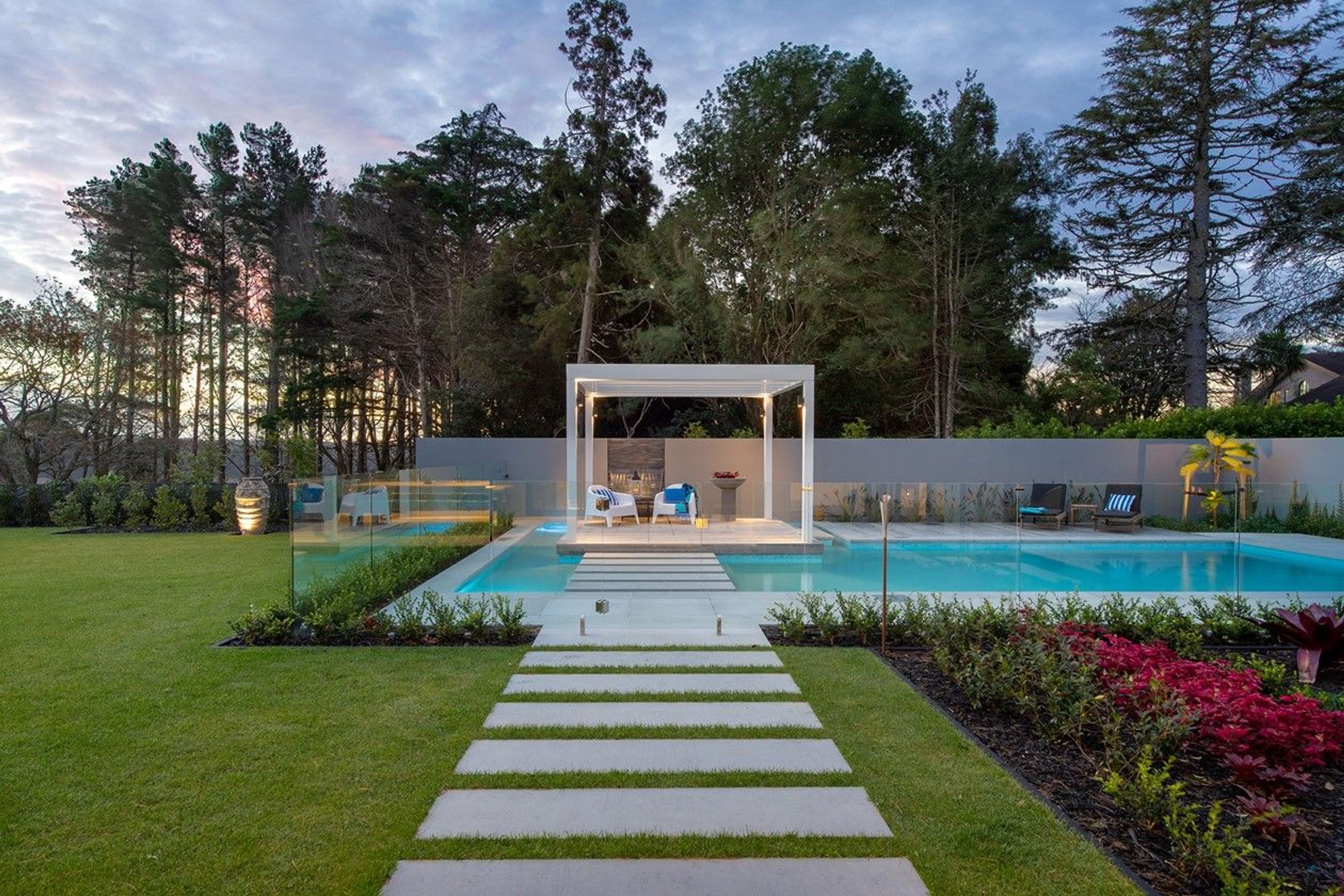 ArchiPro Project Summary - Award-winning pavilion-style home featuring five bedrooms, four bathrooms, and expansive living spaces, set on a stunning nine-acre site north of Auckland, designed for both family living and entertaining.