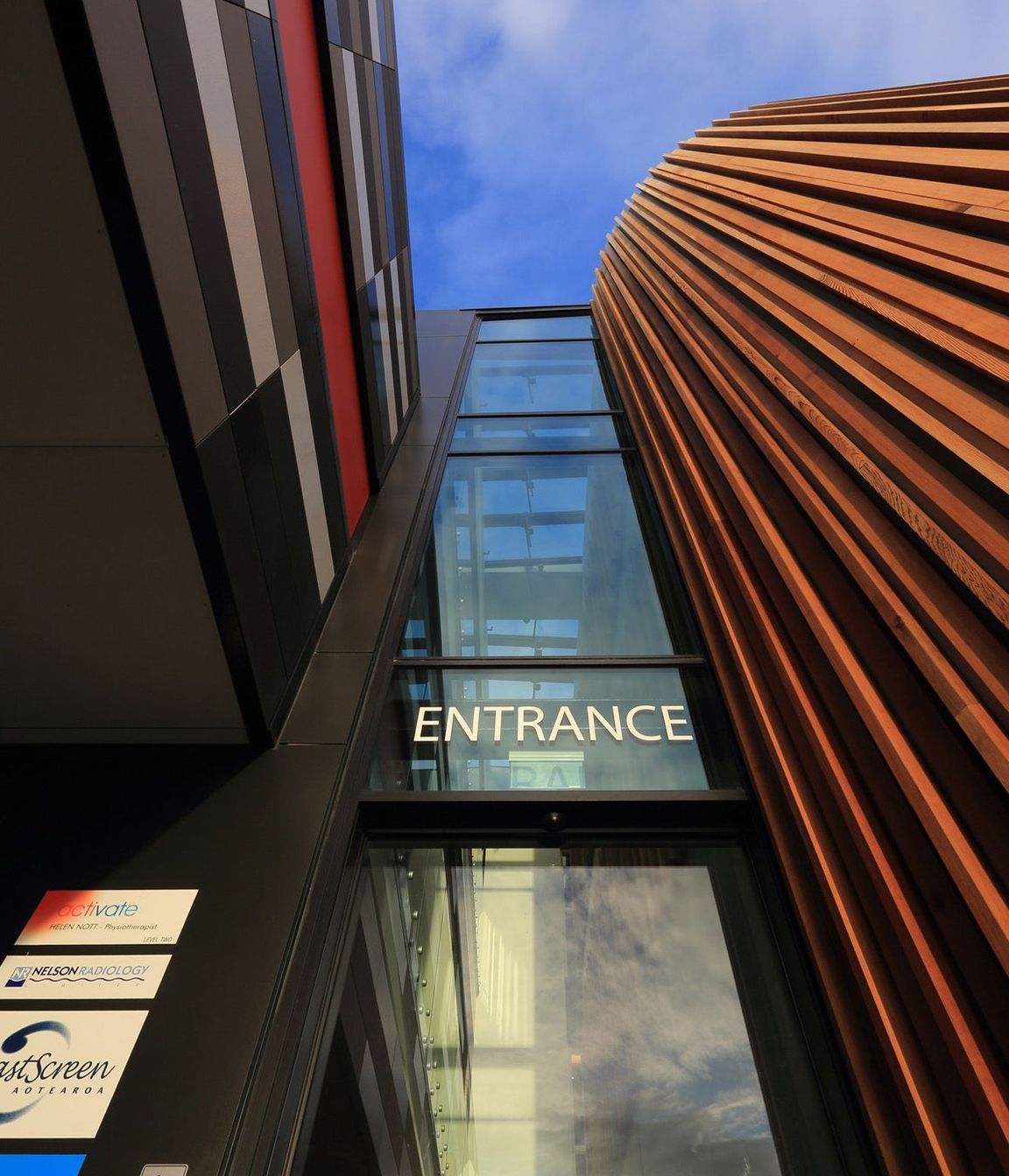 ArchiPro Project Summary - A modern three-storey medical centre in Nelson, featuring 3300m² of space, 28 on-site carparks, and a design inspired by DNA strands, ensuring sustainability, comfort, and efficient circulation for co-located medical practitioners.
